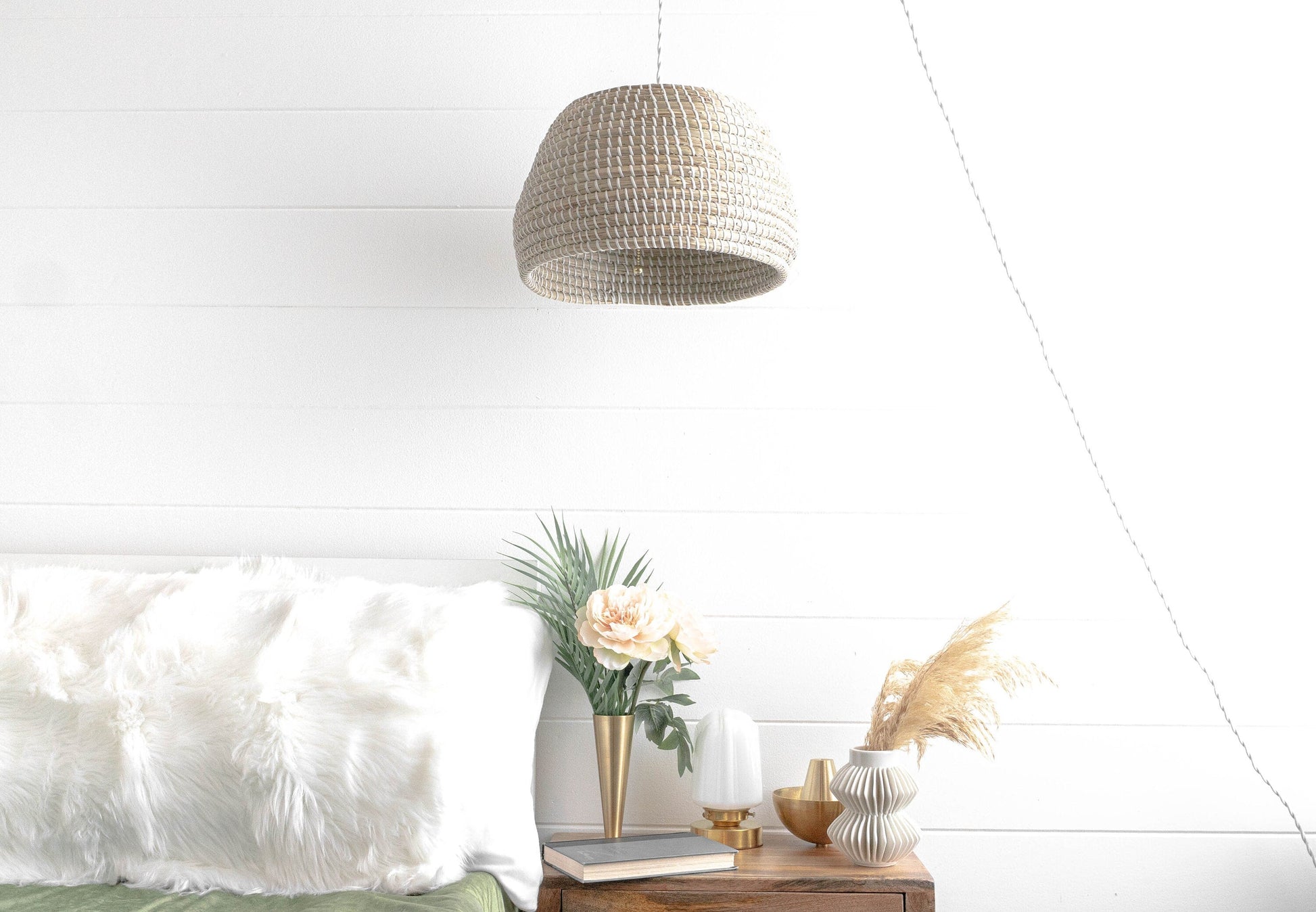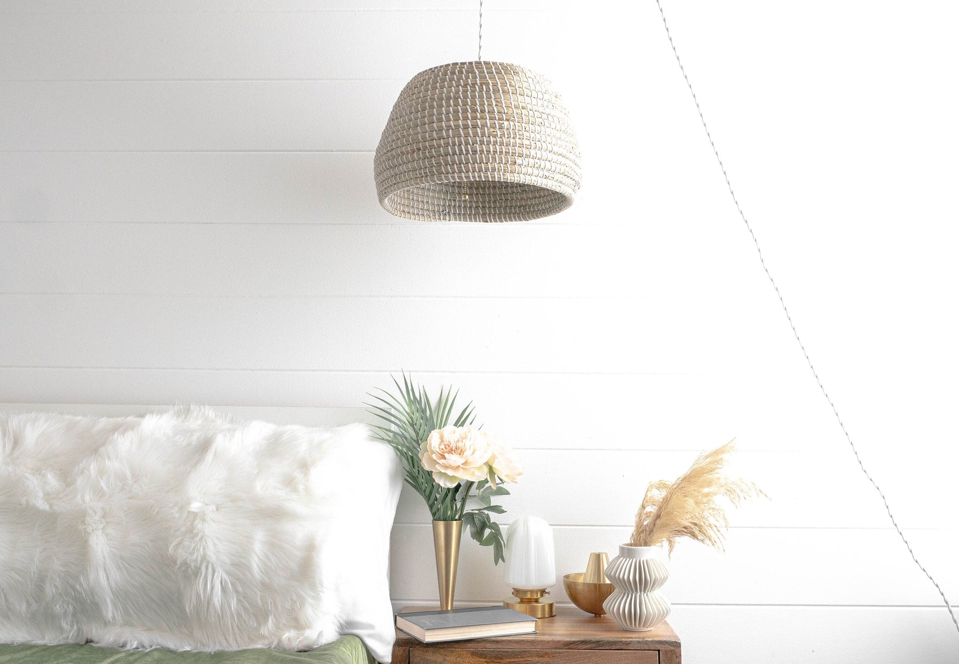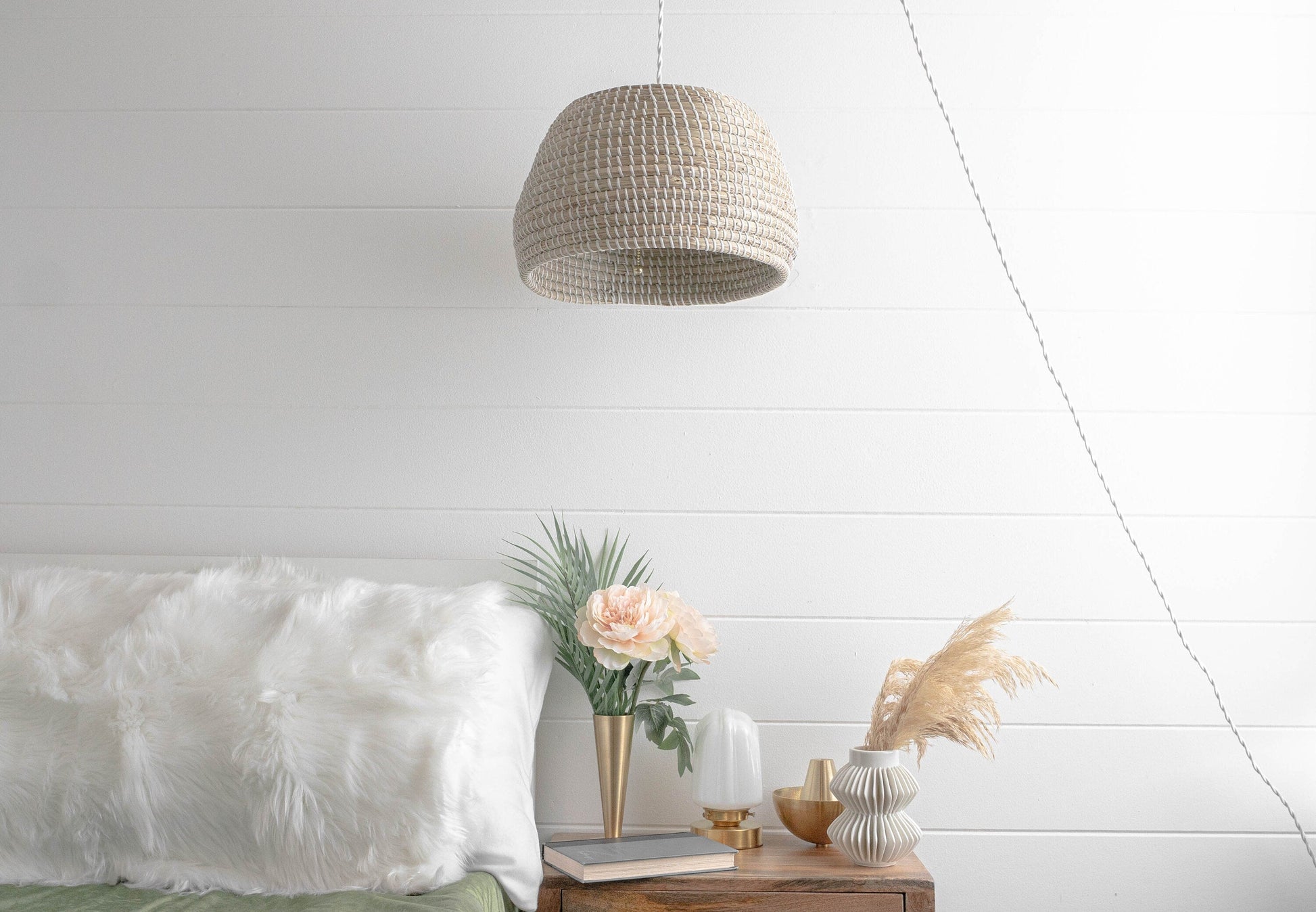 This natural boho, 1 bulb swag pendant, features a basket that is handmade and may vary slightly in shape and size. This fixture also comes with two white hooks for hanging and 12ft of cord.
