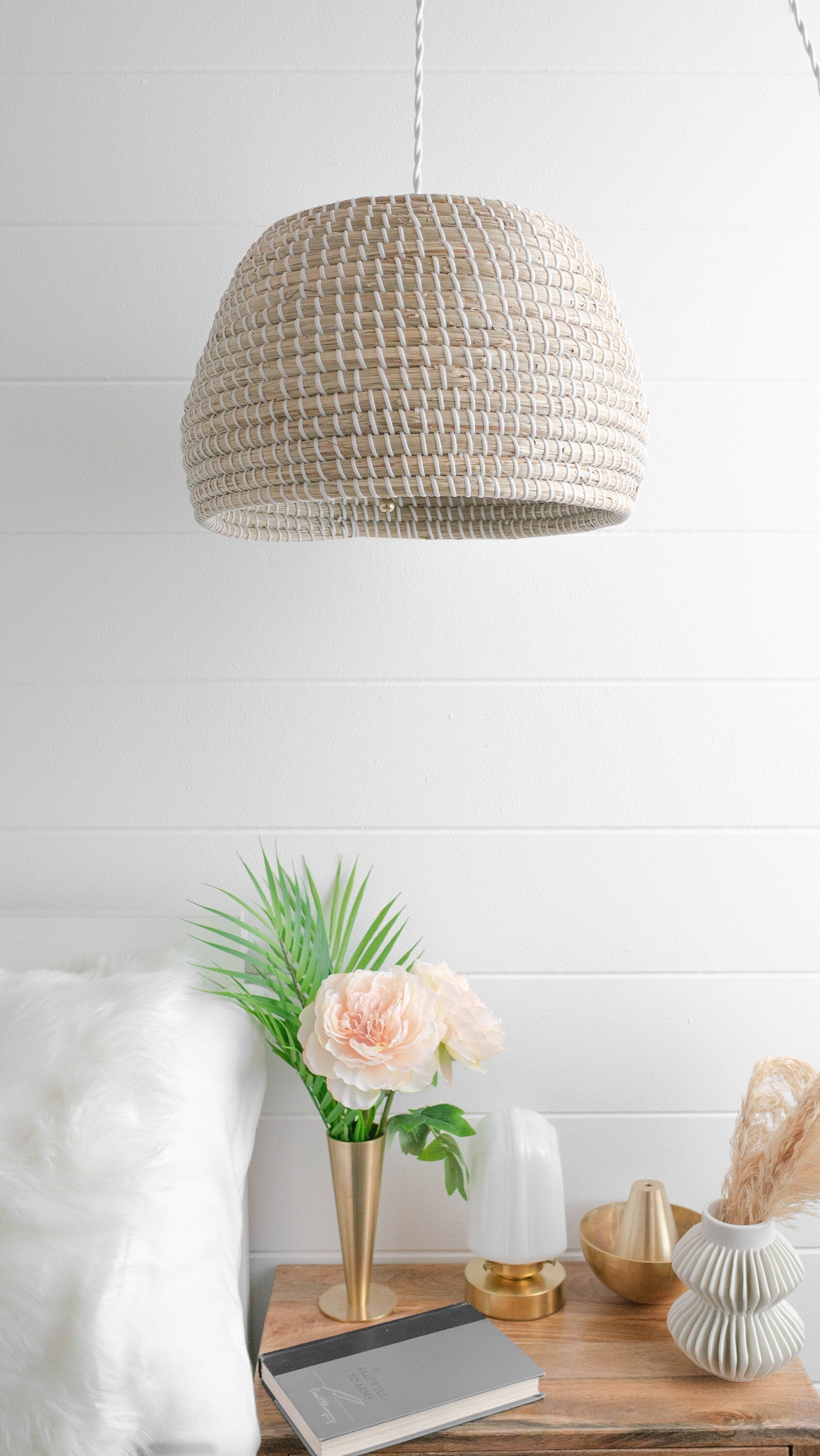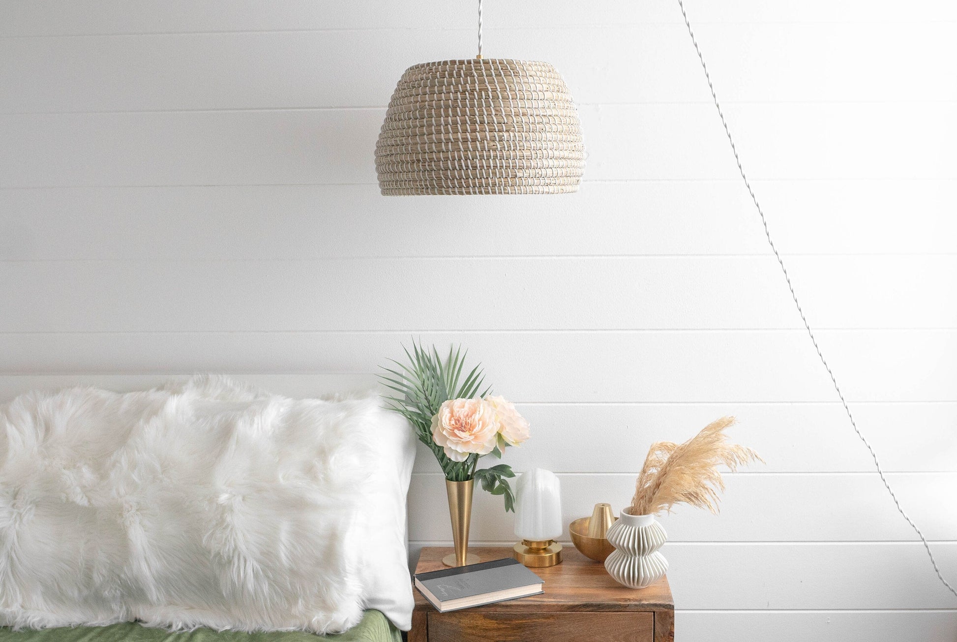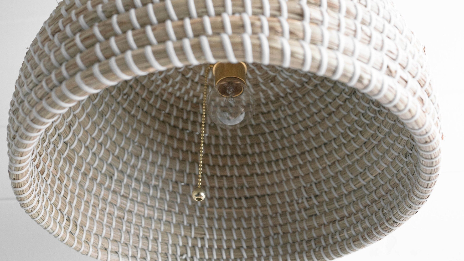 This natural boho, 1 bulb swag pendant, features a basket that is handmade and may vary slightly in shape and size. This fixture also comes with two white hooks for hanging and 12ft of cord.