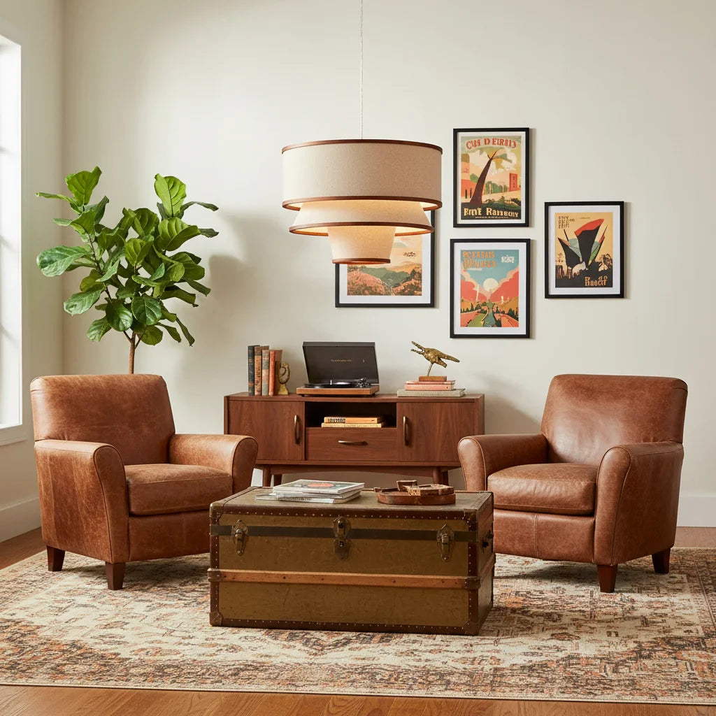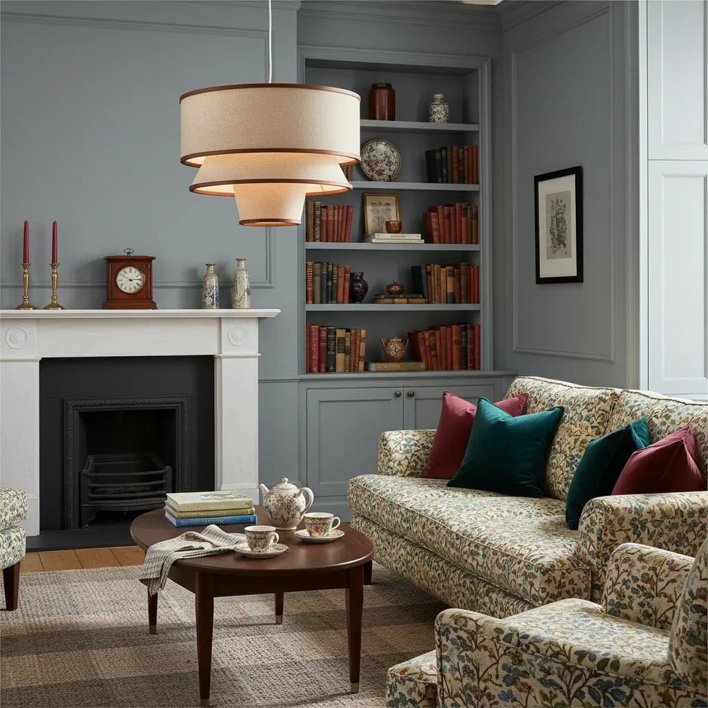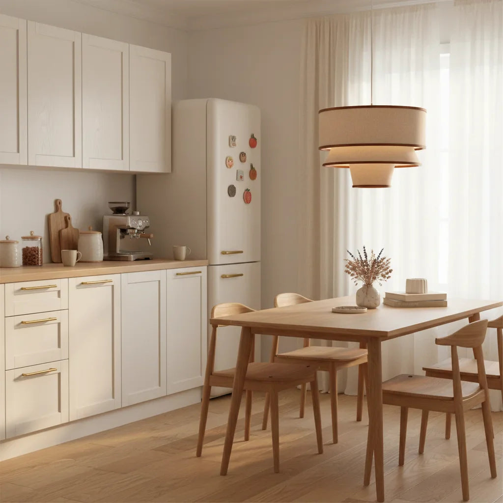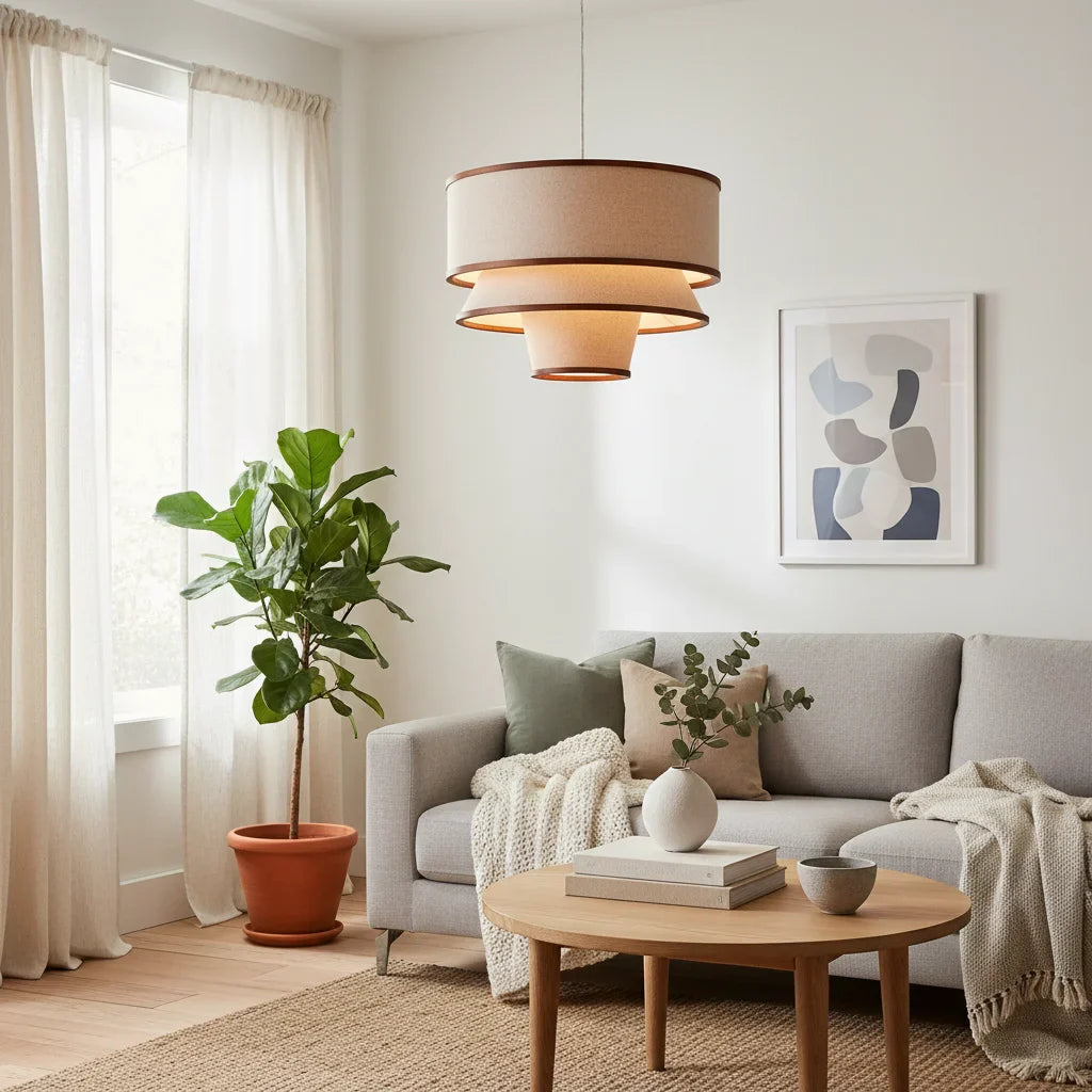 The natural linen shade softens the light output. It creates a cozy, inviting atmosphere that works well in living rooms or dining areas.