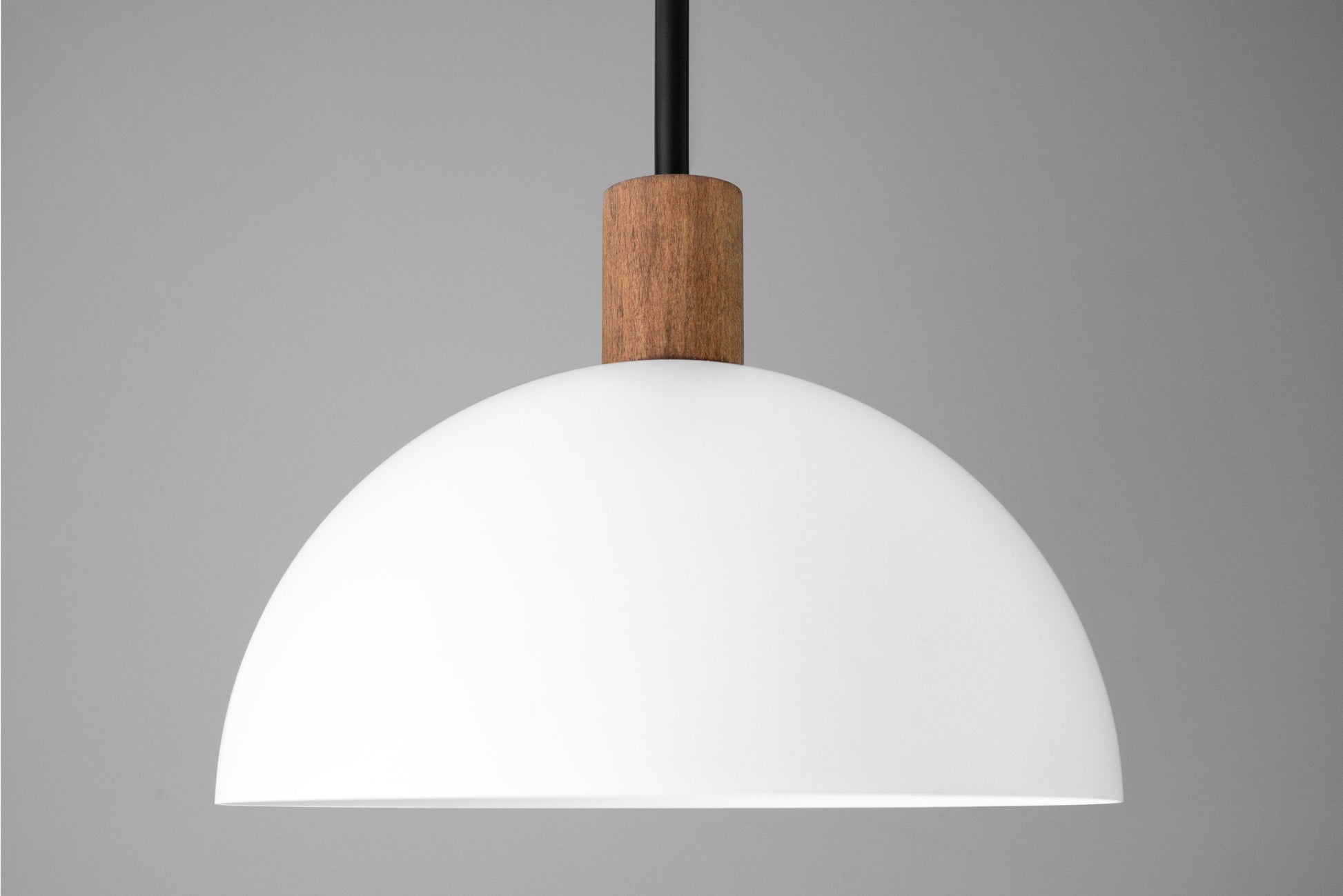 This Scandinavian style 2 bulb pendant light fixture features a 12" matte white finish dome shade simplistically accented with light natural beechwood or dark oak finished wood.