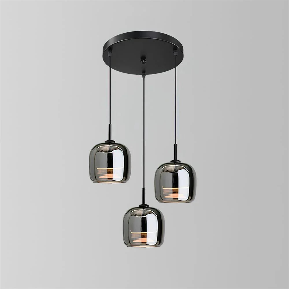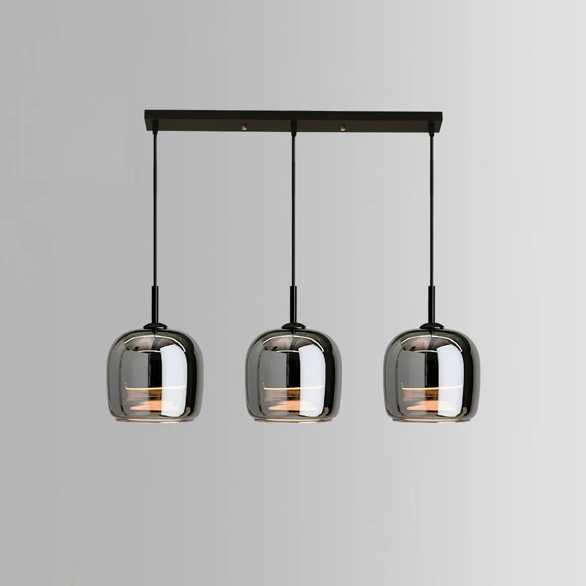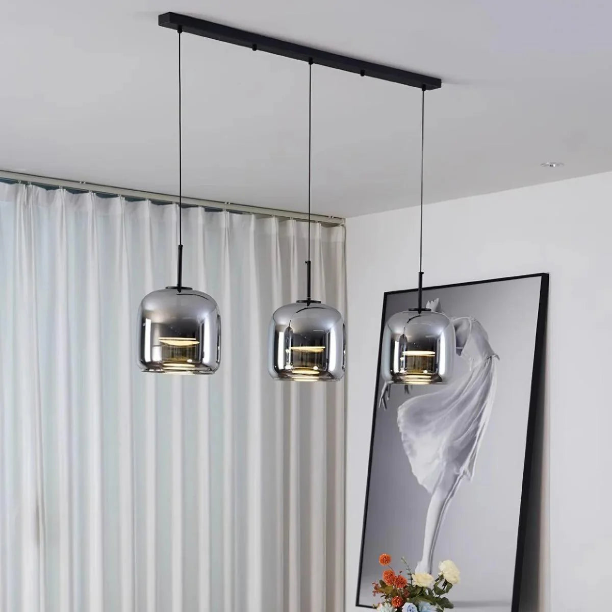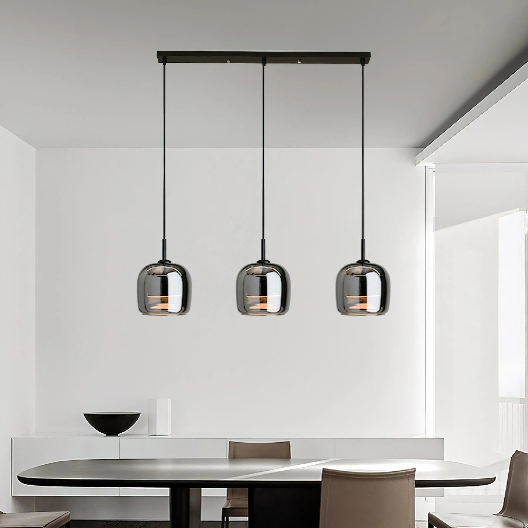 Combining sleek metal framing with hand-blown smoky glass shades, this pendant light creates a striking focal point for modern interiors. The adjustable cord makes it ideal over dining tables, kitchens, or bedrooms with modern flair.