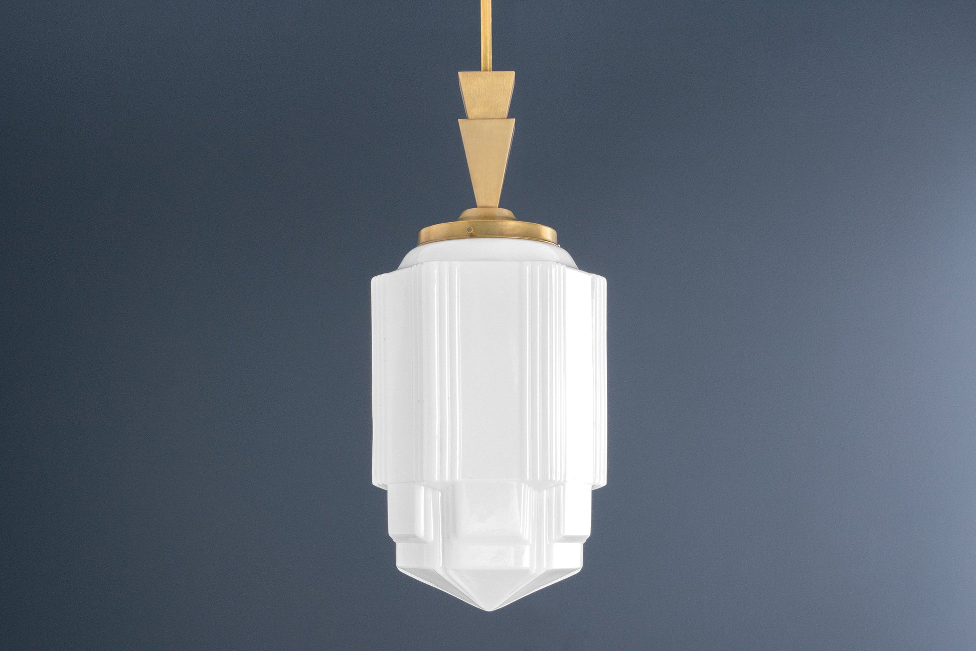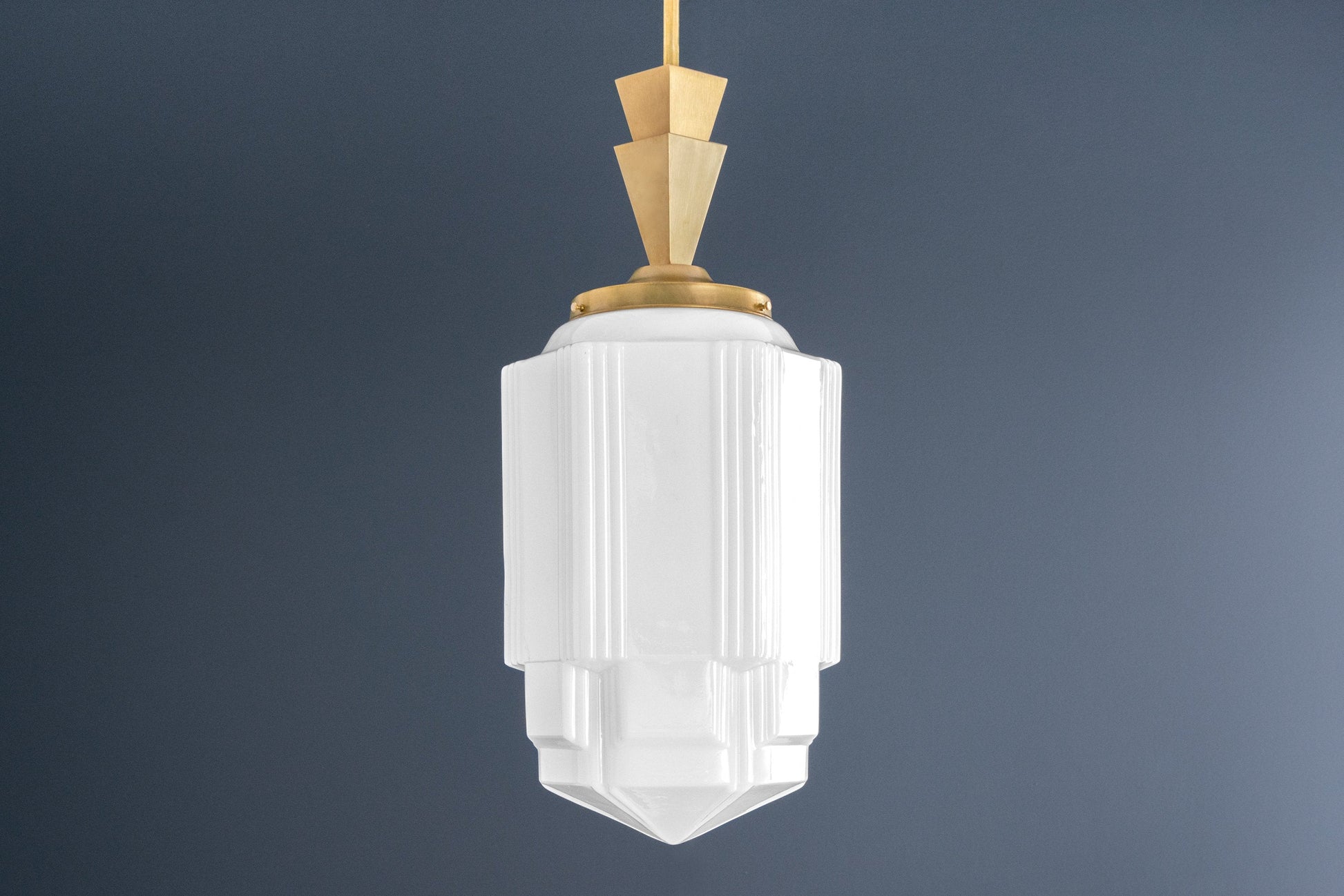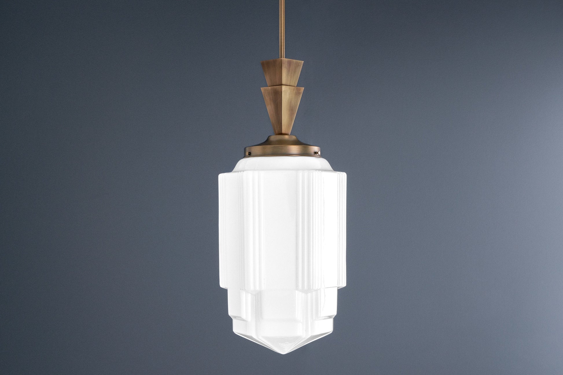 This dramatic Art Deco pendant light fixture features a decorative geometric cast brass embellishment to complement its large skyscraper globe. This vintage shade design is constructed of thick white opal milk glass and was handblown in an American glass foundry using the original 1930s glass mold.