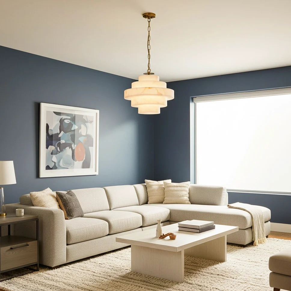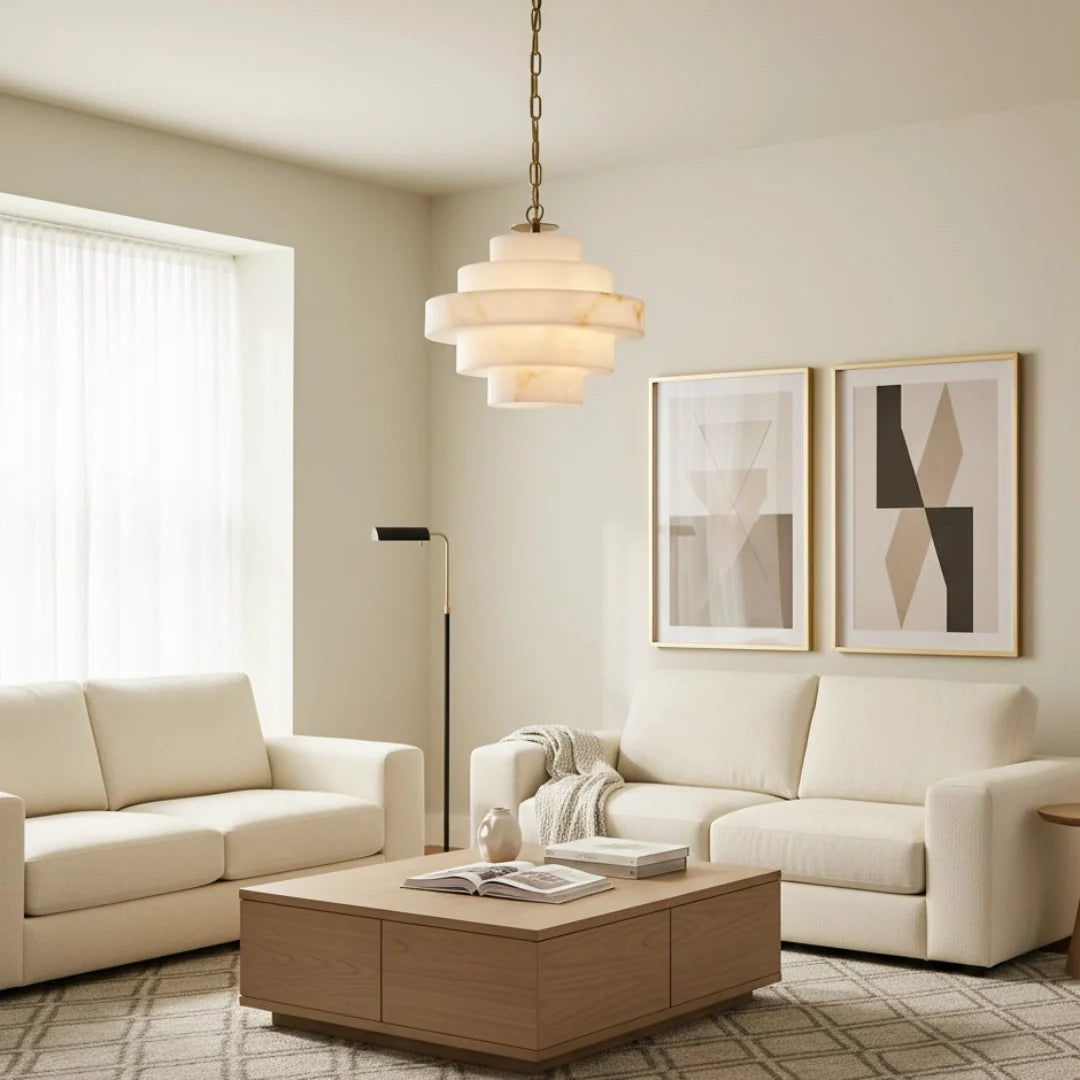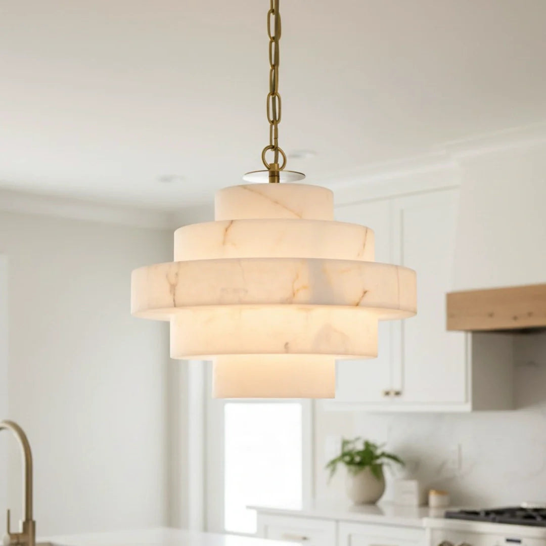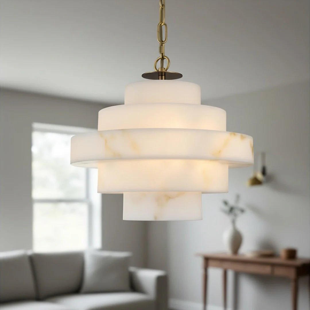 This chandelier features a clean-lined, multi-layered alabaster shade, its balanced silhouette embodies the essence of modern style. It creates a warm and inviting atmosphere, making it perfect for hanging in living rooms or dining areas.