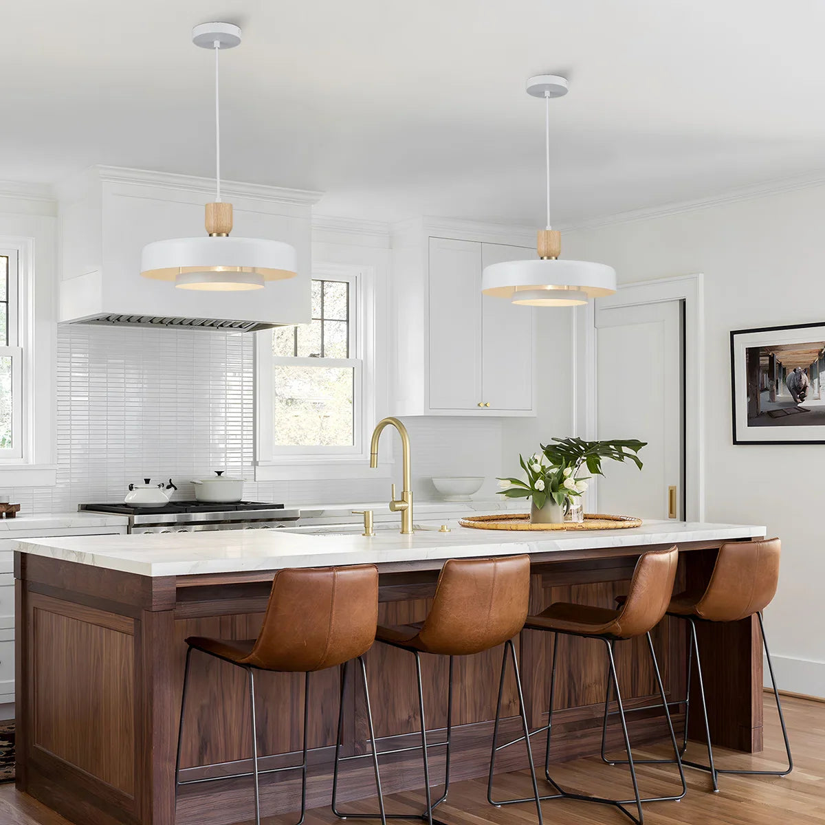 Bring warm, modern light to your home with the Maren Pendant Light. Featuring a sleek metal frame with a soft white finish and refined wood accents, it lends subtle Scandinavian style to dining areas, kitchens, and reading nooks.