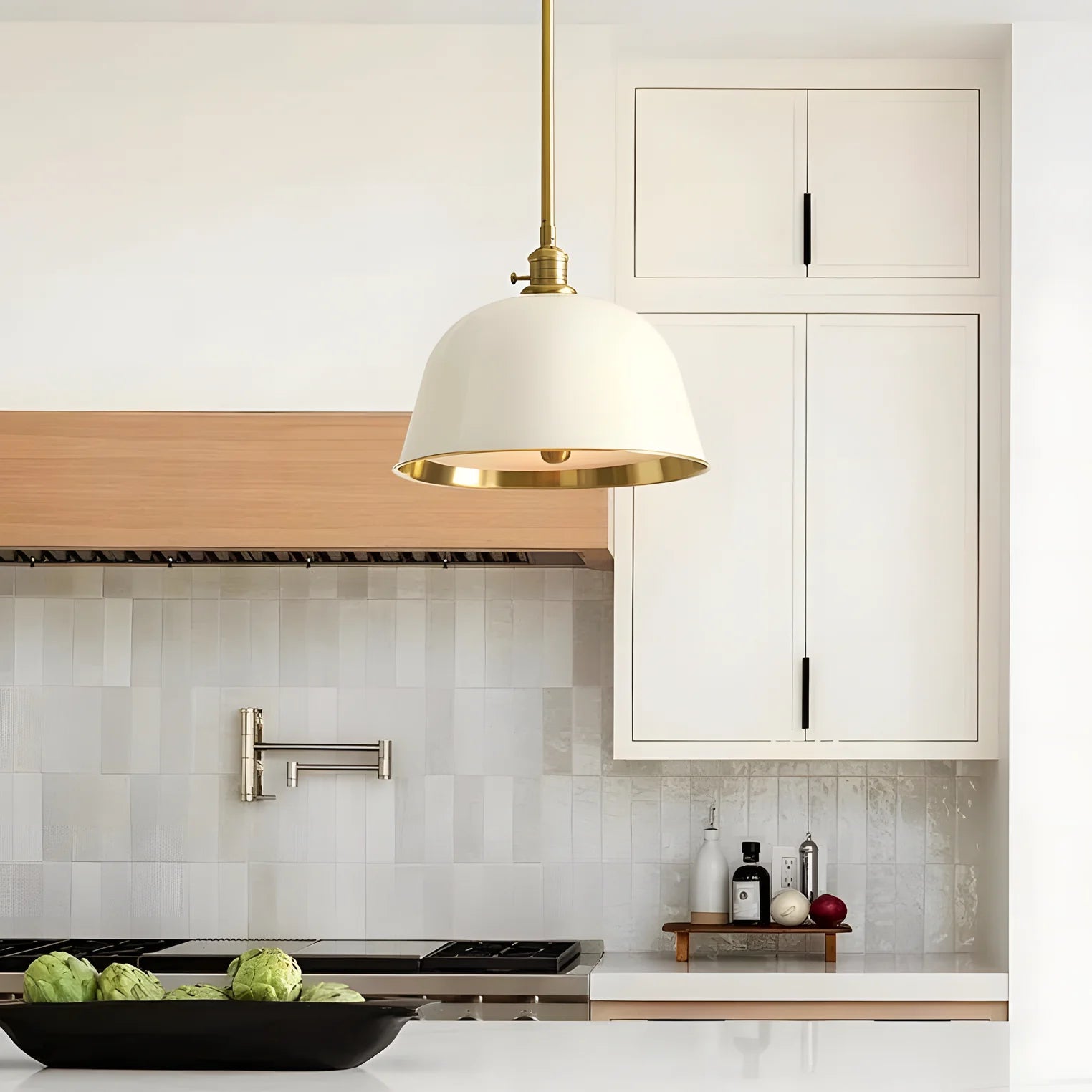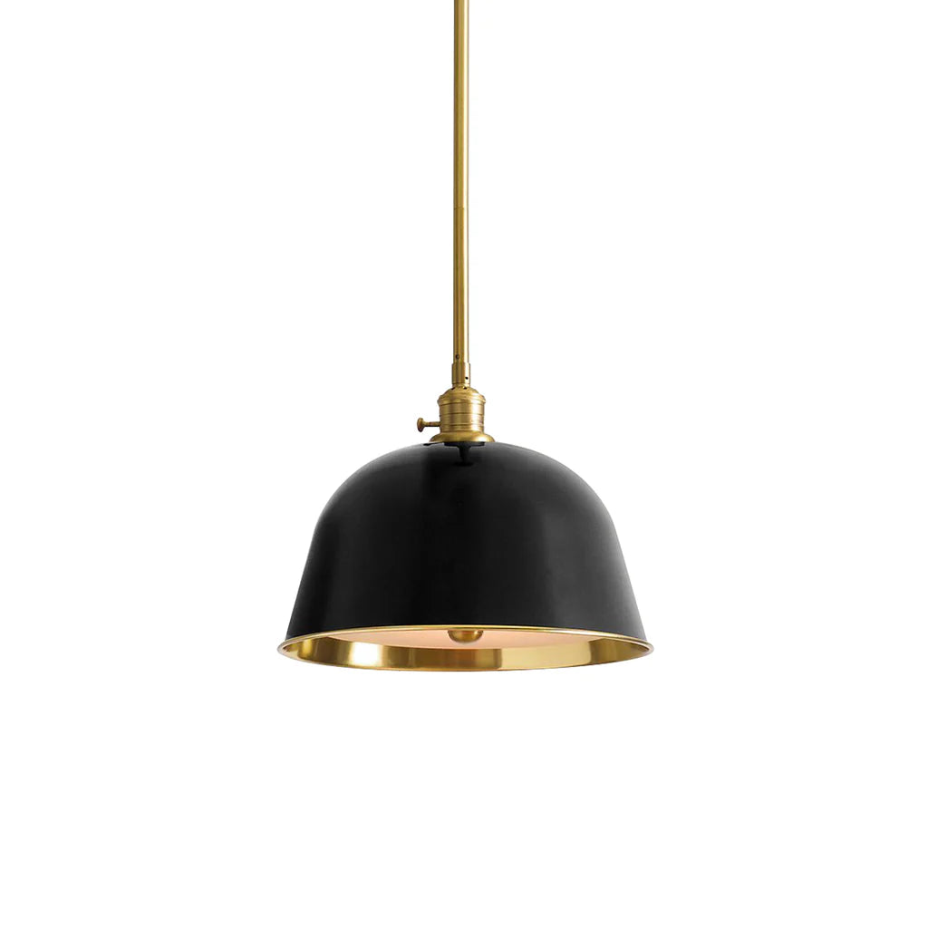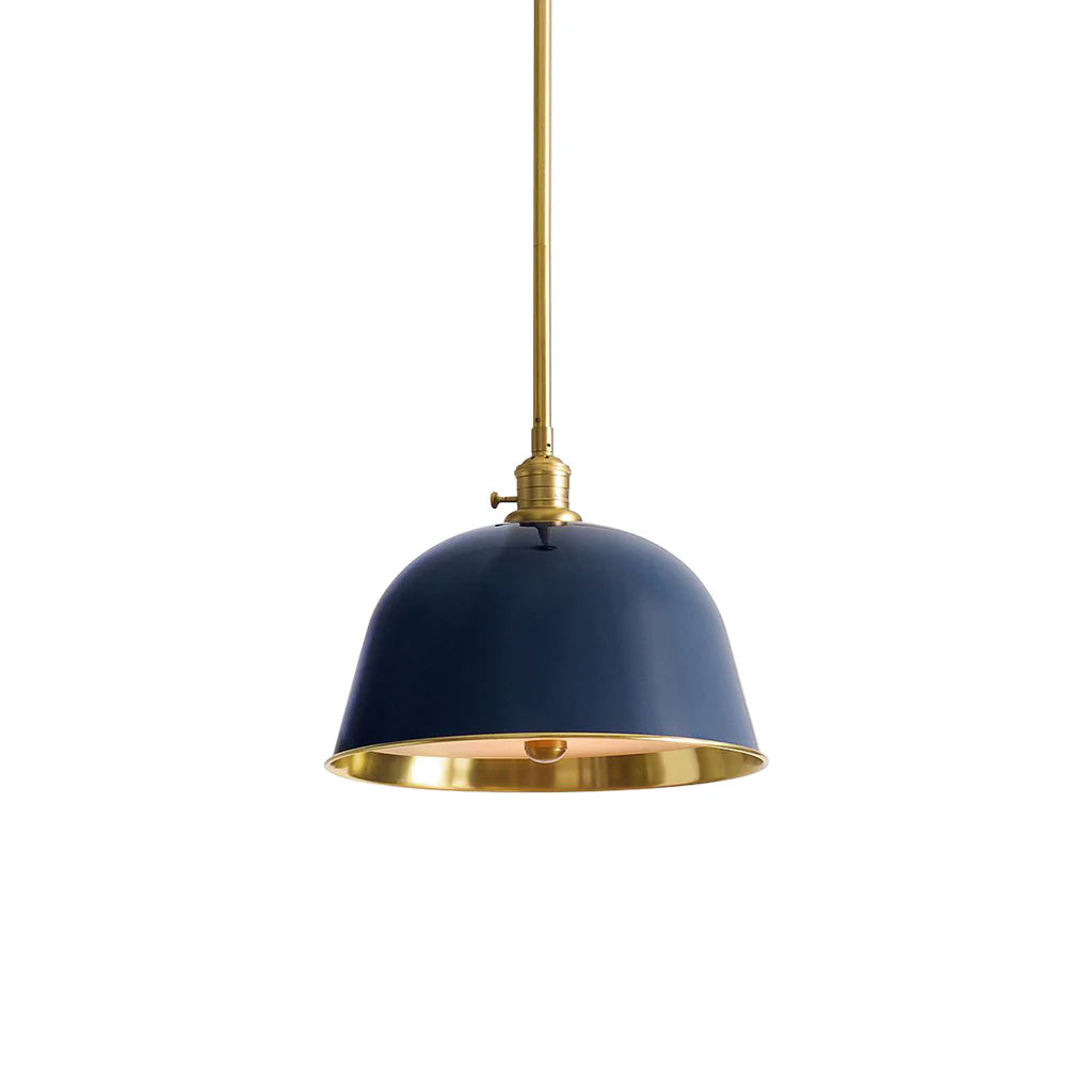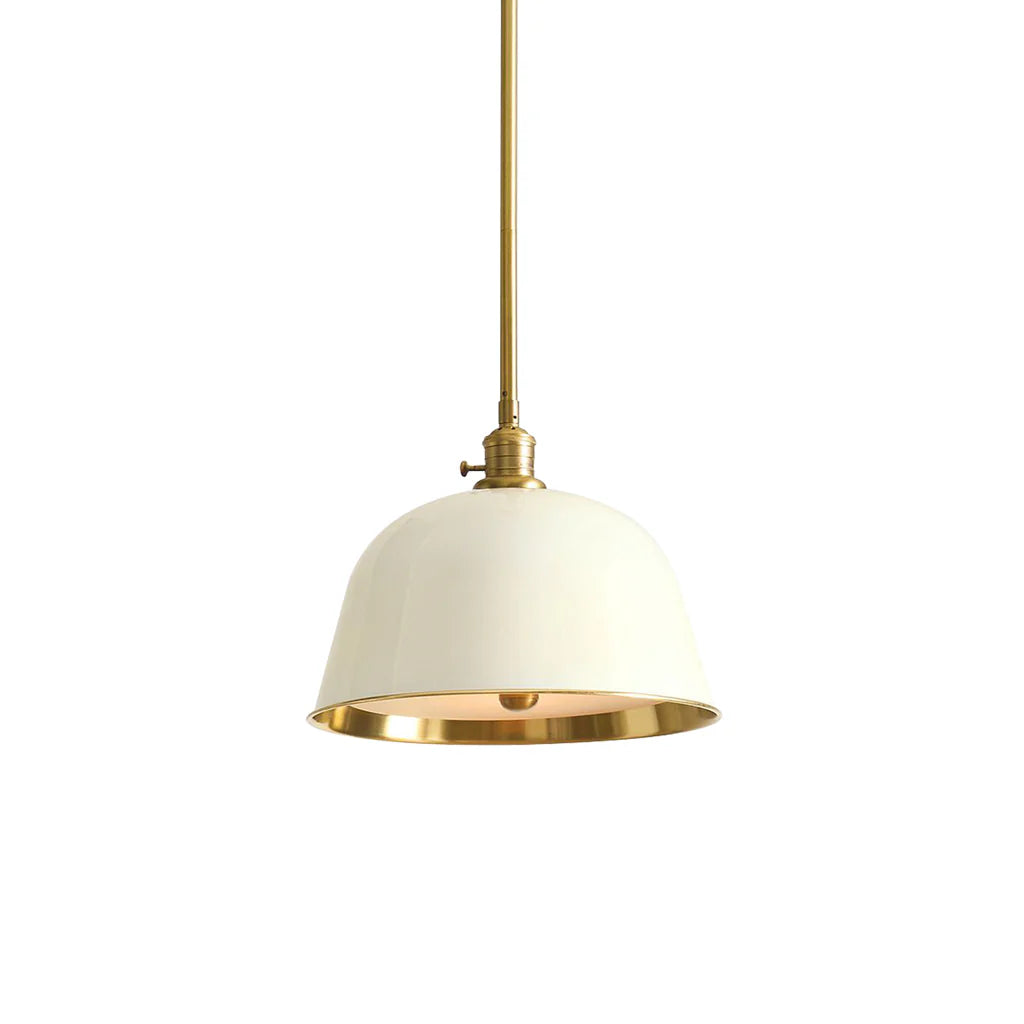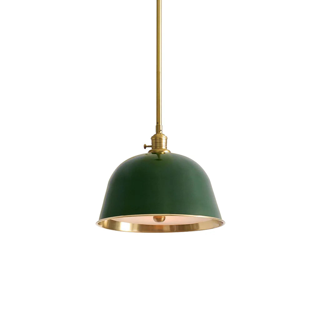It has a timeless, simple look, but this collection is full of details and function. Inspired by vintage industrial style, the bell-shaped hood comes in deep enamel finishes, adding light and color. The frosted glass diffuser with brass accents lets you adjust the brightness, and the brass walls give a warm glow.
