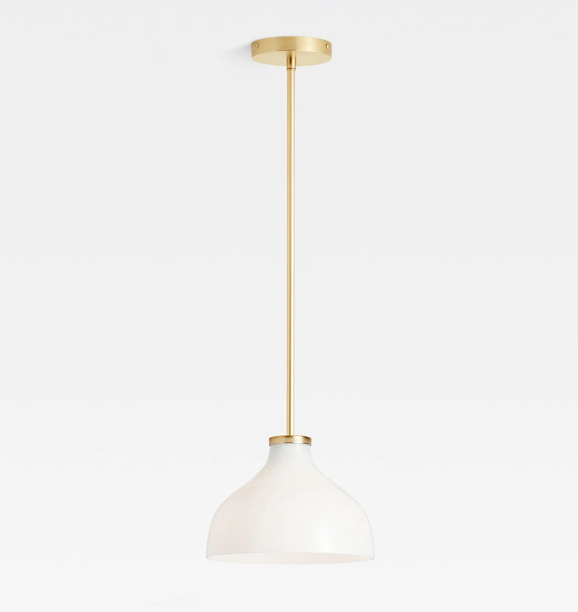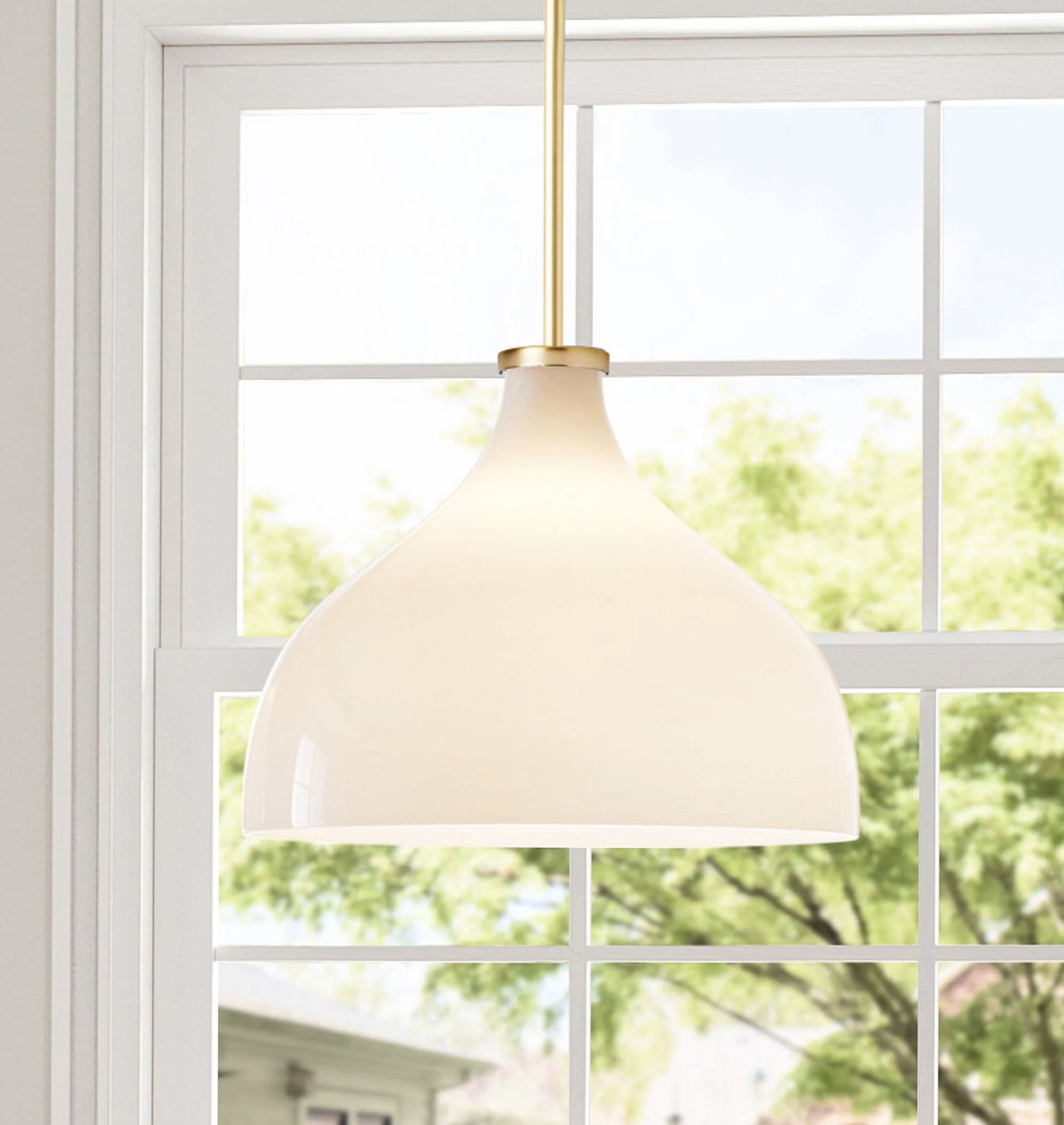 This pendant features a soft cone silhouette made from opal glass, offering a warm, inviting glow to any space.Constructed with a brass fixture and opal glass shade, combining durability with elegant design.