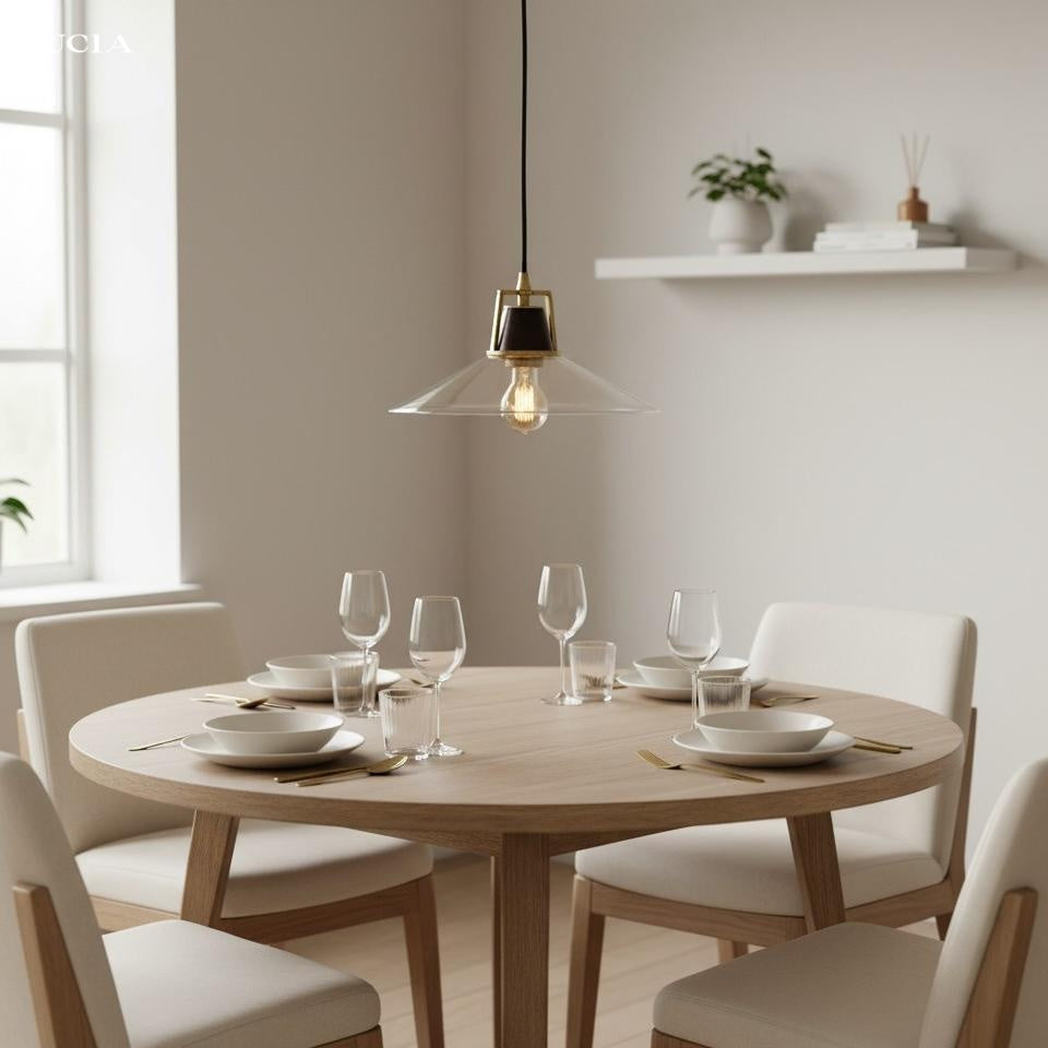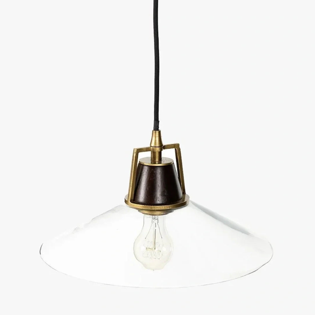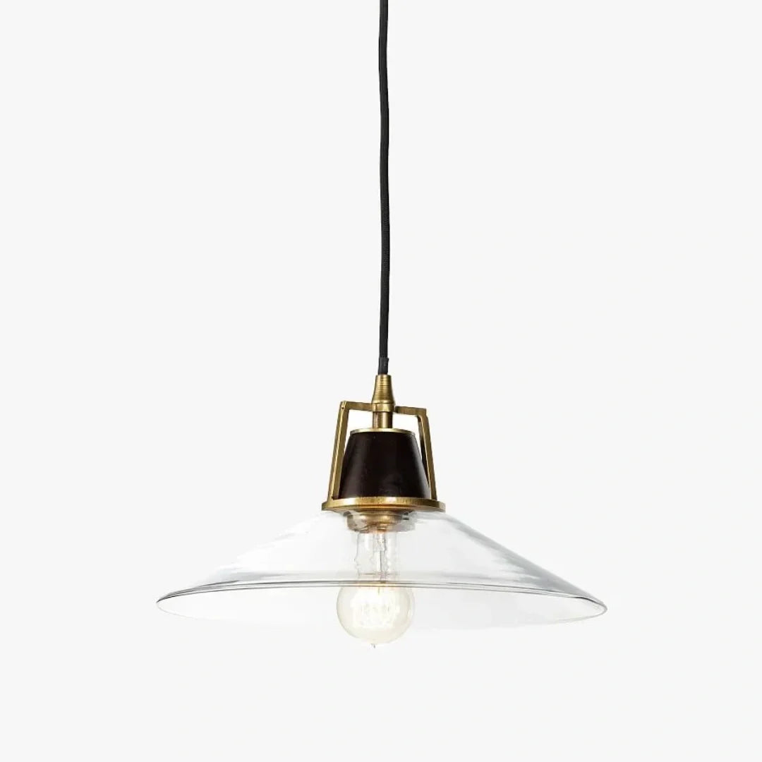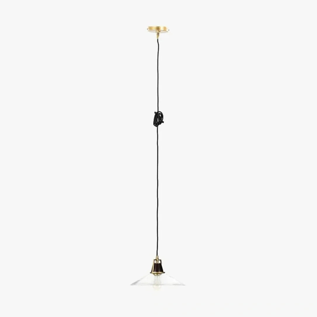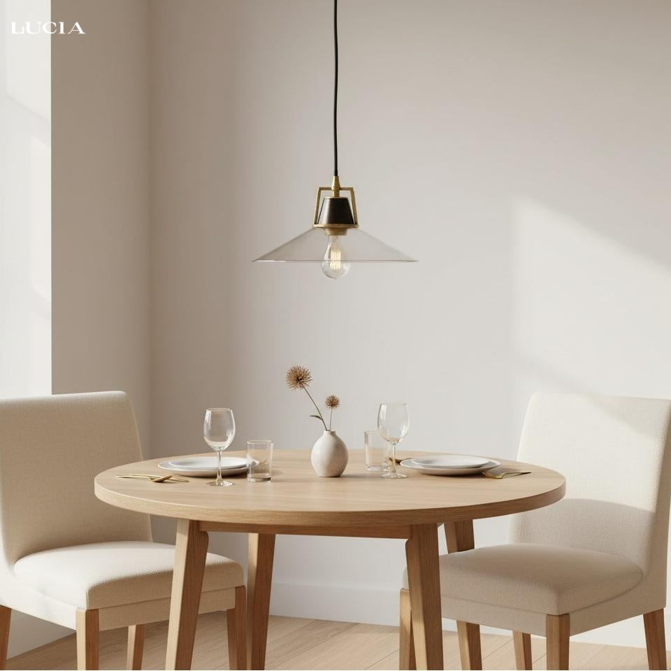 The Nephelai Pendant Light blends pure minimalism with mid-century charm. Suspended from a sleek cord, its clear glass cone shade and subtle metallic accents add elegance to dining tables, kitchen islands, or entryways.