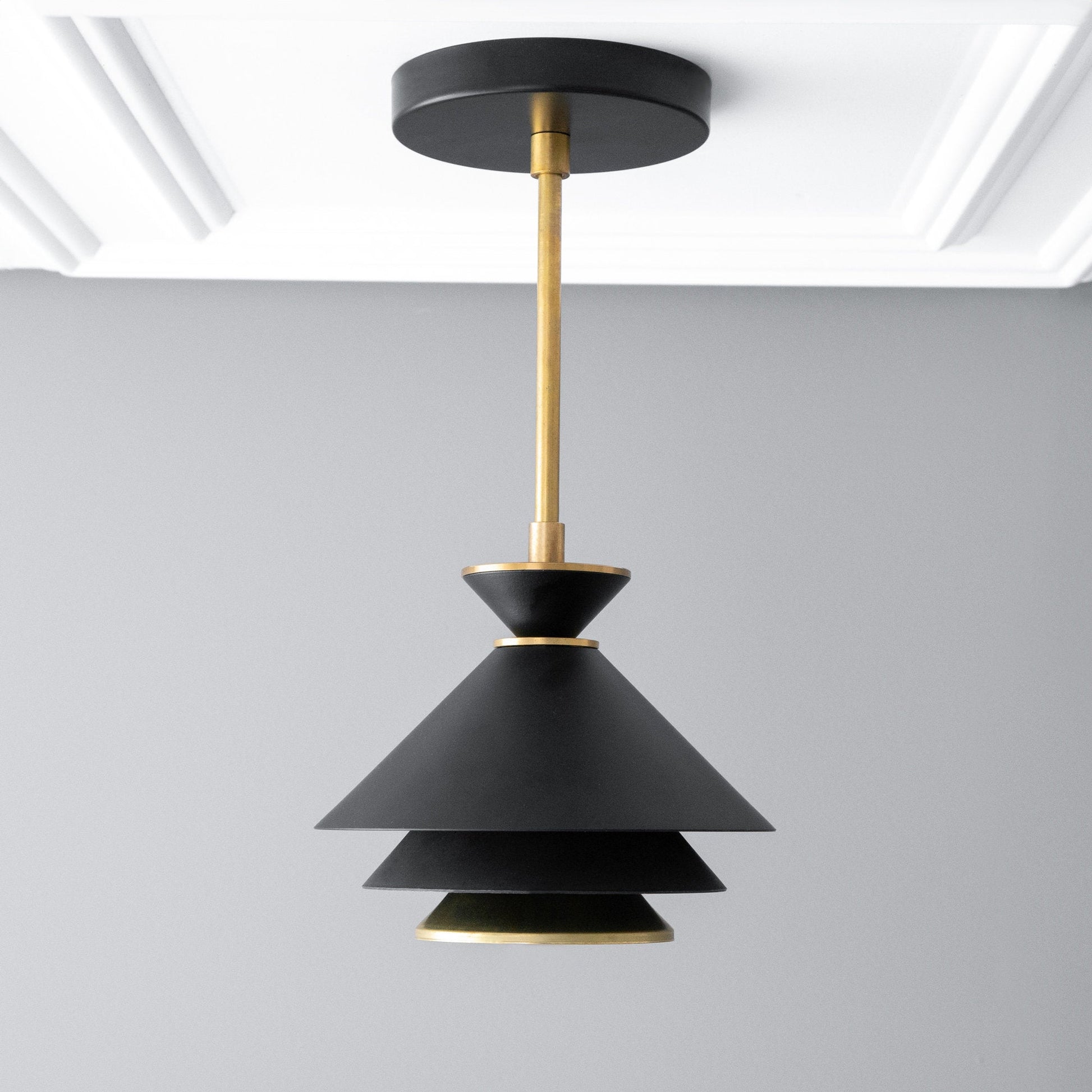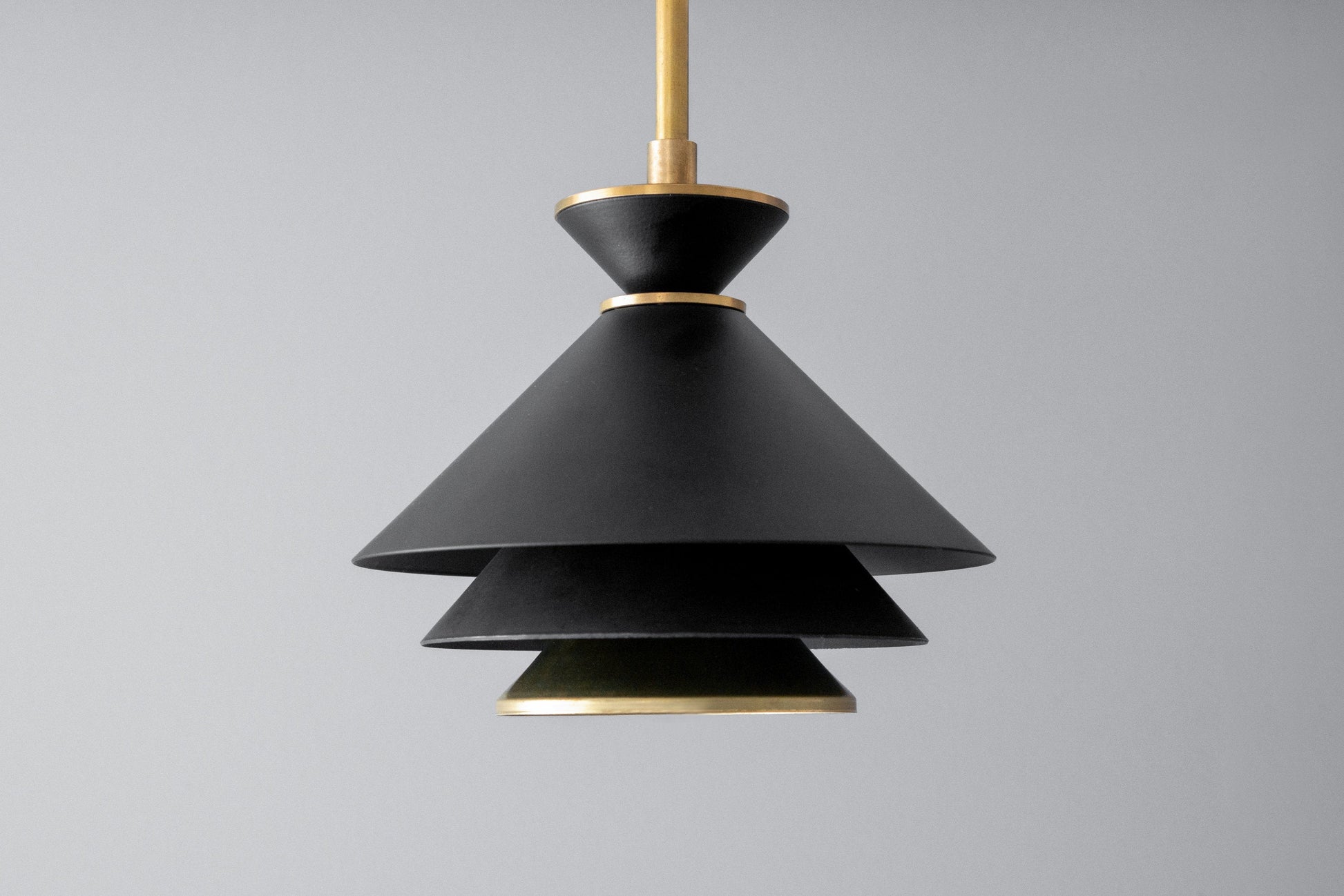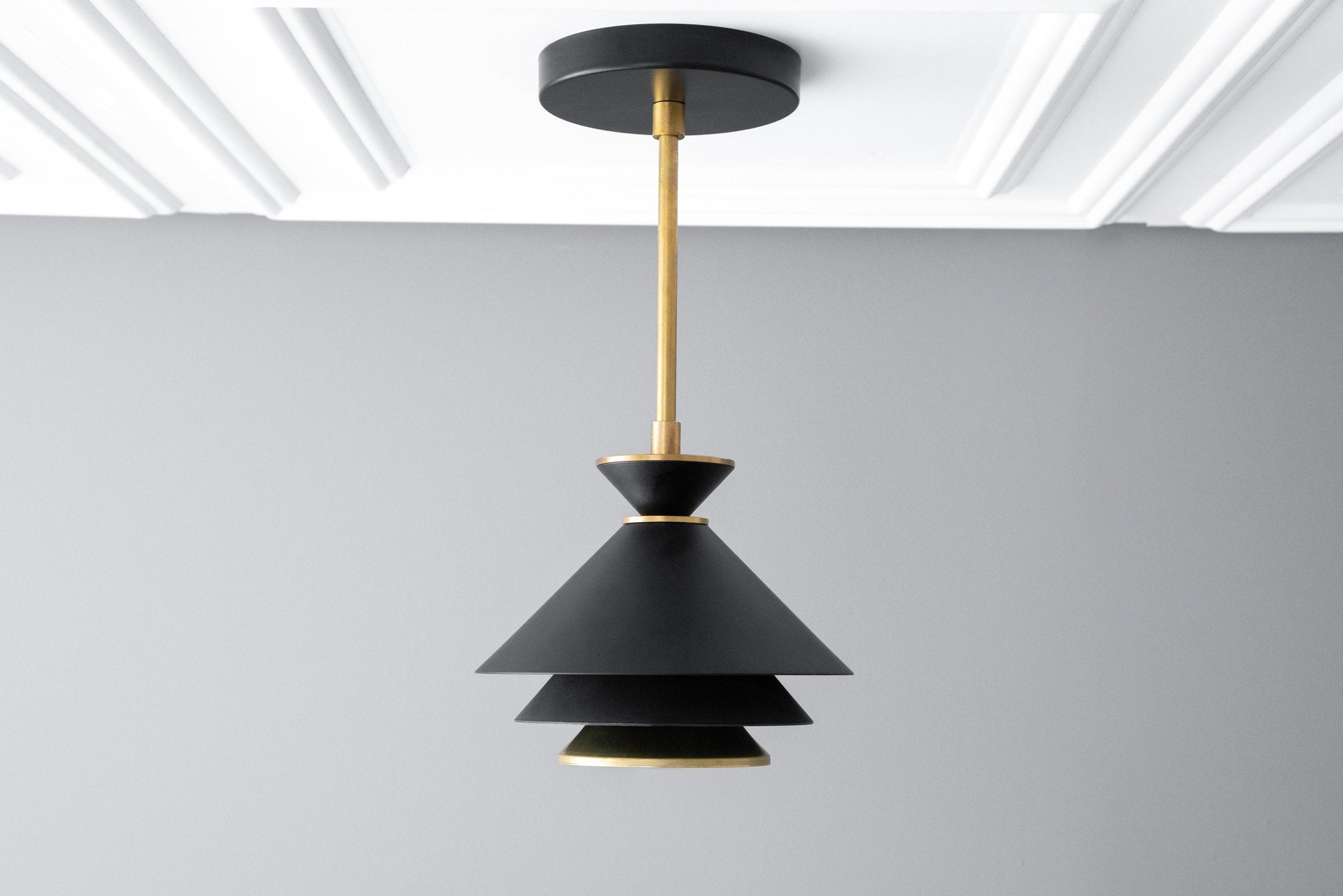 This Art Deco mini pendant light fixture features a unique layered triangular structural design.
