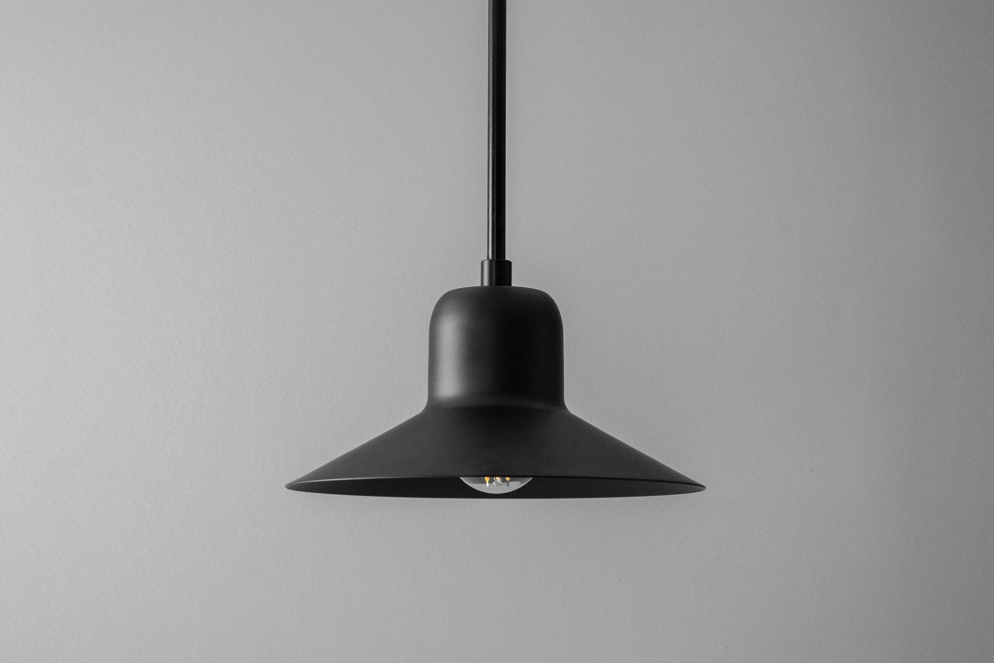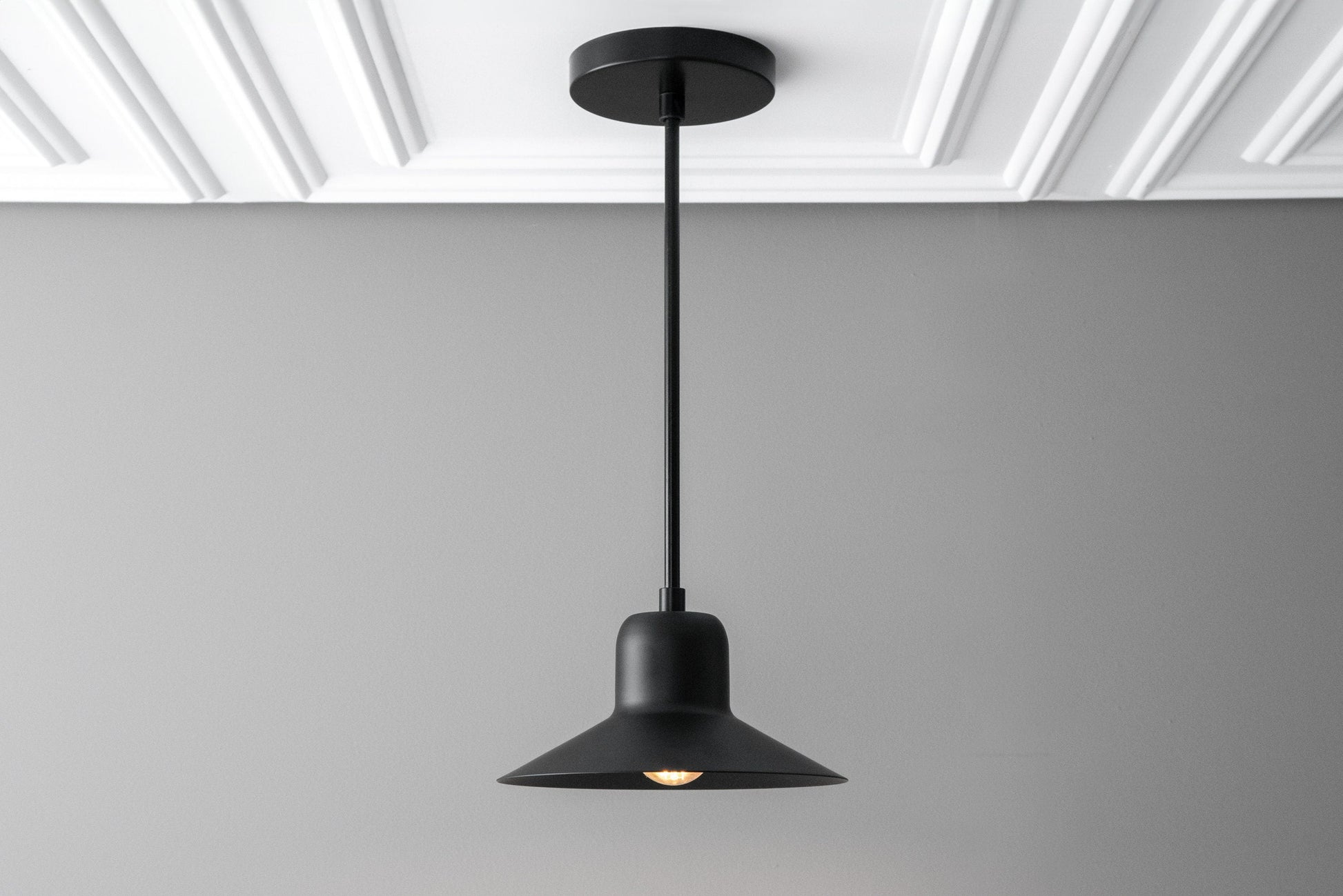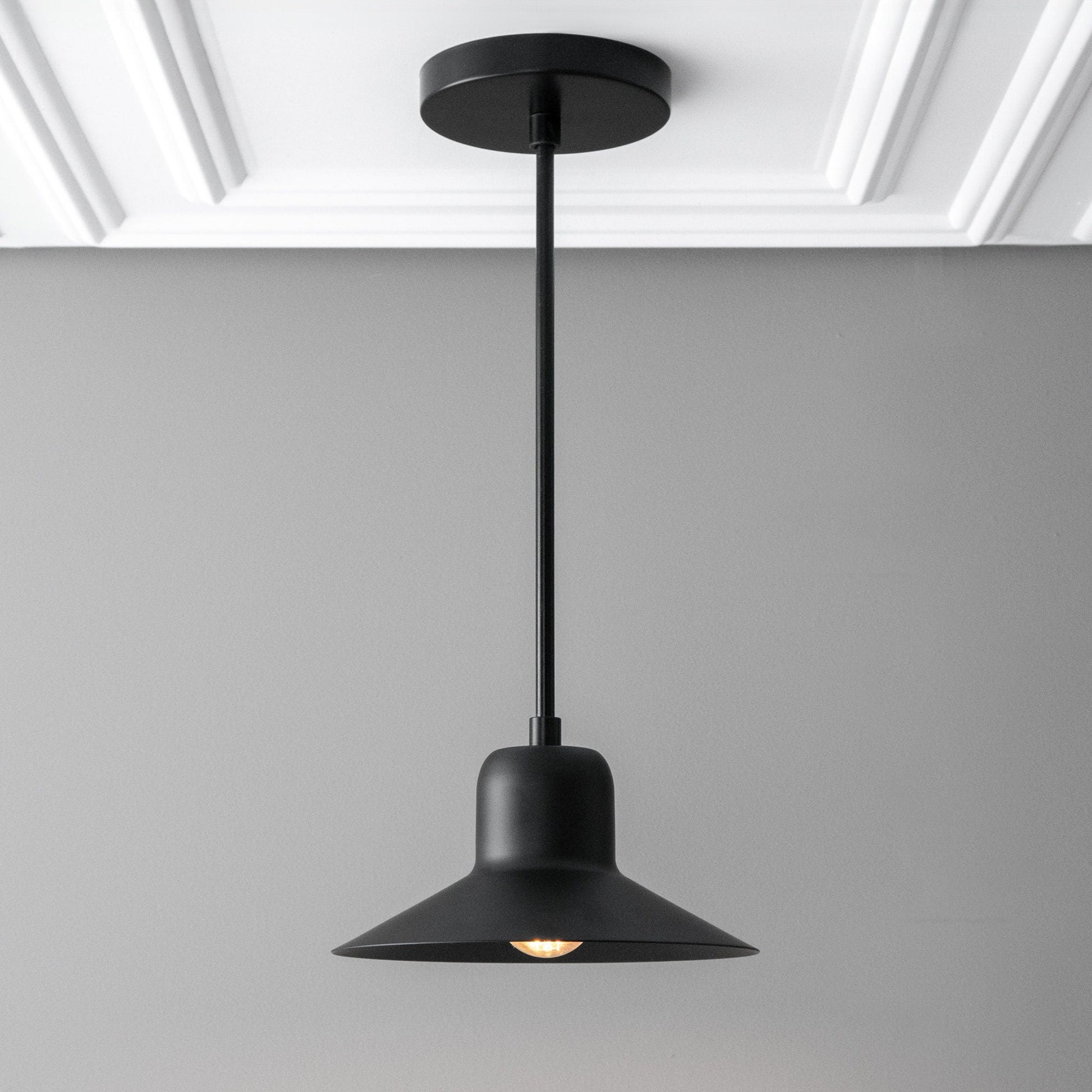 This industrial style pendant light fixture is a miniature version of a traditional utility light. The light fixture features a satin black finish shade with a versatile design that is a perfect black accent for most interior designs.