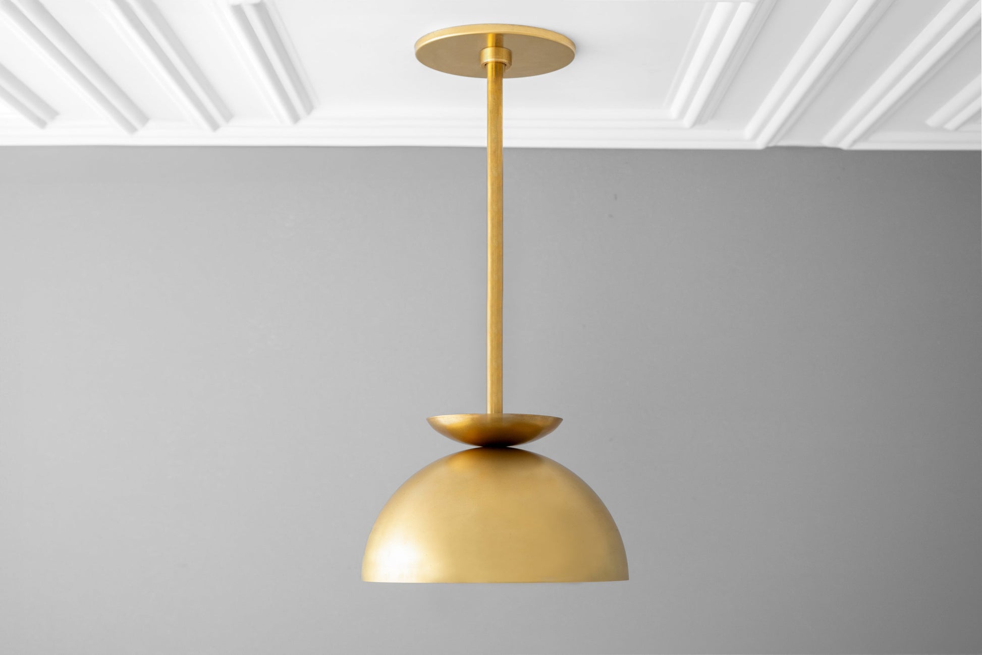 This midcentury modern pendant light fixture is constructed of solid spun brass and features an 8" dome shade embellished with a flared dish giving the pendant a unique hourglass shape. This hanging light fixture is suspended from a sturdy drop rod and attaches to the ceiling with a minimalist style thin canopy mounting plate.