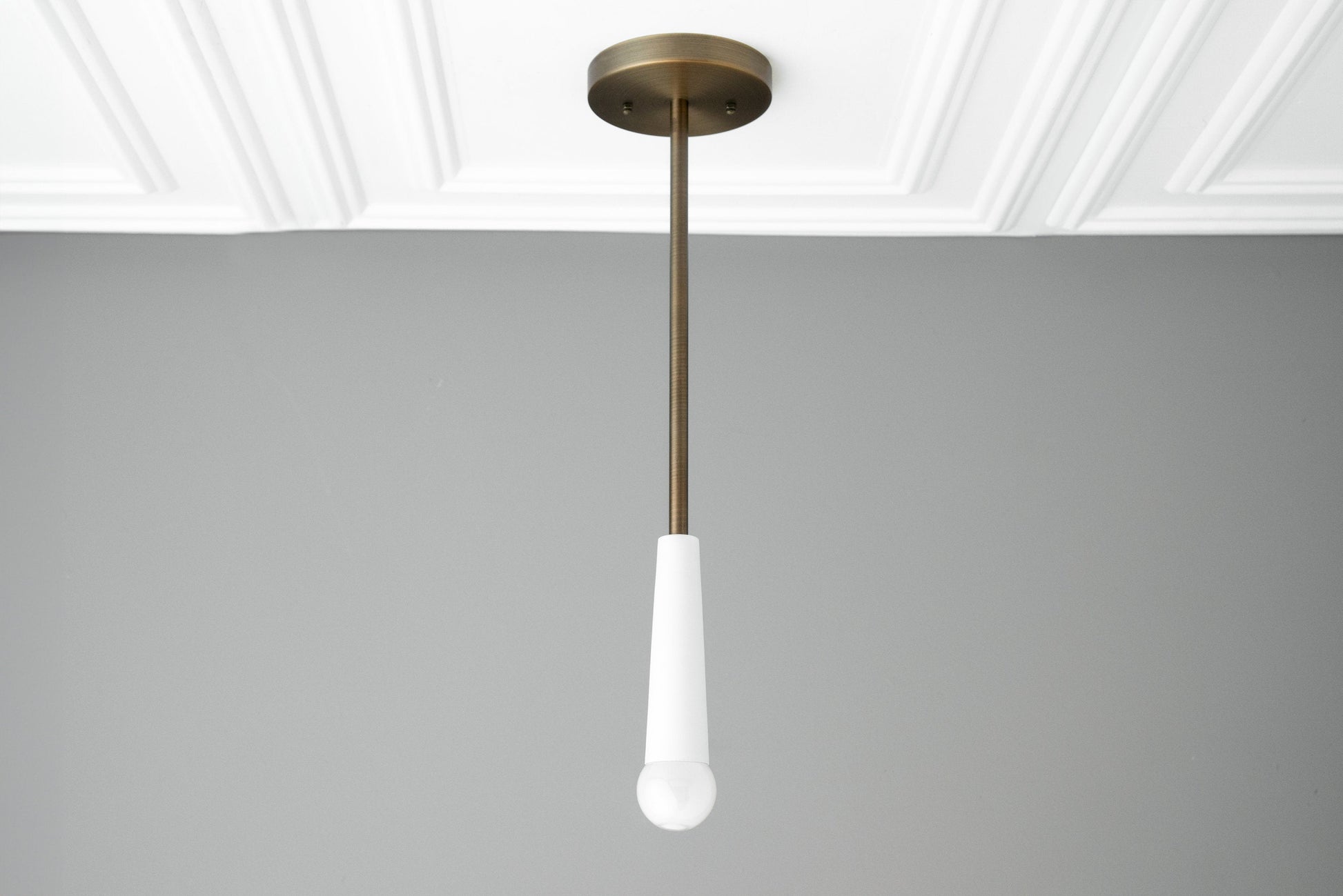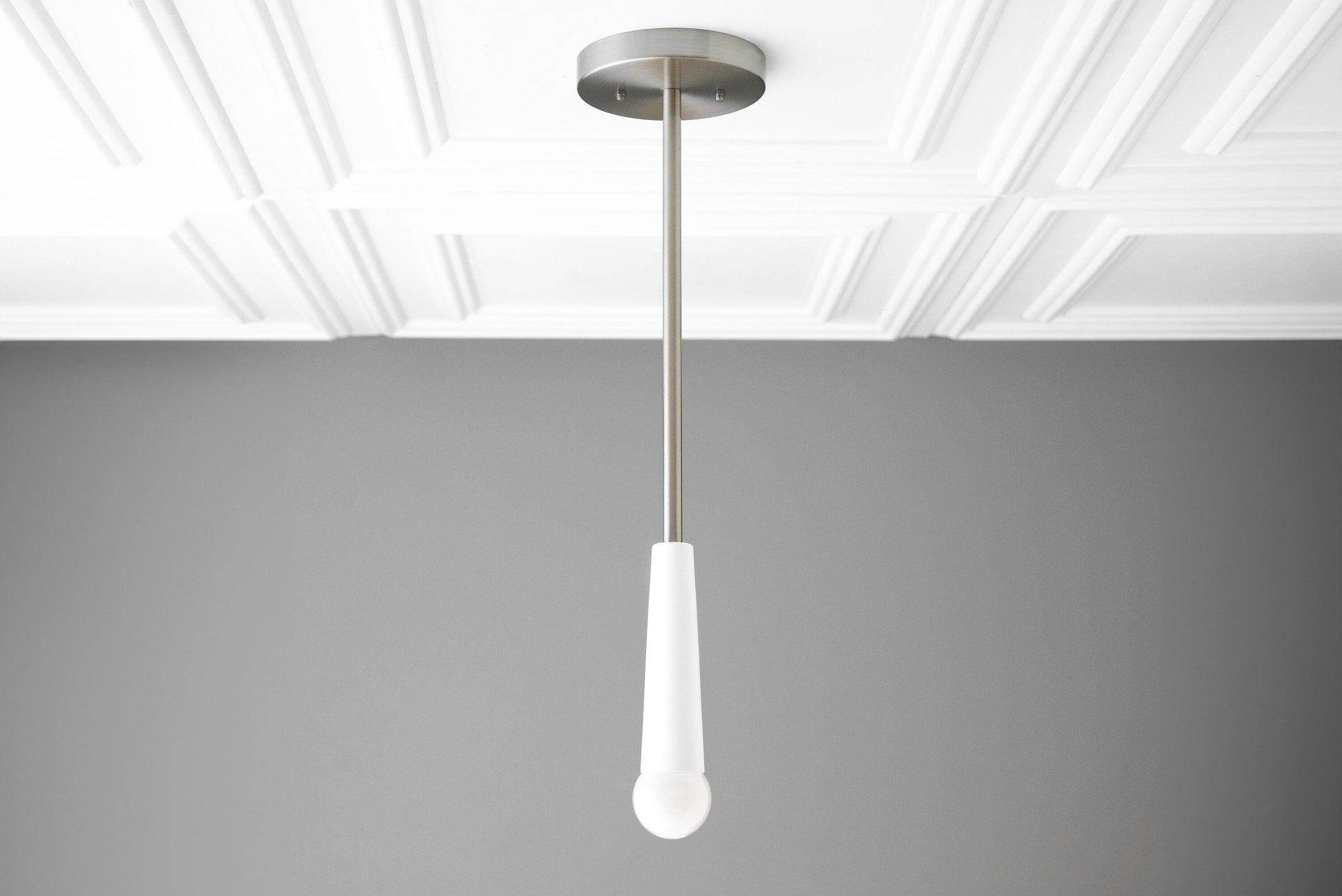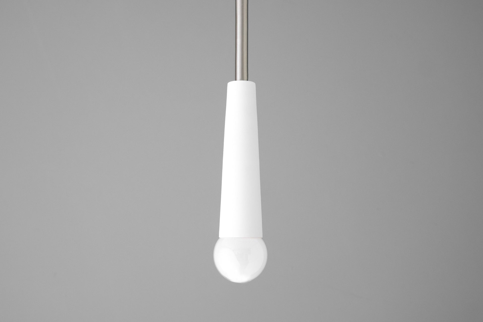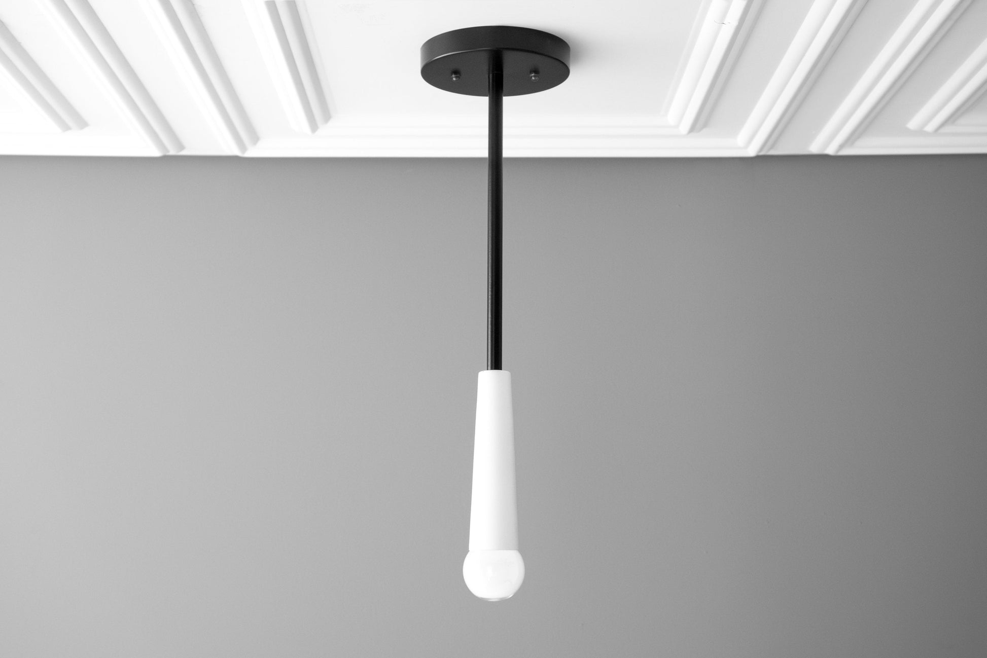 This midcentury modern minimalist mini pendant light fixture features an elongated cone design and an exposed bulb.