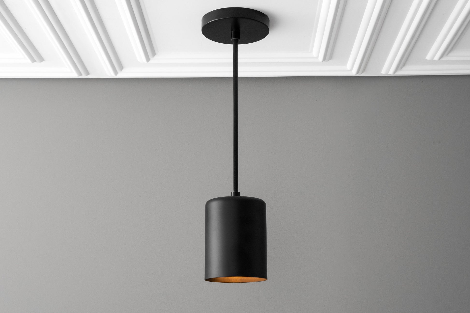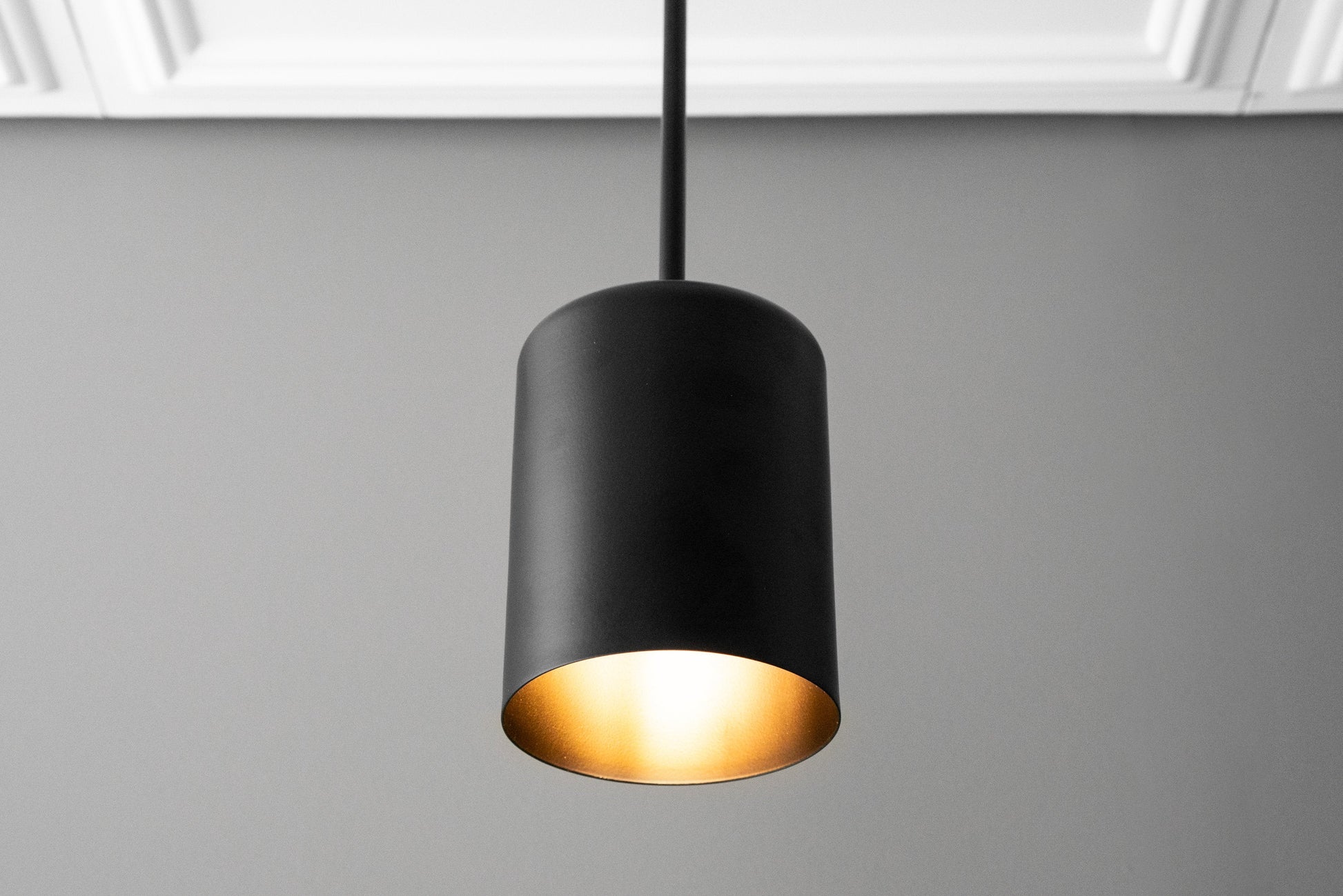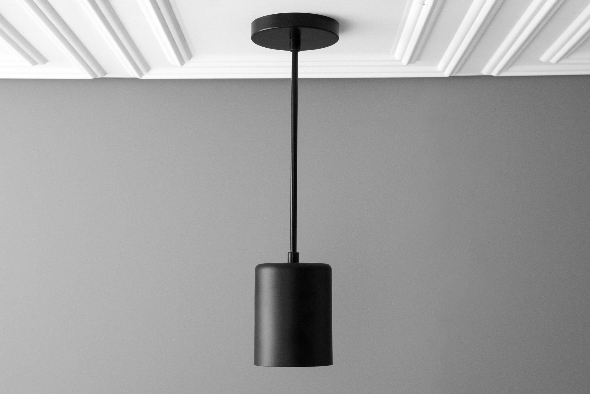 This industrial style pendant light fixture features a satin black finish bucket shade. The light is available in all black finish or with your choice of metal finish for the drop rod and canopy ceiling plate.
