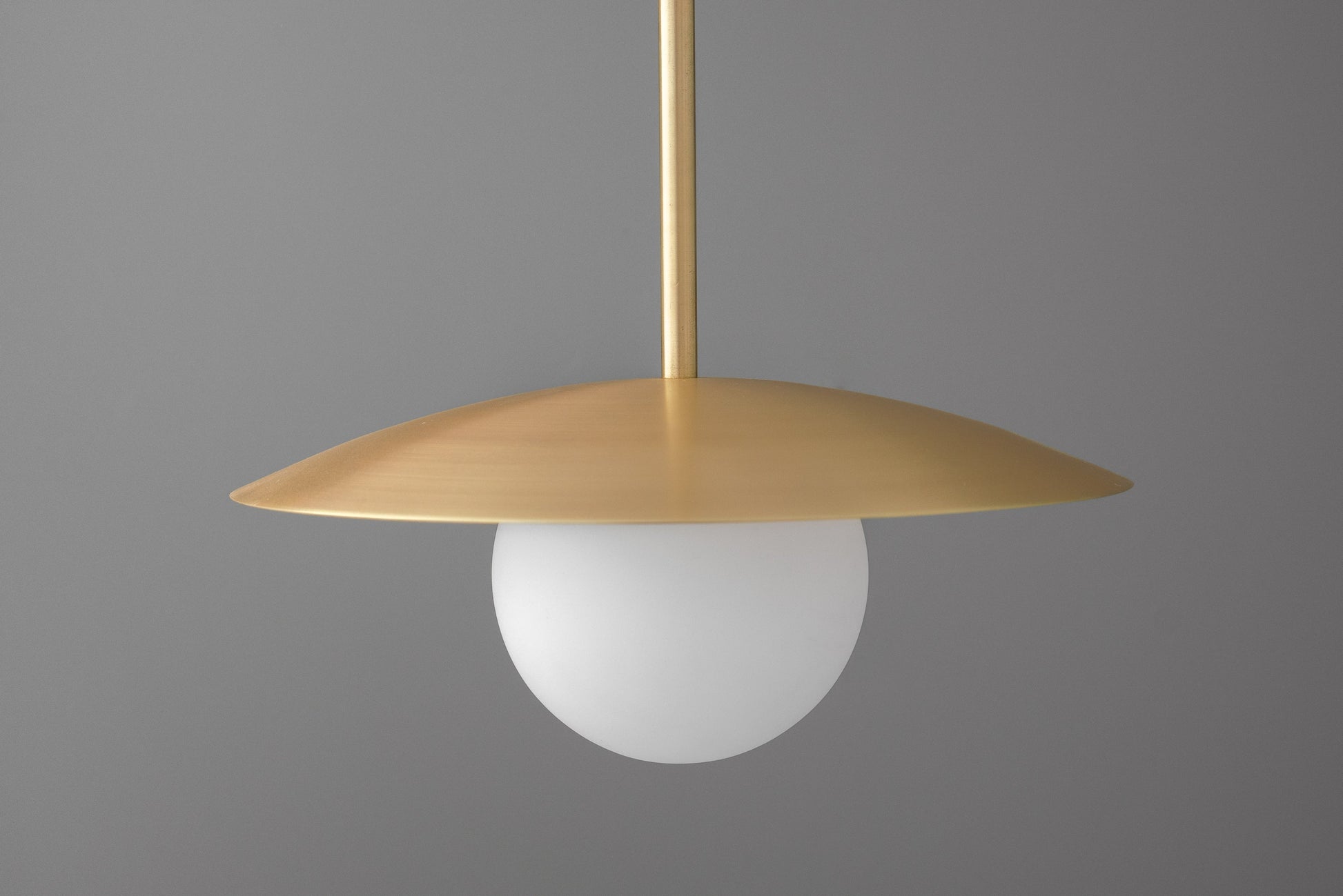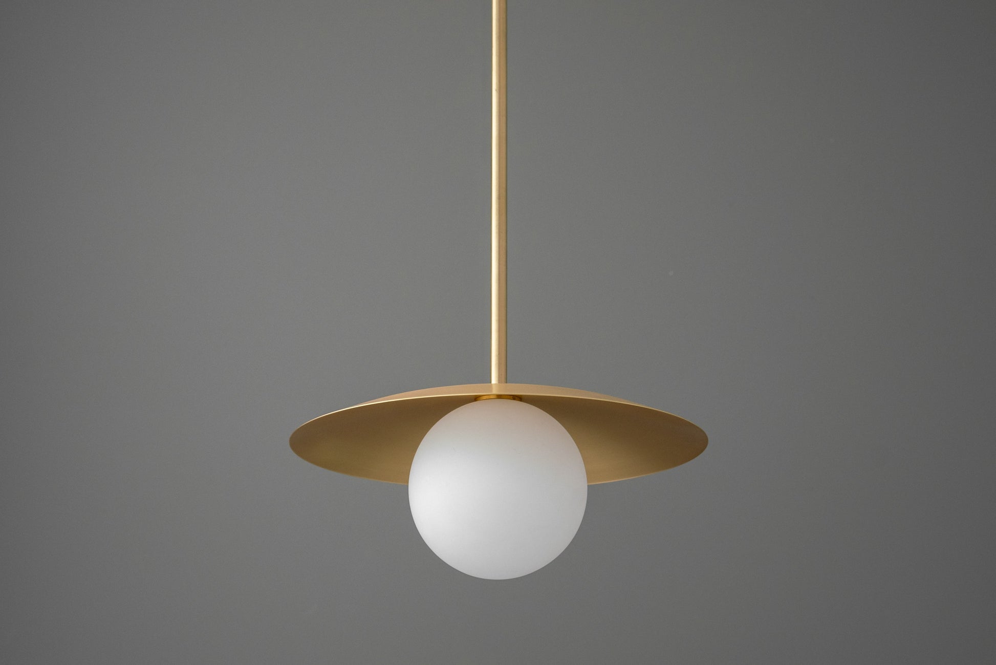 Add a touch of modern elegance to your home with this sleek pendant light, featuring a chic brass finish and a smooth frosted glass globe. The minimalist design, highlighted by a wide, flat shade, creates a sophisticated silhouette that complements any contemporary space. Perfect for illuminating dining areas, kitchen islands, or entryways, this pendant offers both style and functionality. Its clean lines and refined aesthetic make it an ideal choice for those looking to enhance their home with understated luxury.