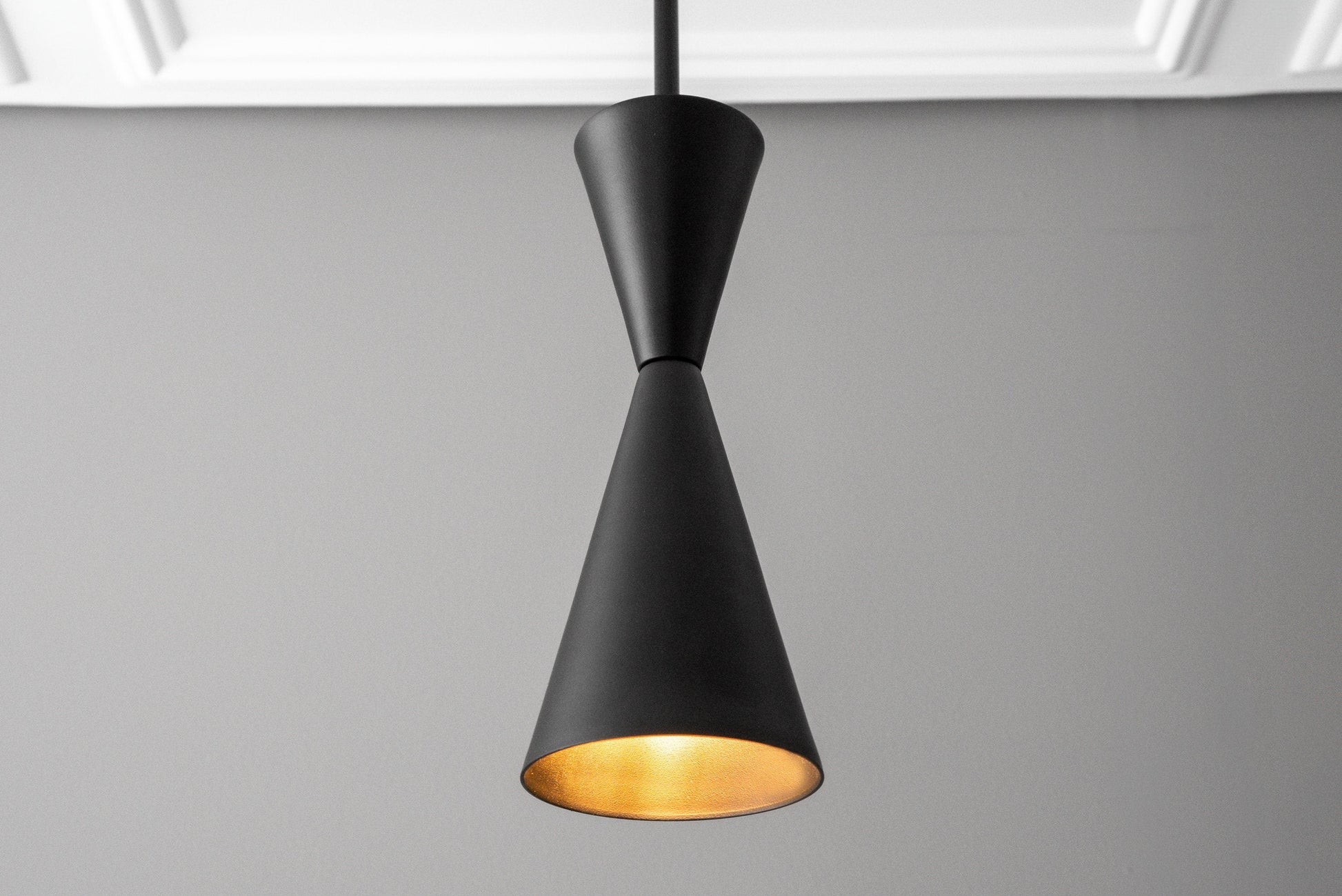 This midcentury modern style geometric pendant light fixture is a modern interpretation of the classic bowtie design. The light features a satin black finish shade with your choice of metal finish for the drop rod and shallow canopy ceiling plate.