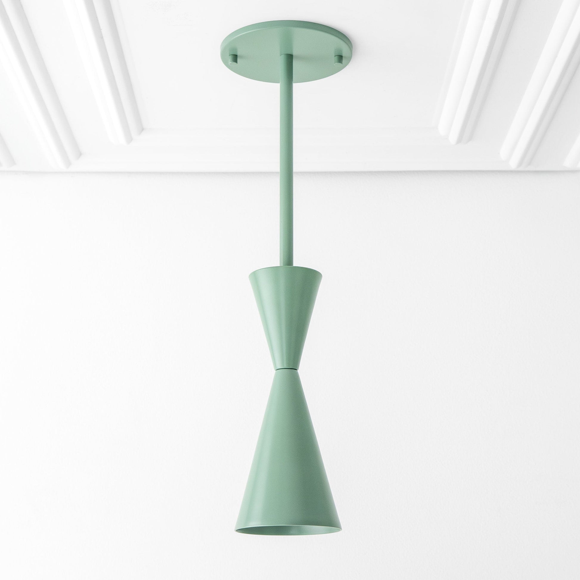 This colorful pendant light fixture features a modern take on the classic midcentury bowtie design.
