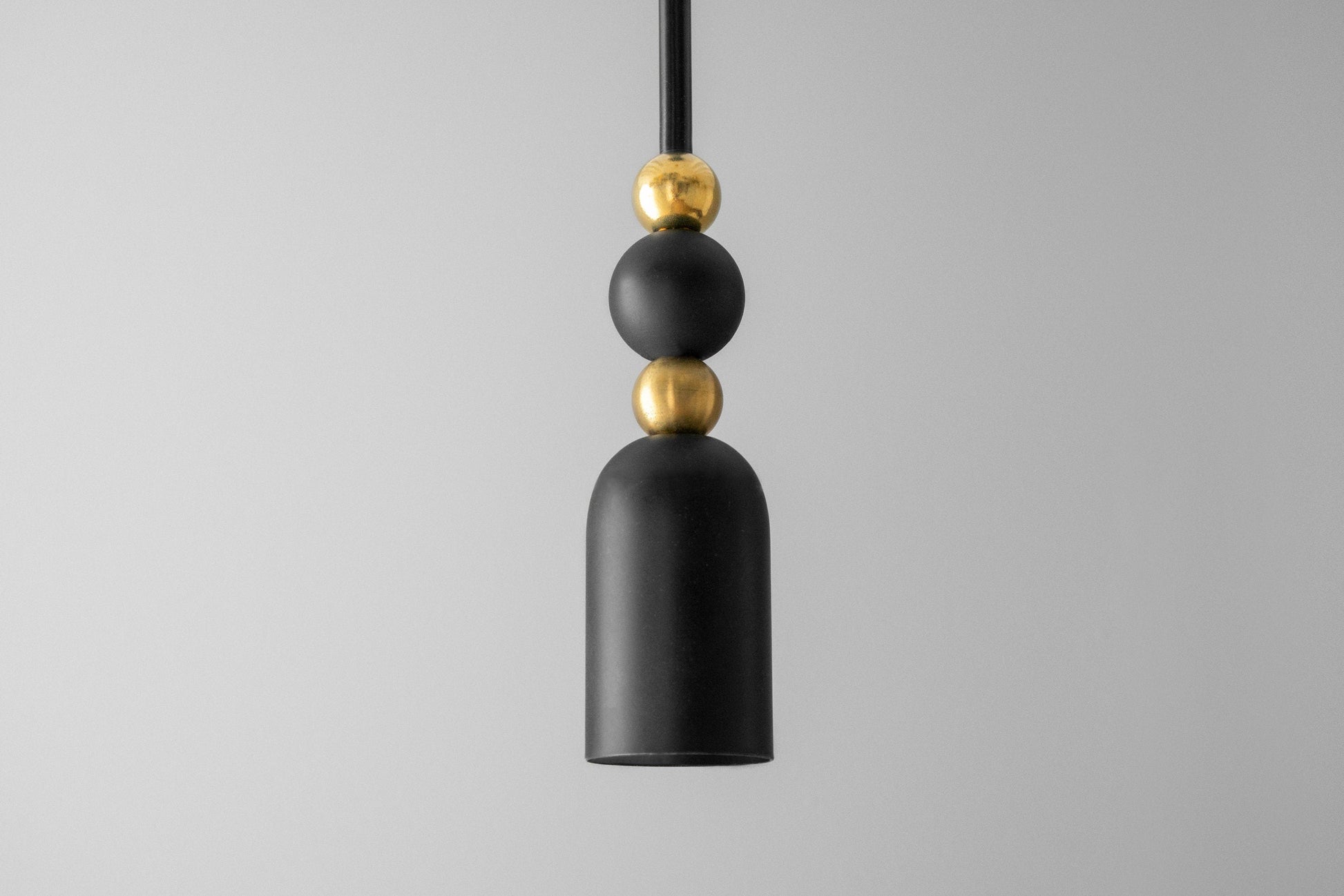 This mini Art Deco pendant light fixture features three solid brass stacked spheres atop a long dome shade.
