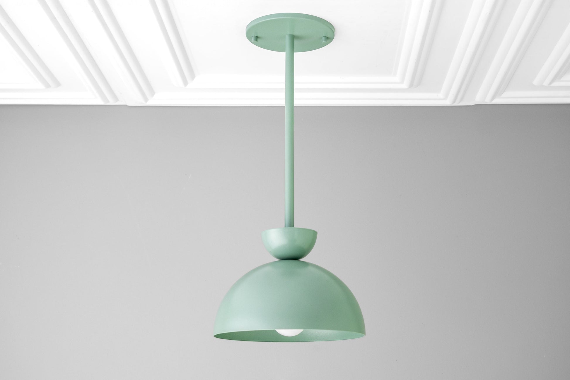This colorful light fixture features an 8" dome shade embellished with a small flipped dome giving the pendant an abstract hourglass shape.