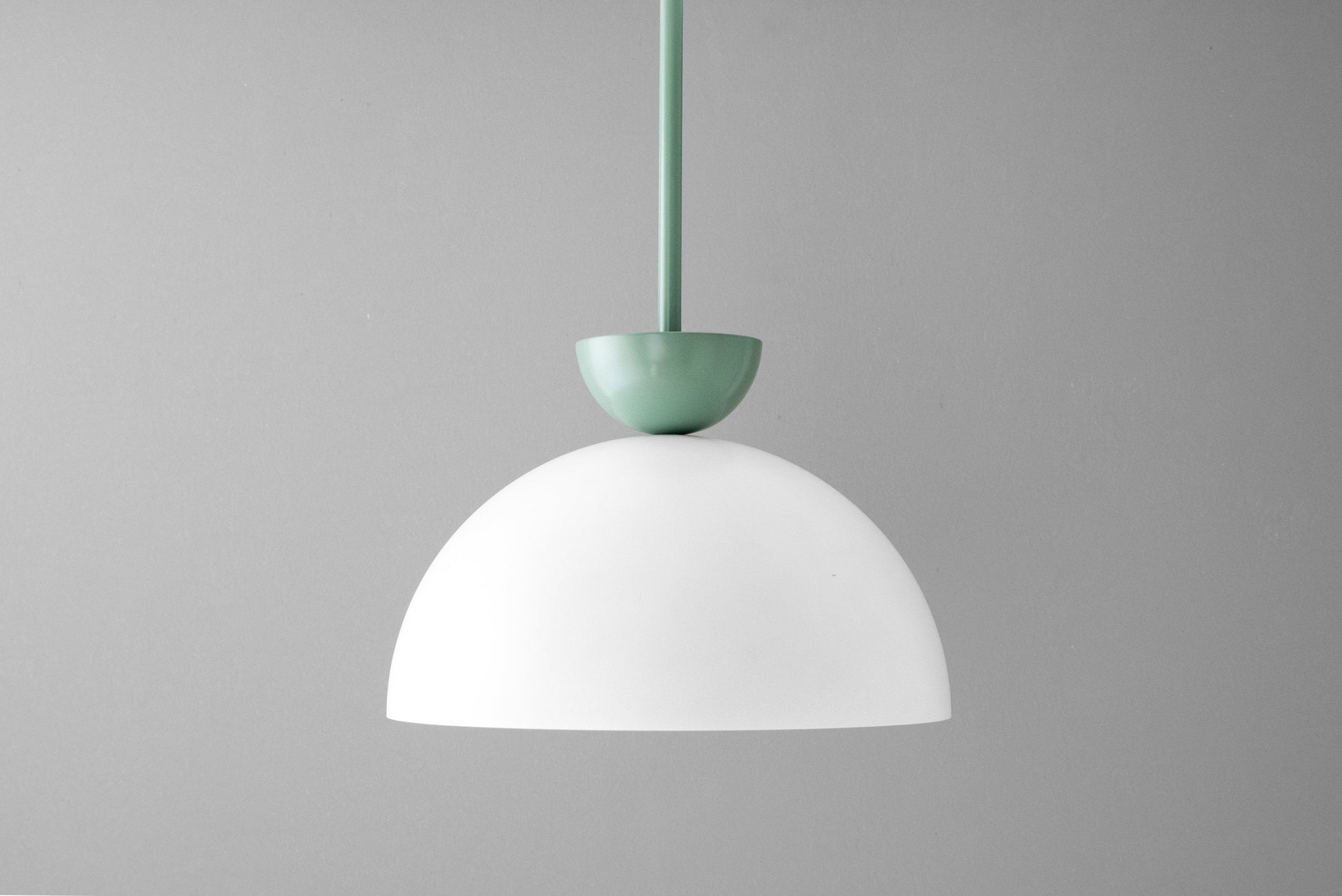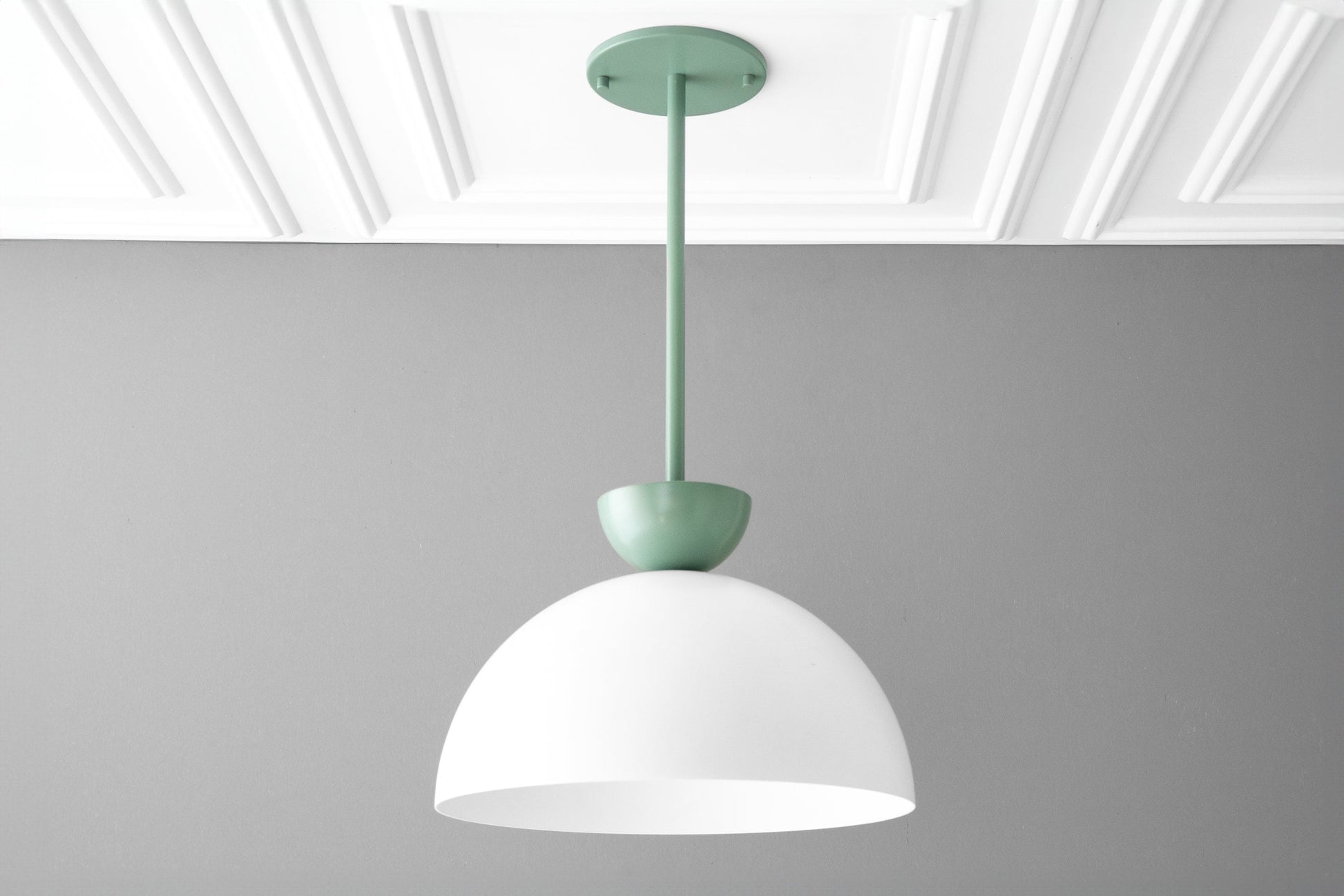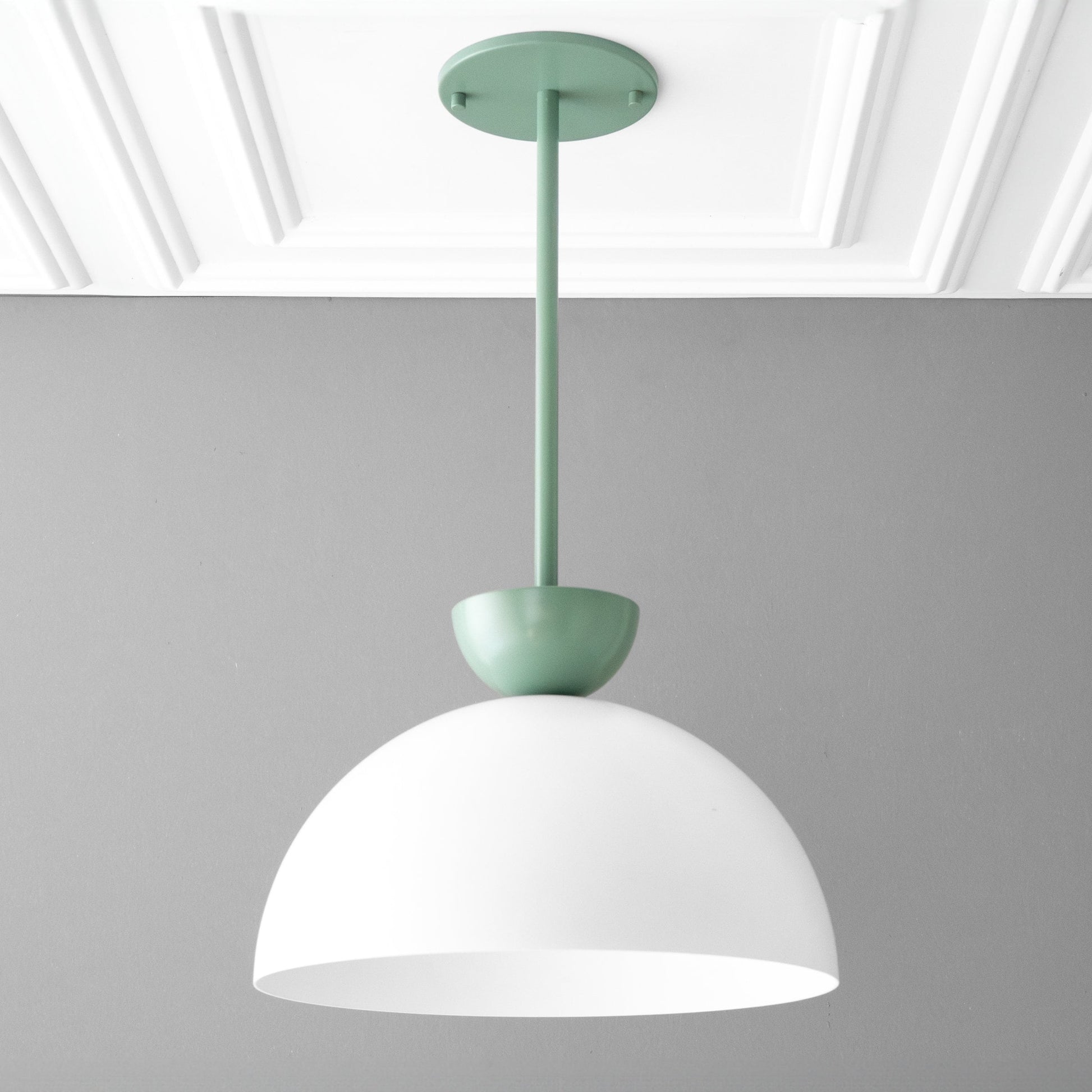 This colorful pendant light fixture features a 12" matte white dome shade with a reversed dome embellishment. The light is available in all white or in your choice of pastel or neutral color to complement the white shade. Inside the dome is a white porcelain twin 2 bulb socket.