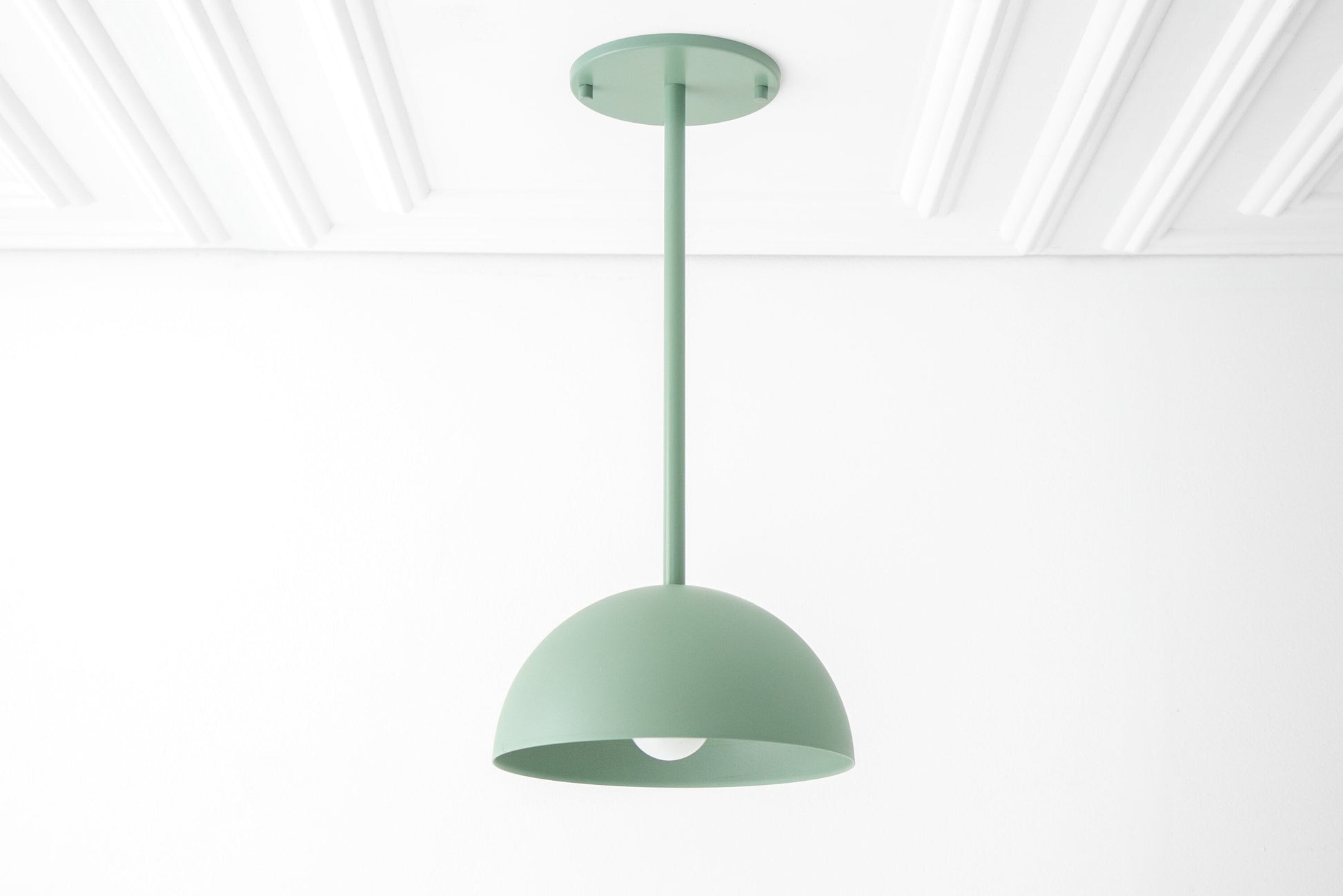 This solid color pendant light fixture features a simplistic design complimented by an 8inch dome shade. The pendant is available in ten different colorful finishes that make a perfect accent color for your space.