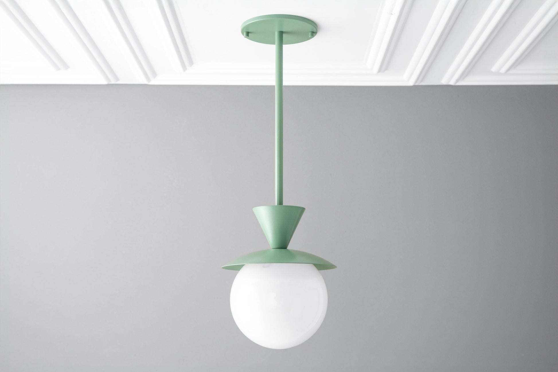 This colorful pendant light fixture features a unique playful design that is available in 10 different colors ranging from neutral to vibrant pastel. The bulb is encased in a hand blown 6" white glass globe.
