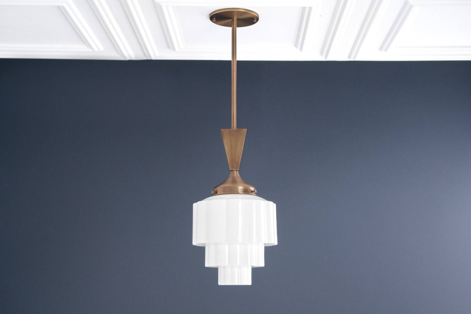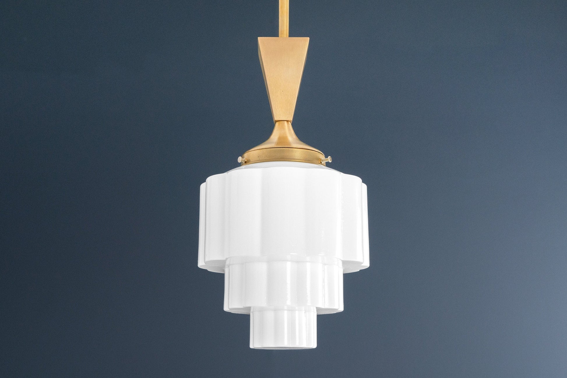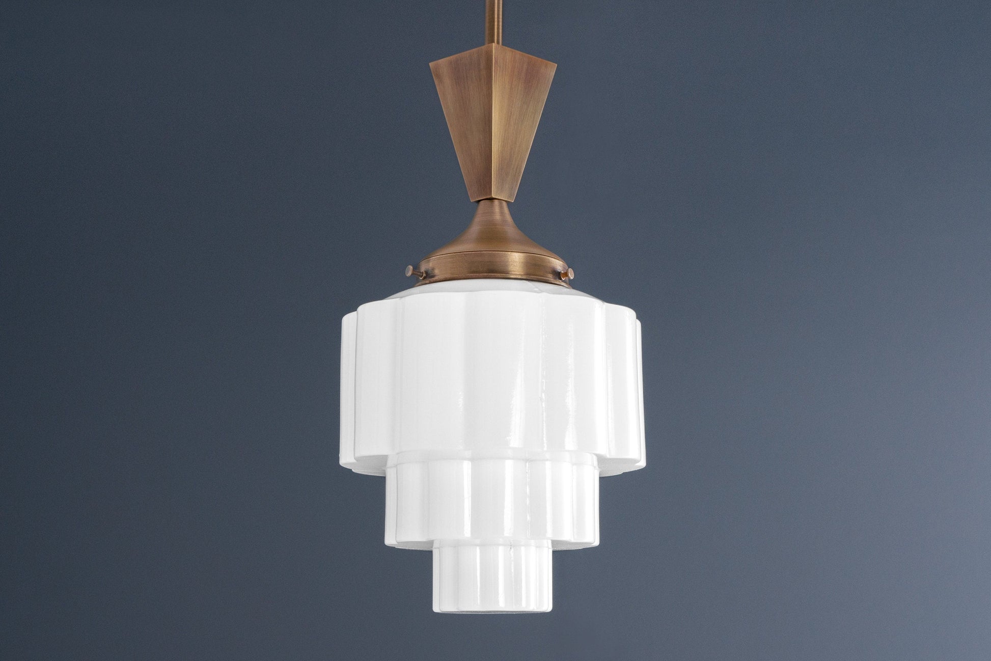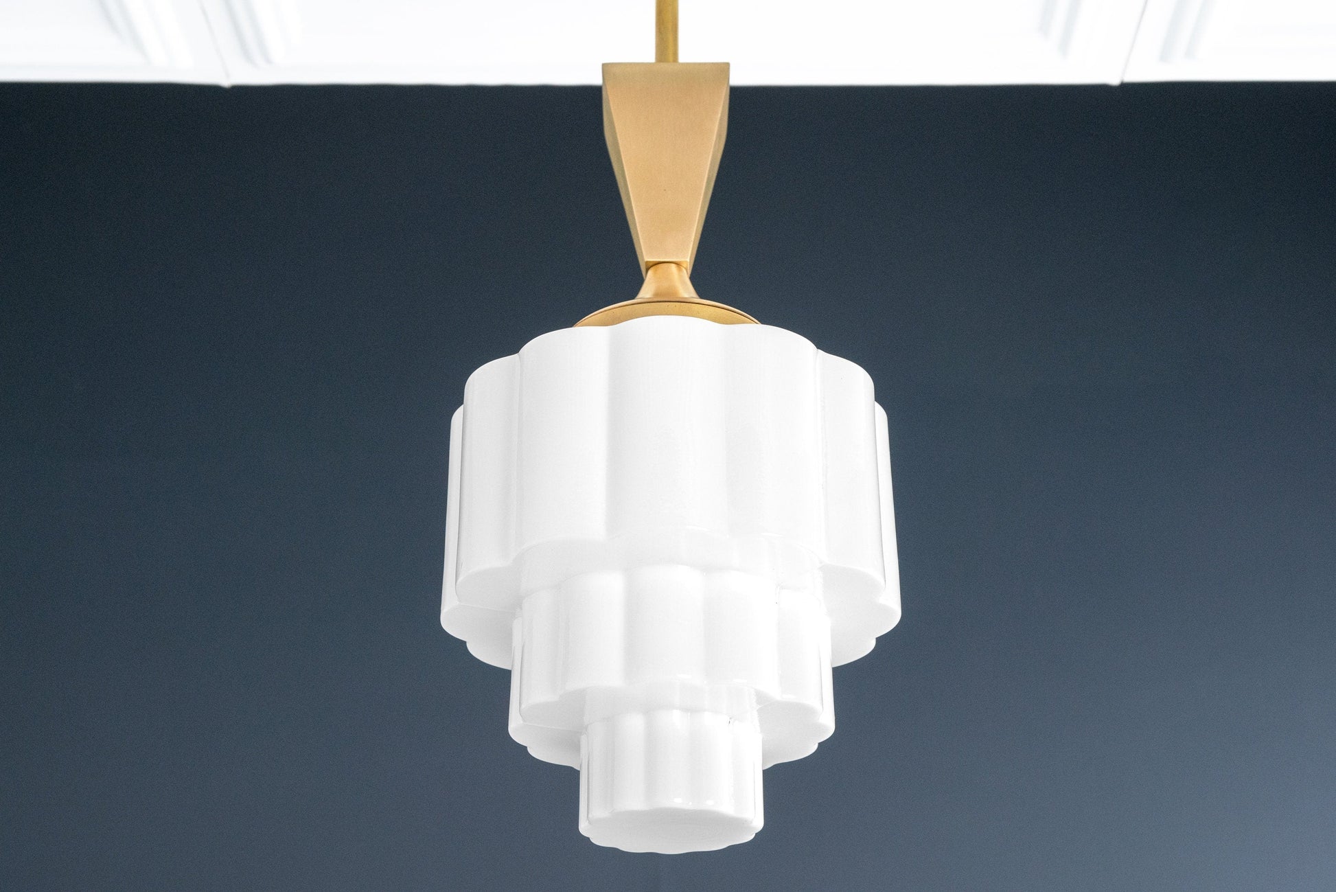 Add a touch of vintage charm and modern elegance to your home with our stunning tiered glass chandelier. Featuring an intricate, layered design, this chandelier combines a striking white glass shade with a sophisticated gold-toned fixture, delivering a breathtaking visual that pairs beautifully with any decor style. Perfect for entryways, dining rooms, or cozy alcoves, this chandelier's art deco-inspired contours and luxurious materials make it a standout addition to any space. Illuminate your home with style and grace, and let this exquisite chandelier be the centerpiece of your interior design.