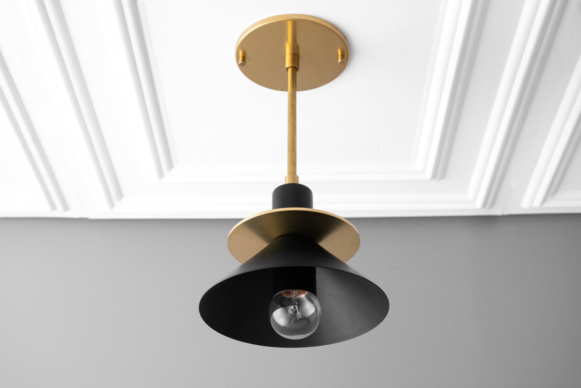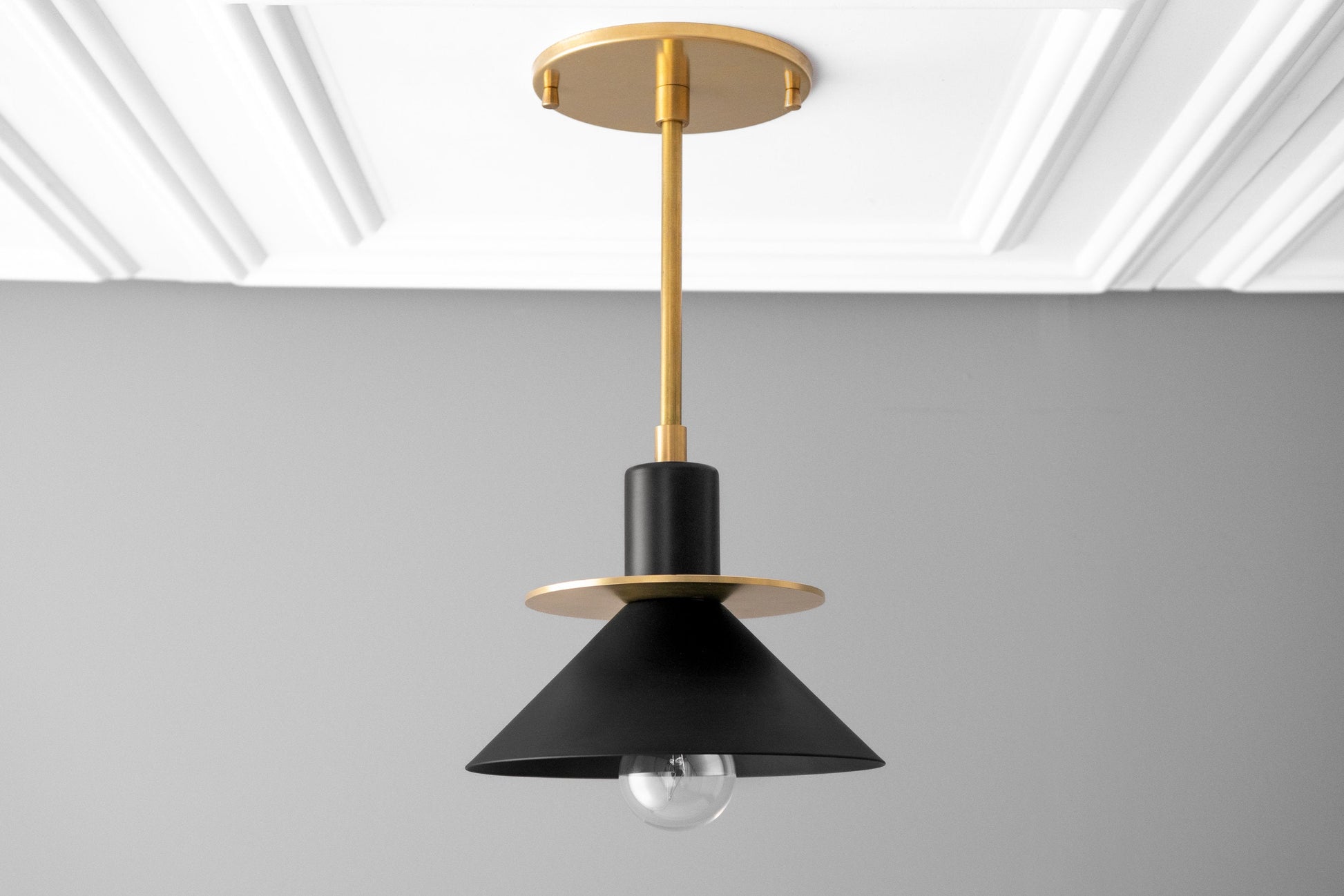 This unique Art Deco pendant light fixture features a shallow canopy mounting plate and a 5" solid brass accent ring followed by a 7" cone shade.
