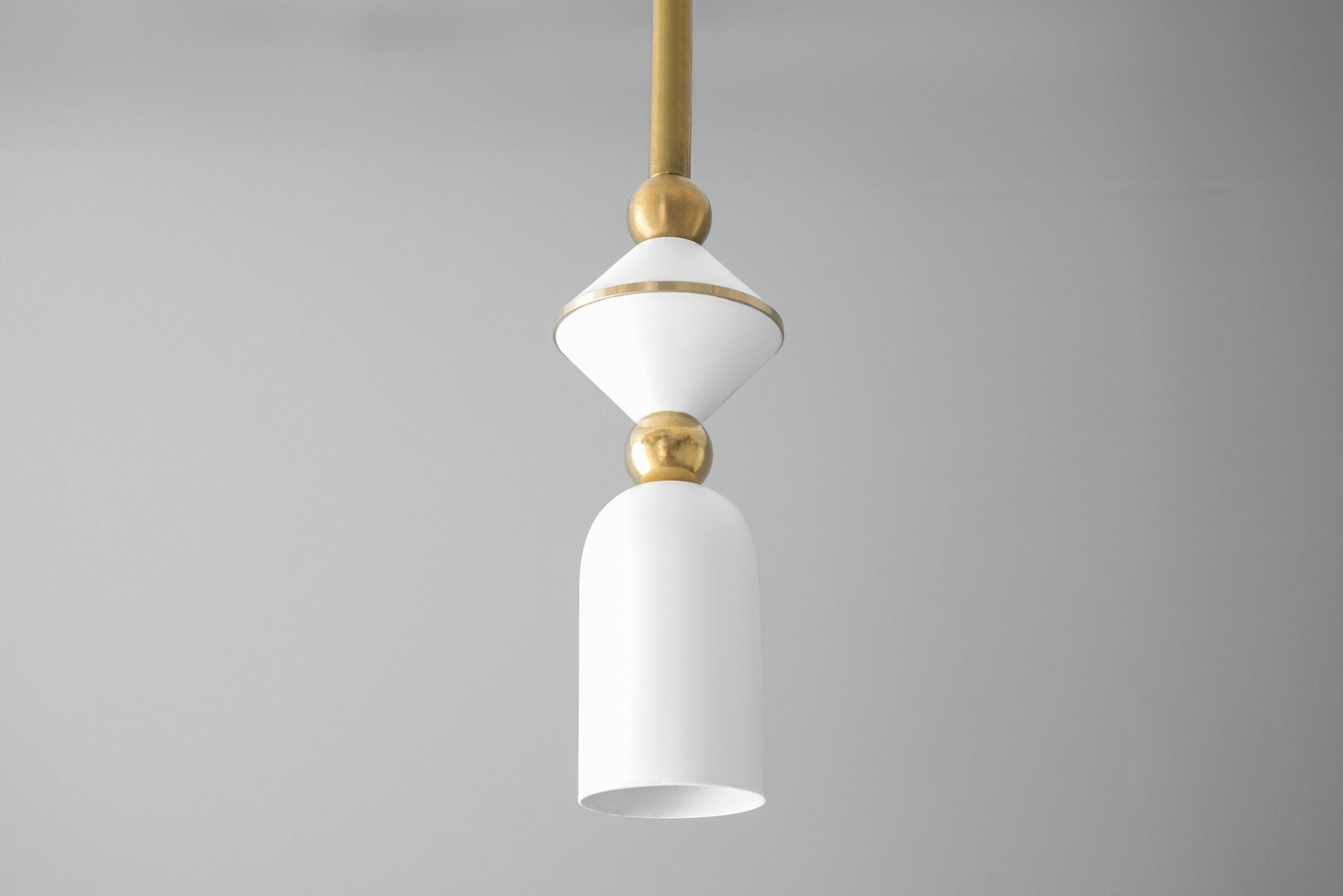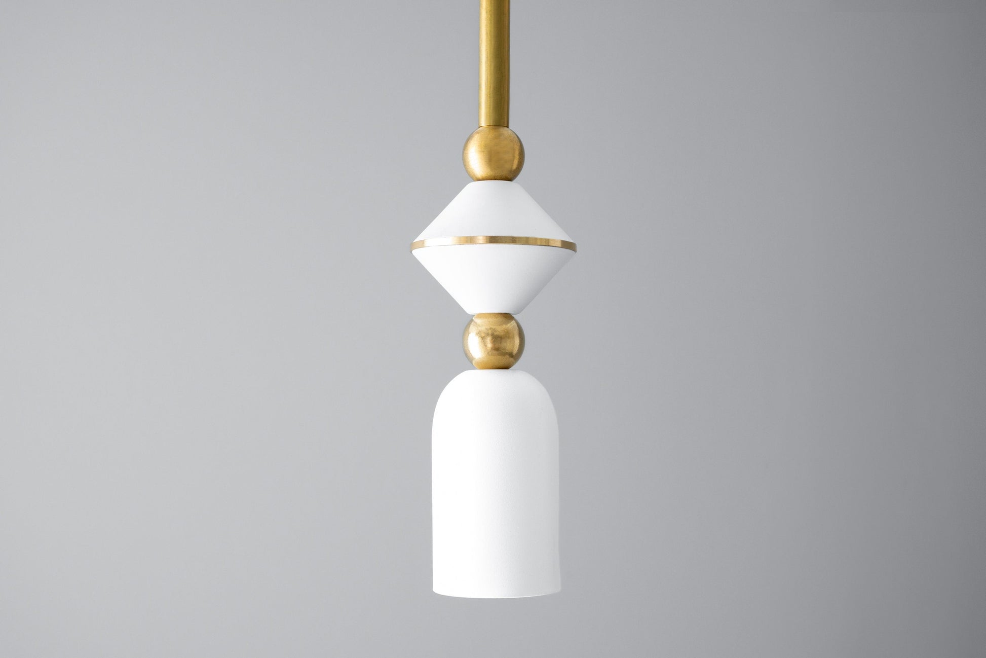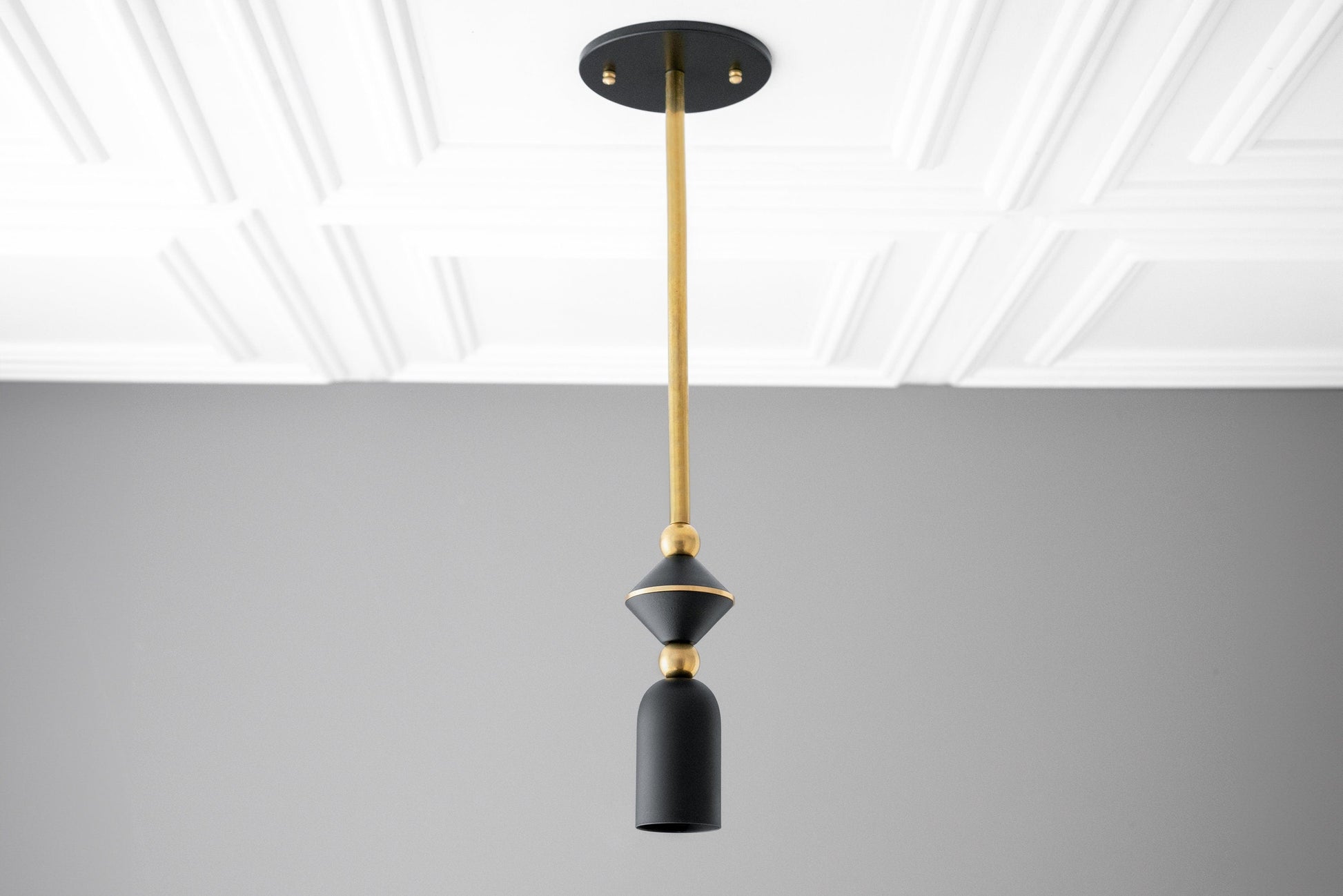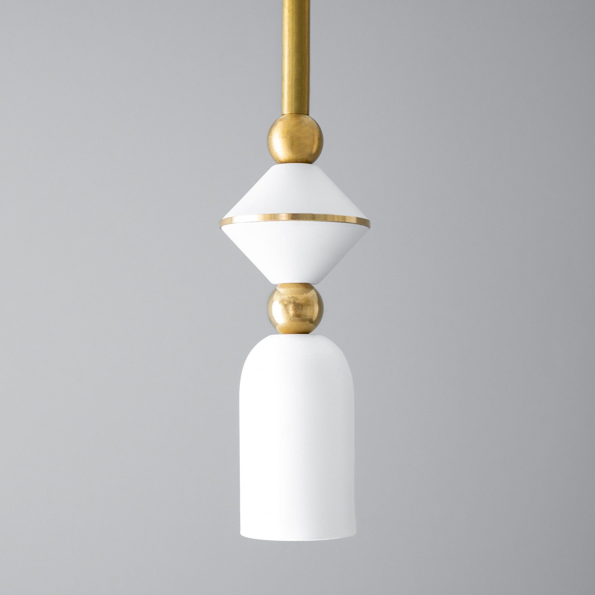 This Art Deco inspired stacked shape mini pendant light fixture features solid brass accents and drop rod with your choice of matte white or satin black finish. The fixture is also available in all satin black.