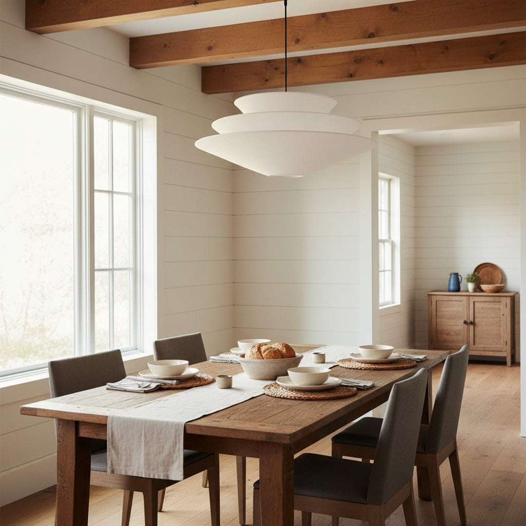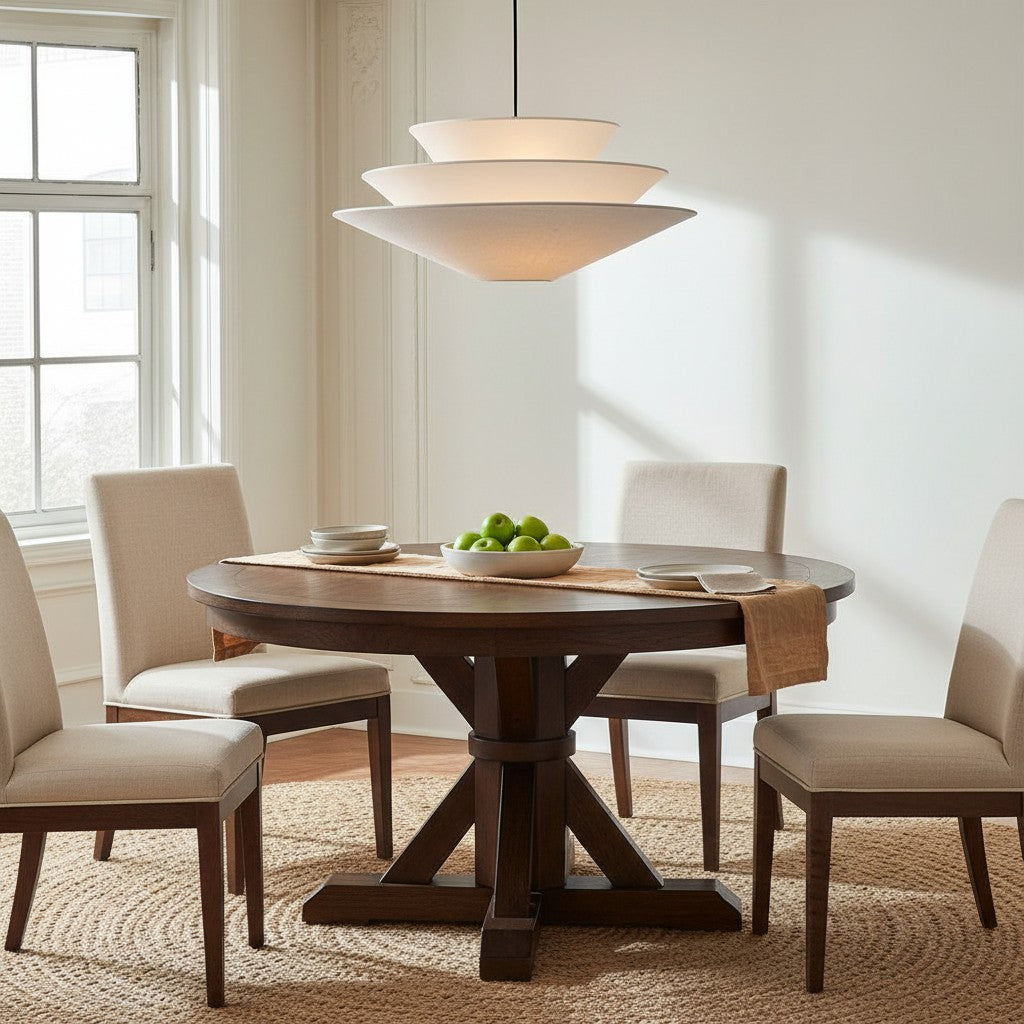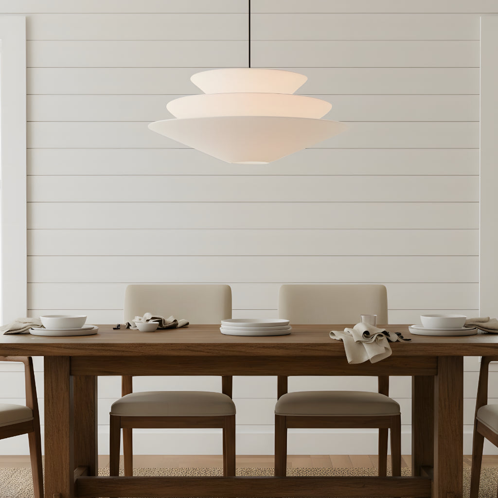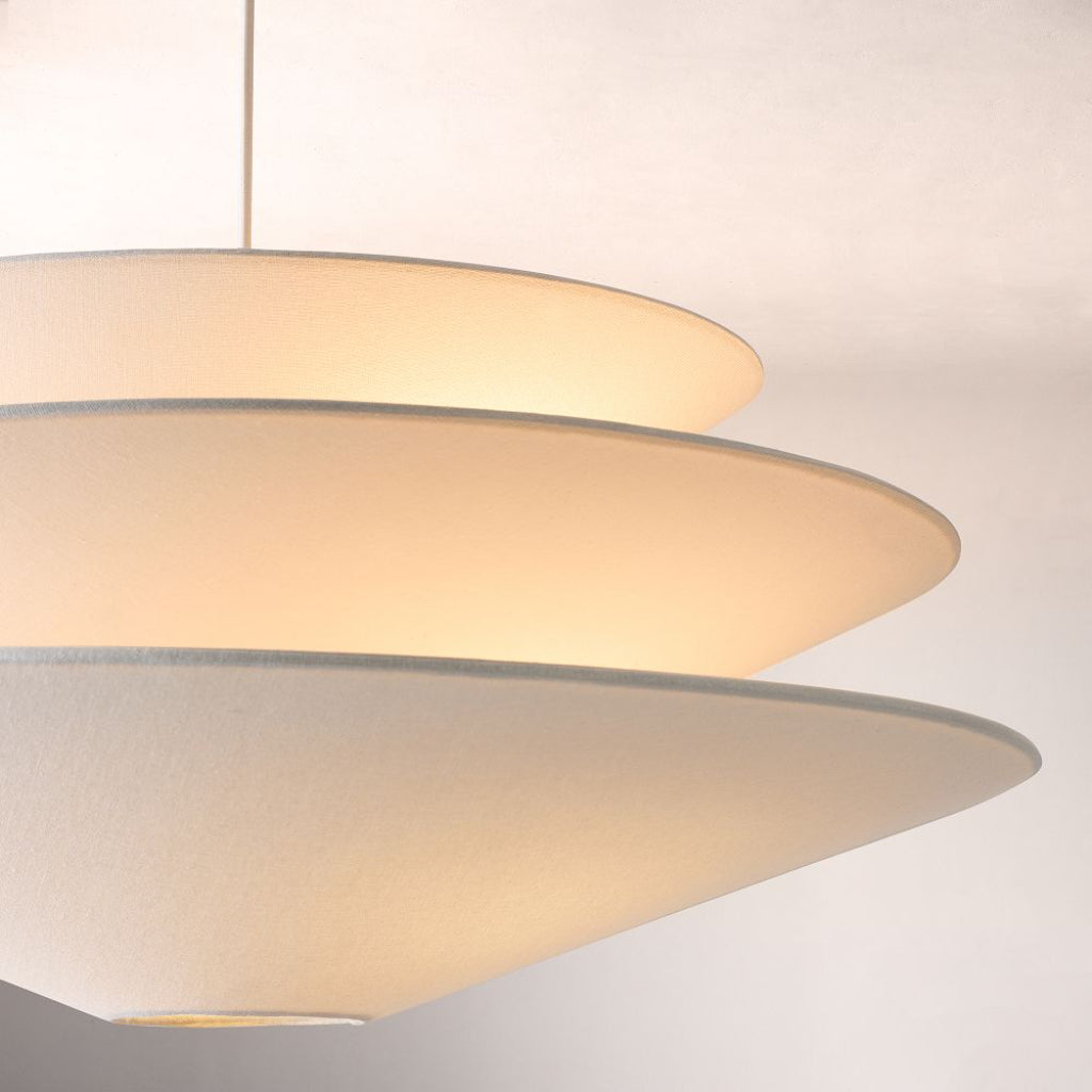 Linen cone pendant light and two-tiered fabric hanging light featuring a minimalist scandinavian design. This elegant white linen ceiling fixture is an ideal choice for your dining room, bedroom, living room, or nursery. The sophisticated double-layered shade and tapered silhouette provide soft diffused illumination while adding a touch of organic modern charm to any space. Crafted with high-quality fabric and an adjustable cord, this versatile linen pendant light combines natural textures with functional indoor lighting for contemporary home decor.