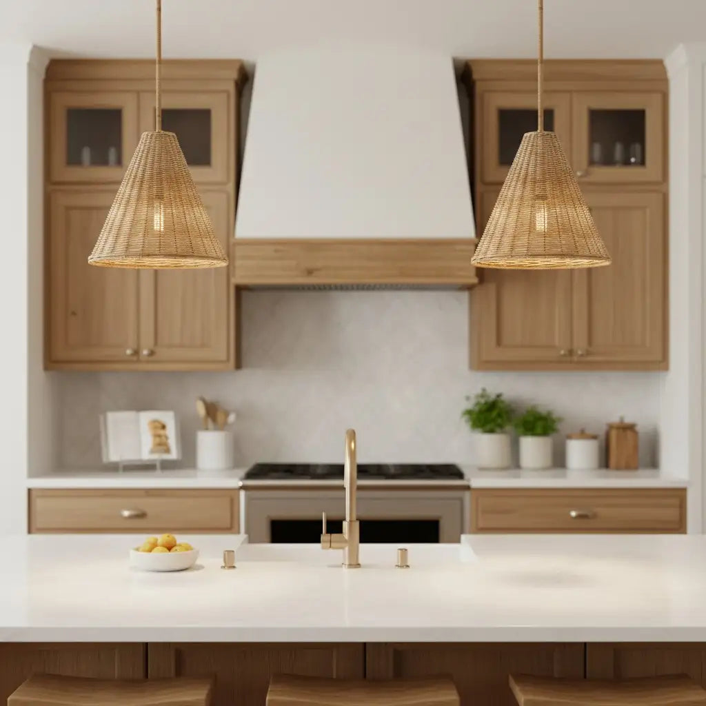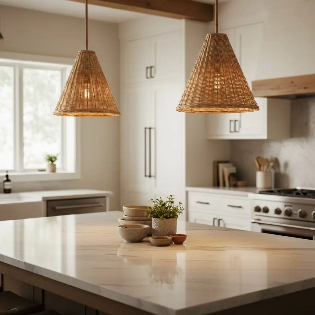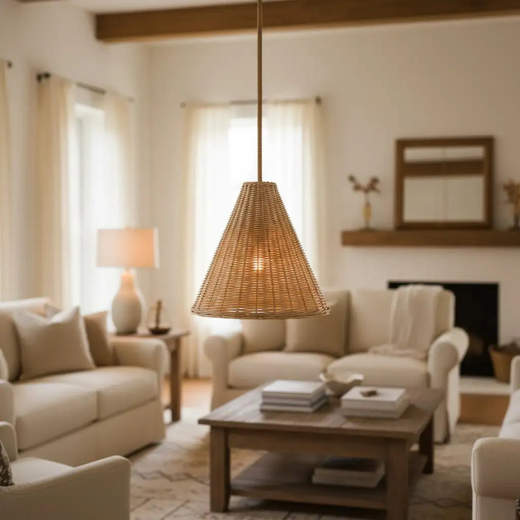 This rustic pendant light features a woven rattan cone shade, merging natural texture with farmhouse charm. Its artisanal design adds relaxed, earthy appeal to any space.