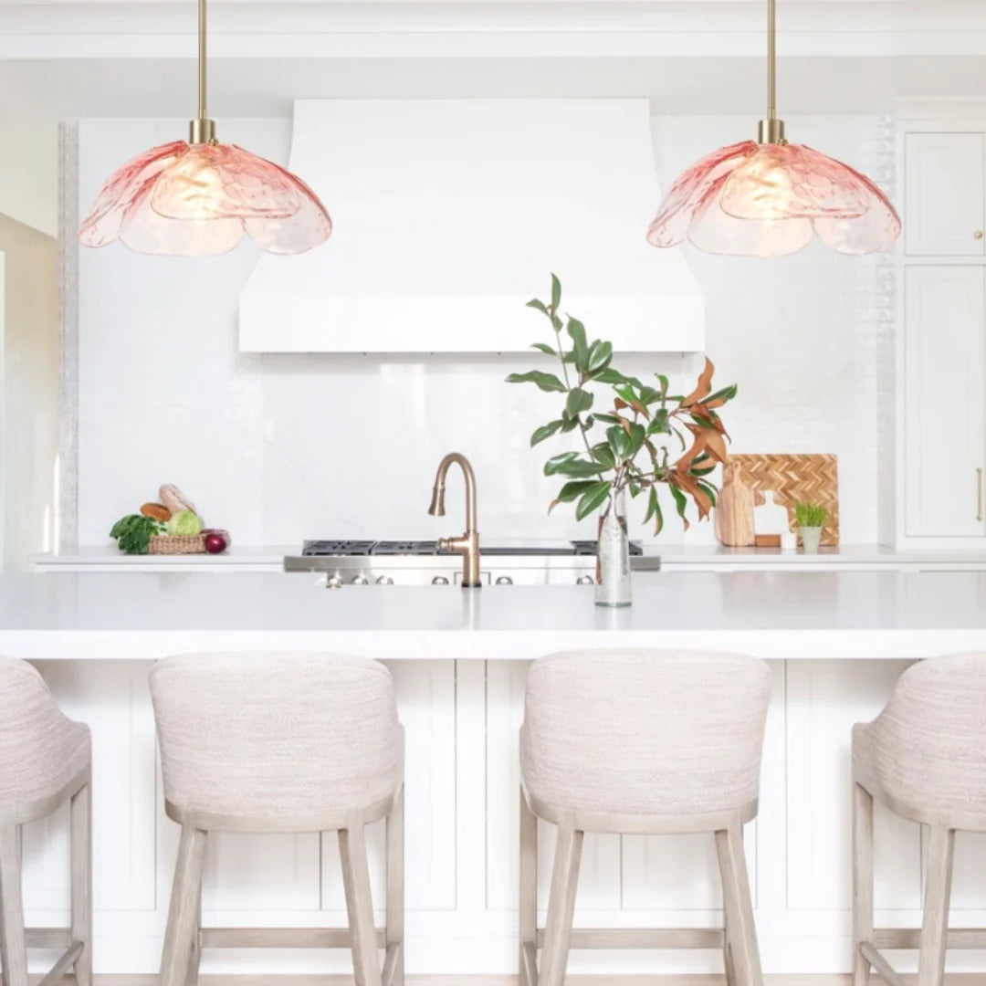 This light features a modern glass shade with tactile ripples. The elegant floral look and high-quality materials make this glass pendant light suitable for various settings.