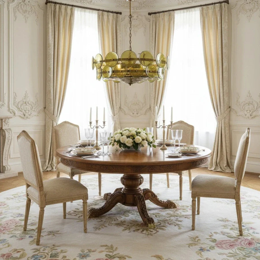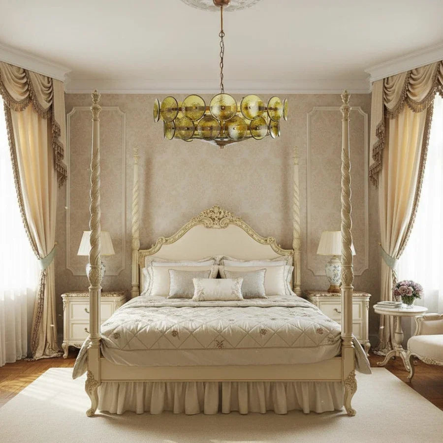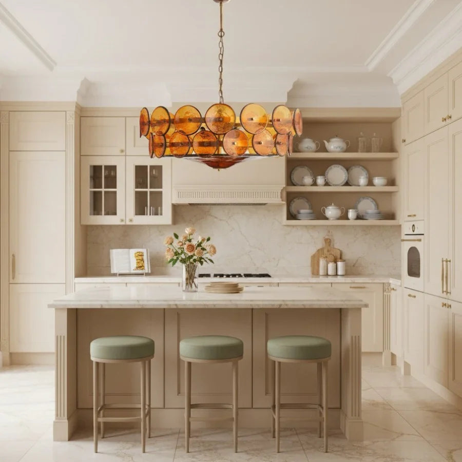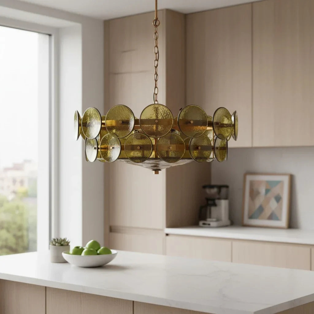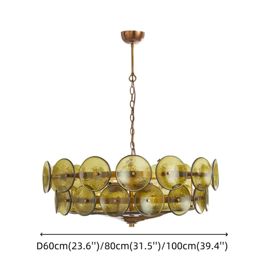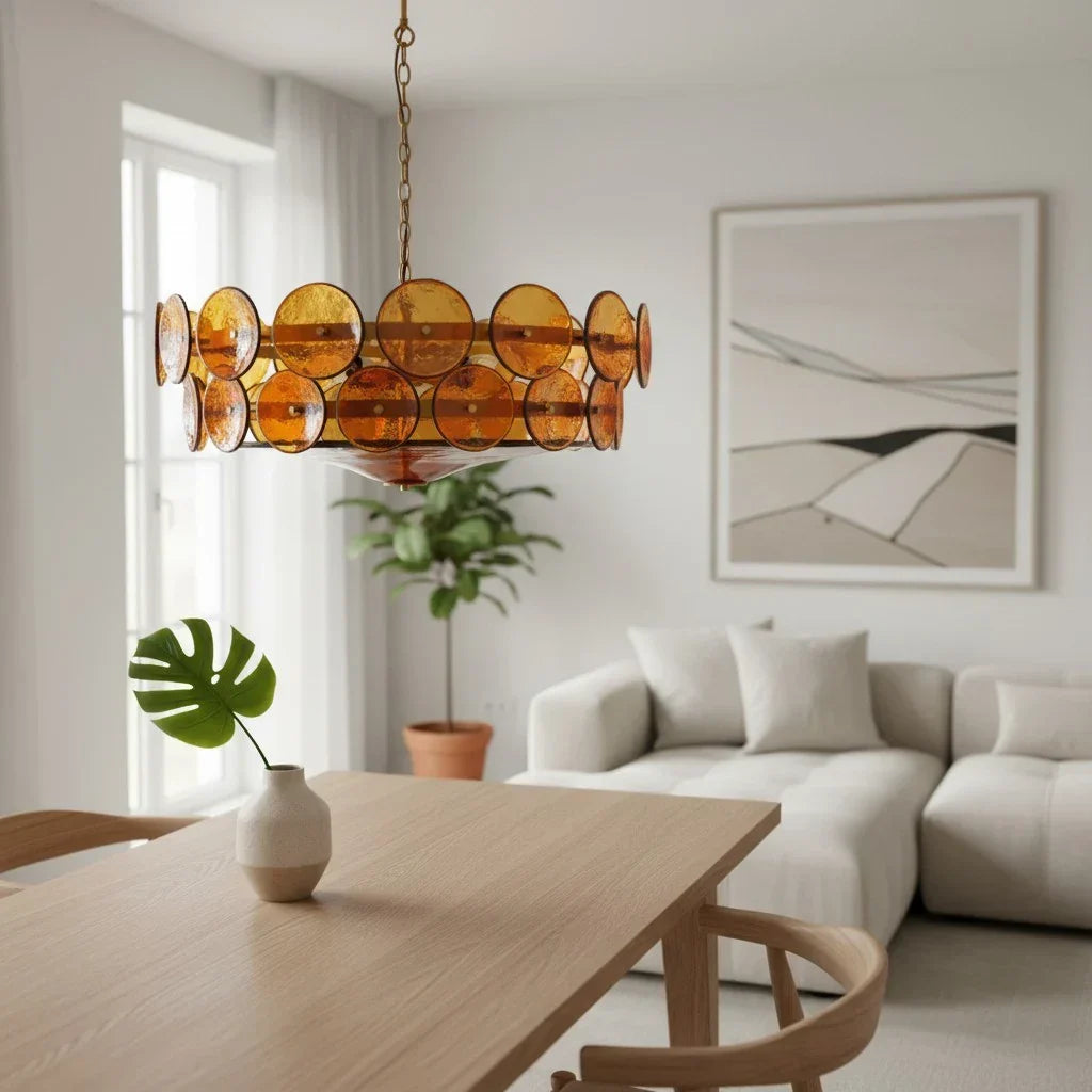 Amber Murano glass chandelier features layered circular discs in rich shades, blending vintage charm with timeless sophistication. The bronze metal frame adds classic detail, making it perfect for elegant dining rooms, welcoming living spaces.