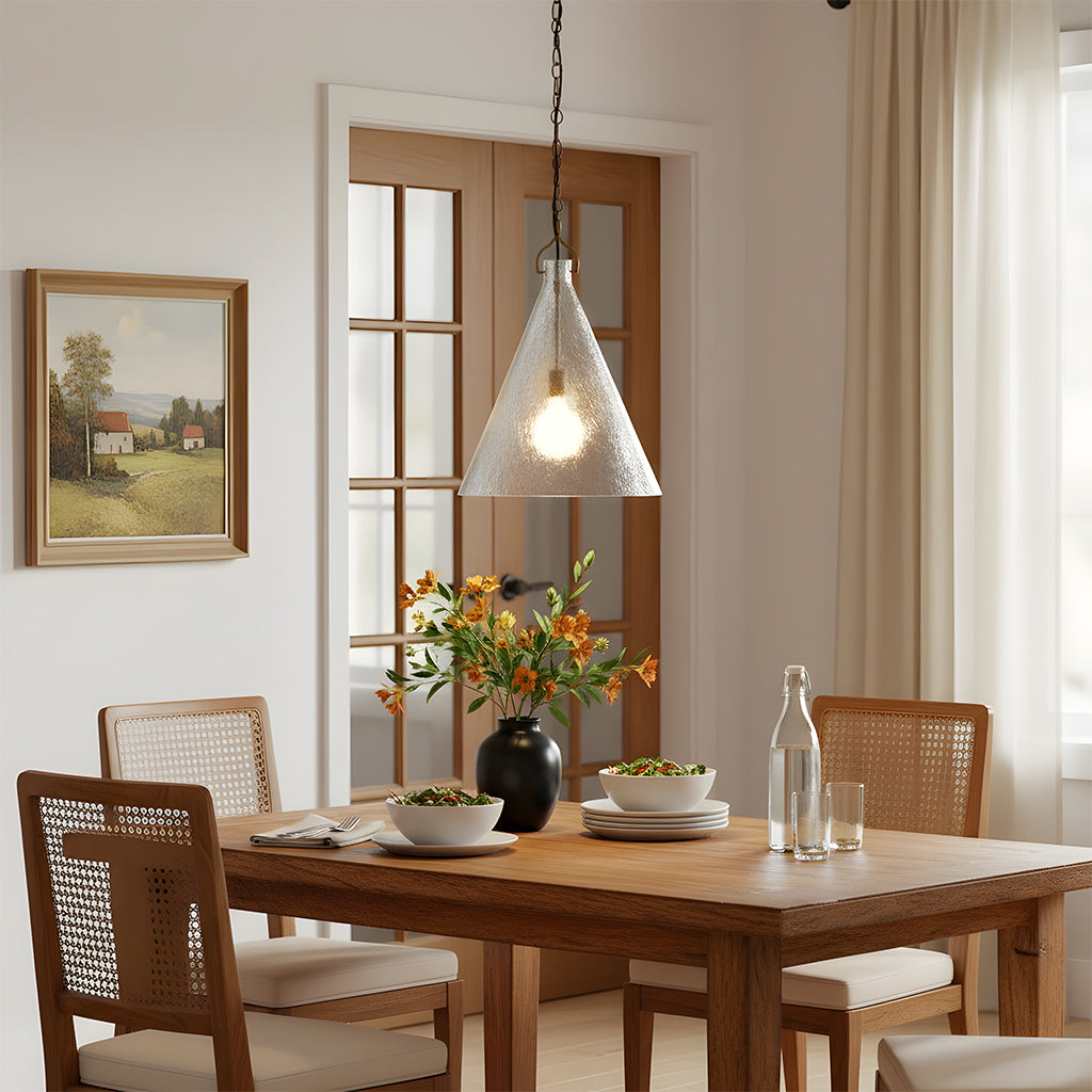 Adding a touch of modern style to any space, the Nimbus Modern Oversized Seeded Glass Pendant Light features a seeded glass cone shade, perfectly blending simple charm.