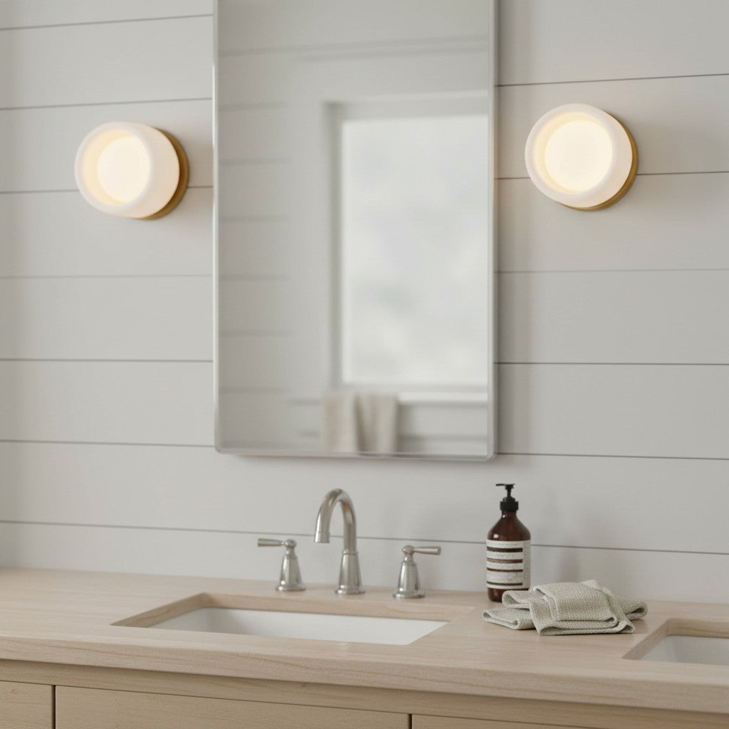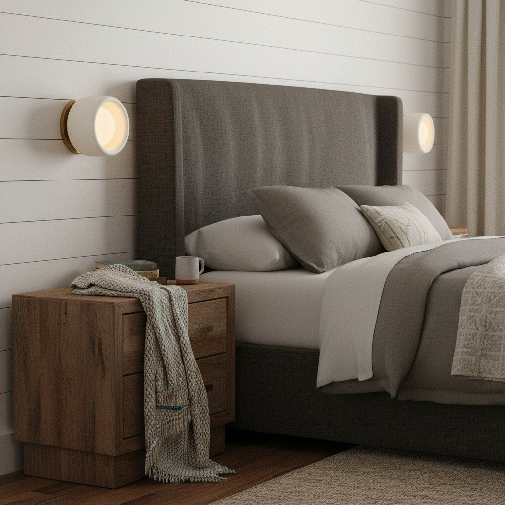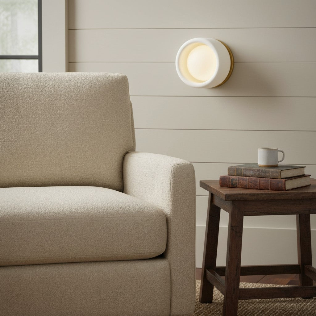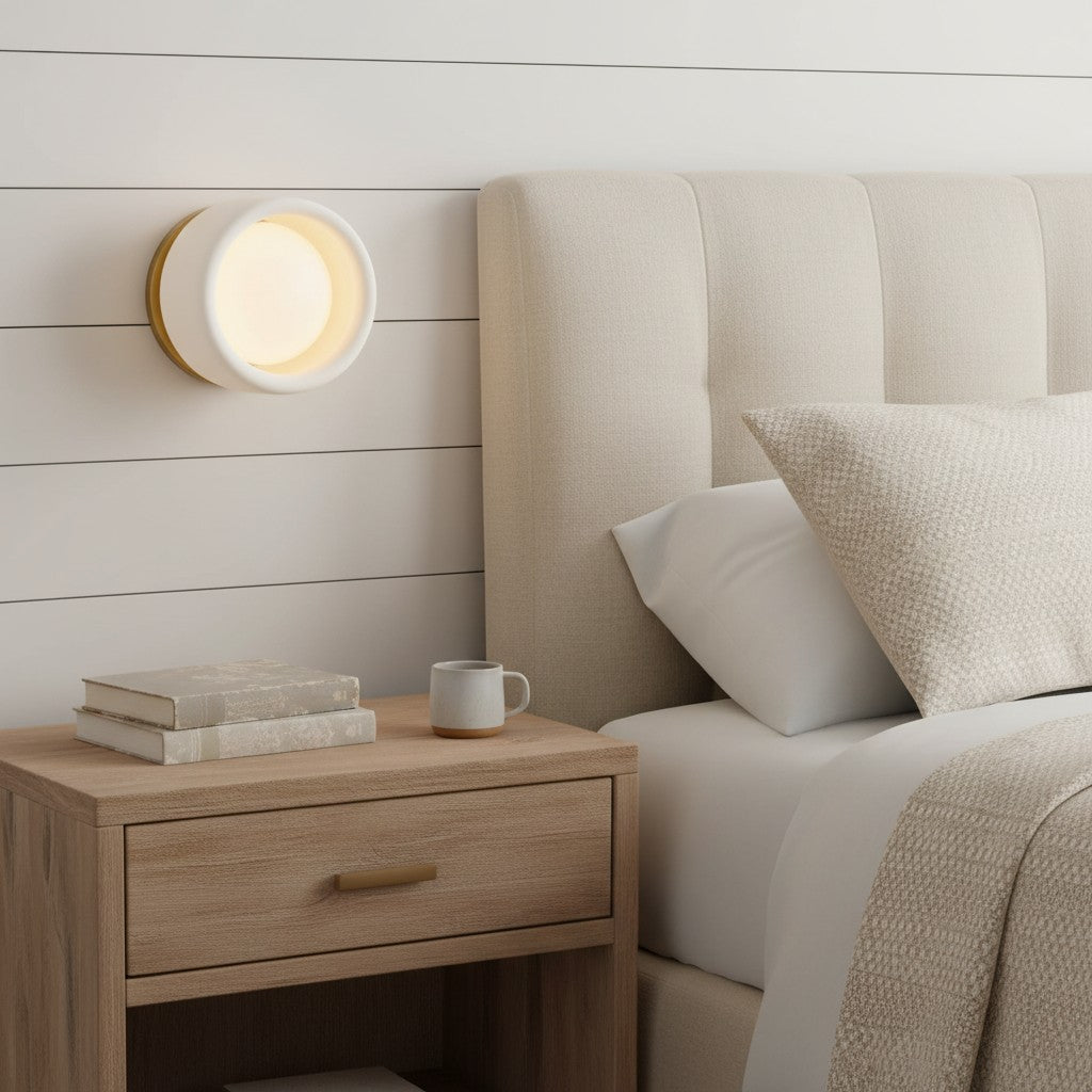Modern porcelain sconce and elegant ivory porcelain sconce featuring a refined natural shade. This minimalist indoor wall light is an ideal lighting fixture for your bathroom, bedroom, or living room. Crafted with high-quality porcelain and metal accents, it provides soft and organic illumination while enhancing your interior decor with a light, airy feel. Its low-profile design and versatile round shape ensure it blends unobtrusively into any modern or traditional space, creating a stylish and simple atmosphere.