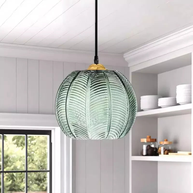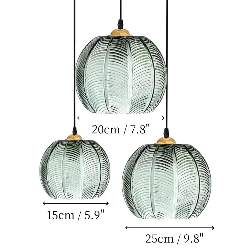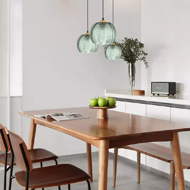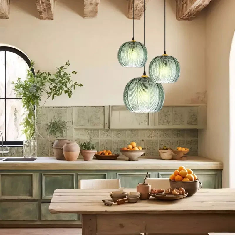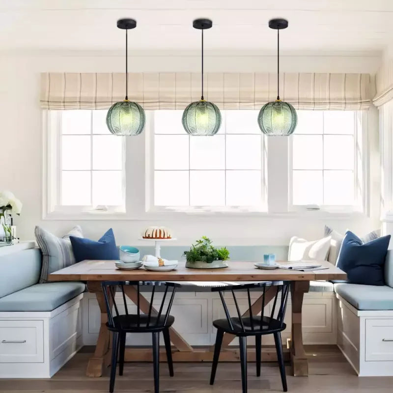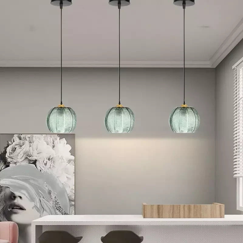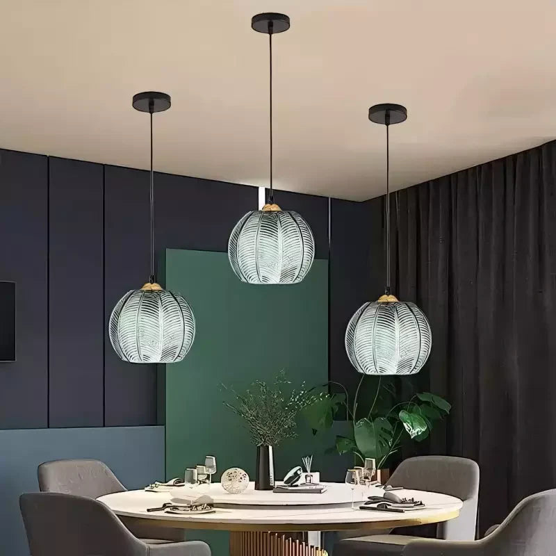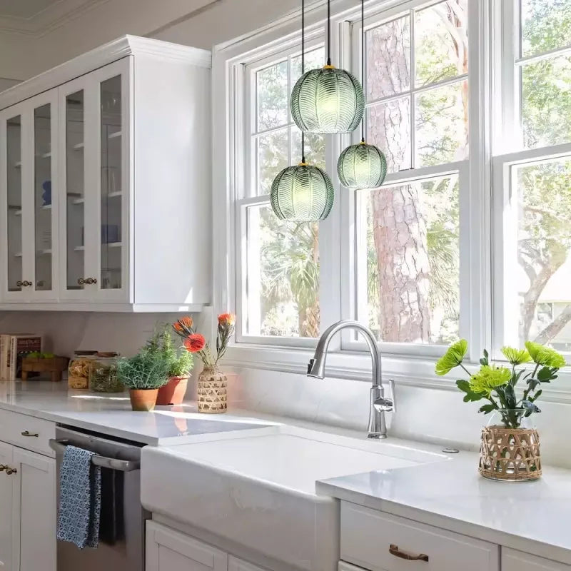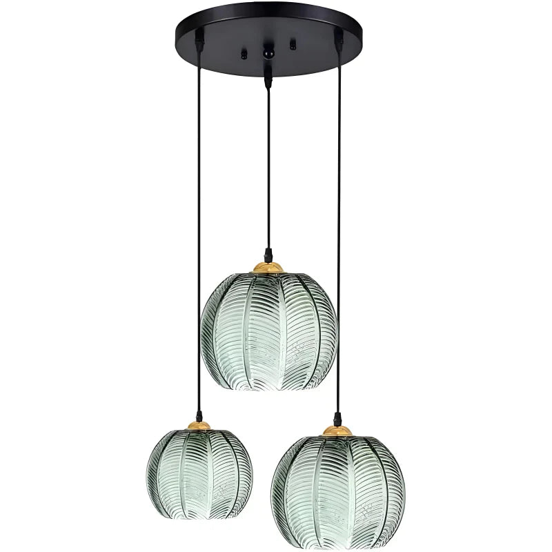 This modern pendant light is composed of ribbed glass orbs in a delightful hue, accented with stylish metal accents. Ideal for your dining room, kitchen island, or living room, its modern and sleek design will easily enhance the beauty of your space.