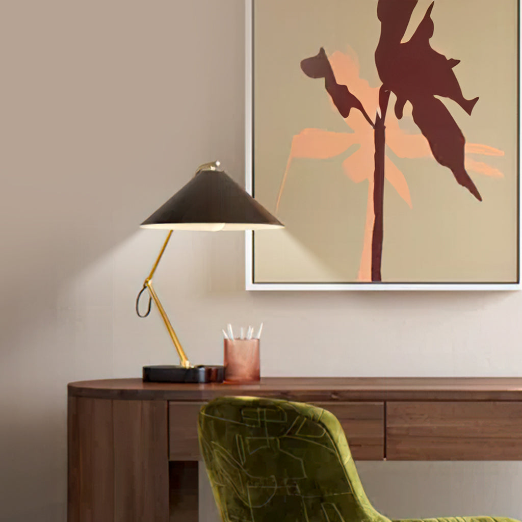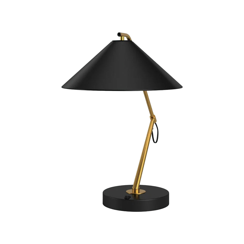 Add style and function to your space with this modern black and gold desk lamp. Featuring a sleek conical shade and adjustable brass-finished arm, it delivers focused light with a touch of mid-century charm. Ideal for workspaces, reading corners, or bedside tables, this durable metal lamp combines elegance and versatility.
