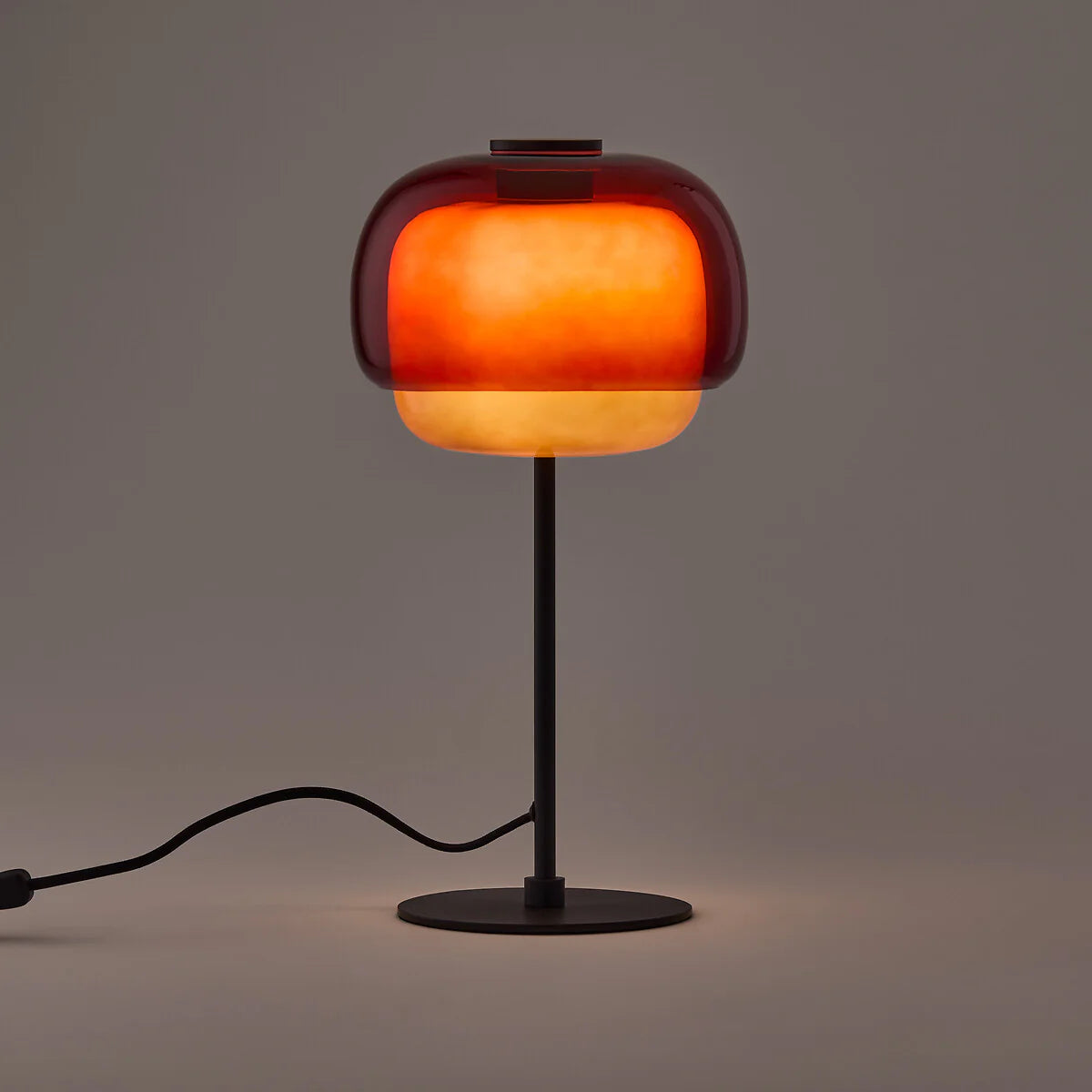 Crafted from layered glass in complementary tones. The top half of each shade is richly colored and semi-transparent, while the bottom offers a soft, milky opacity—together creating a delicate interplay of light and color.