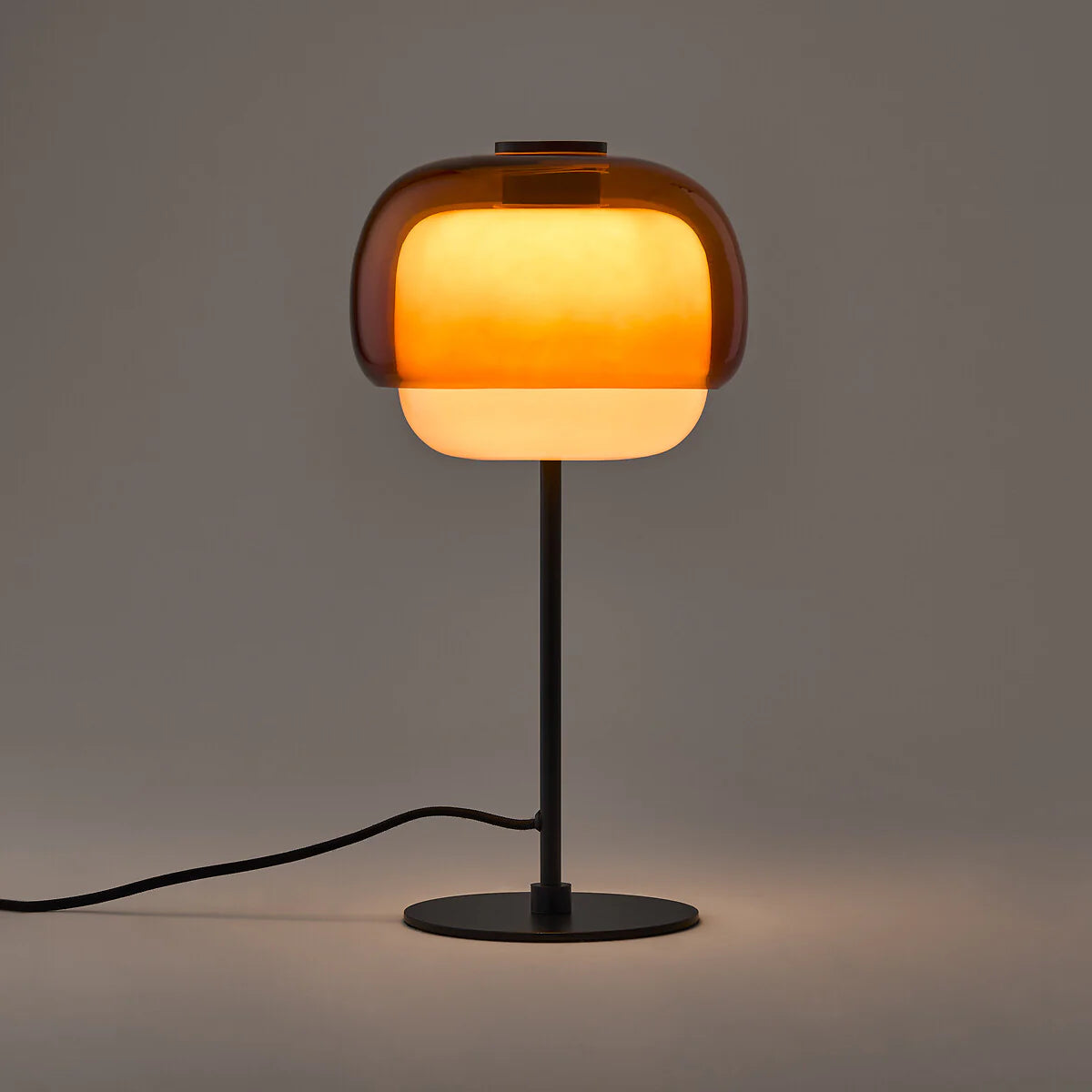 - Combines translucent amber and soft milky glass