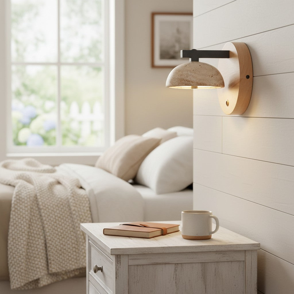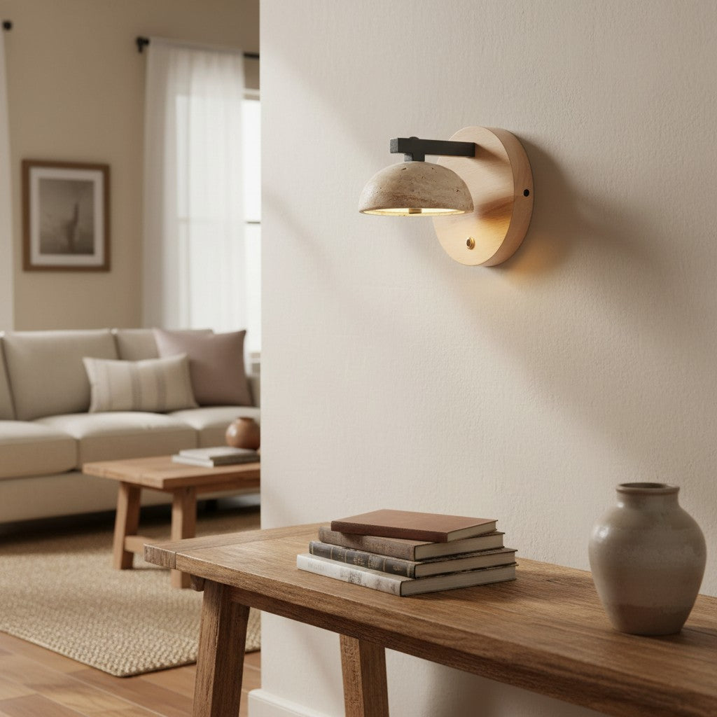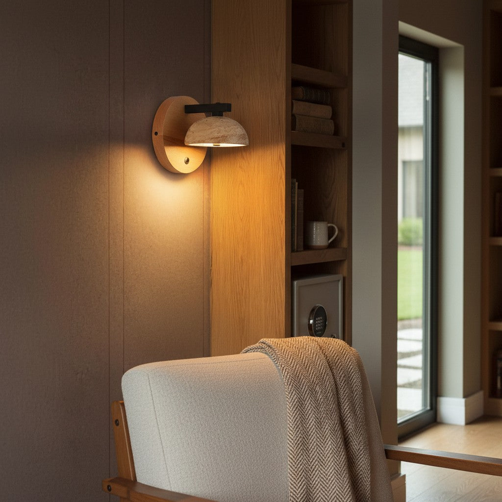 The Riley wall lamp cleverly blends natural travertine and solid wood, embodying a minimalist, vintage feel. Its soft light easily creates a soothing ambiance, perfect for establishing a tranquil retreat indoors.