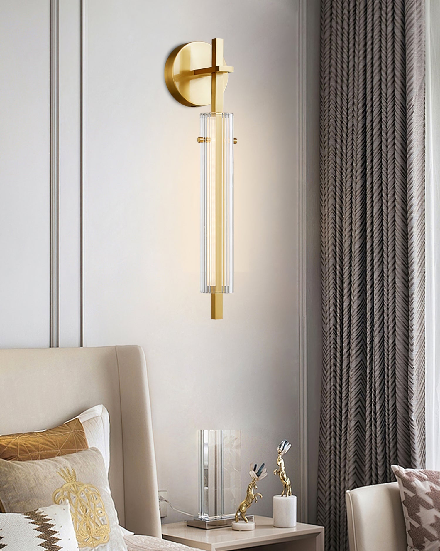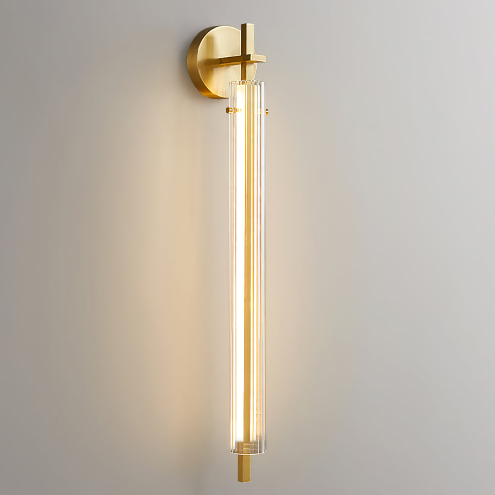 Illuminate your space with style and sophistication with the Beacon Wall Lamp. Its sleek design and brass finish add a touch of elegance to any room. Featuring a long, vertical bar, this lamp emits a warm and alluring glow for the perfect ambiance.