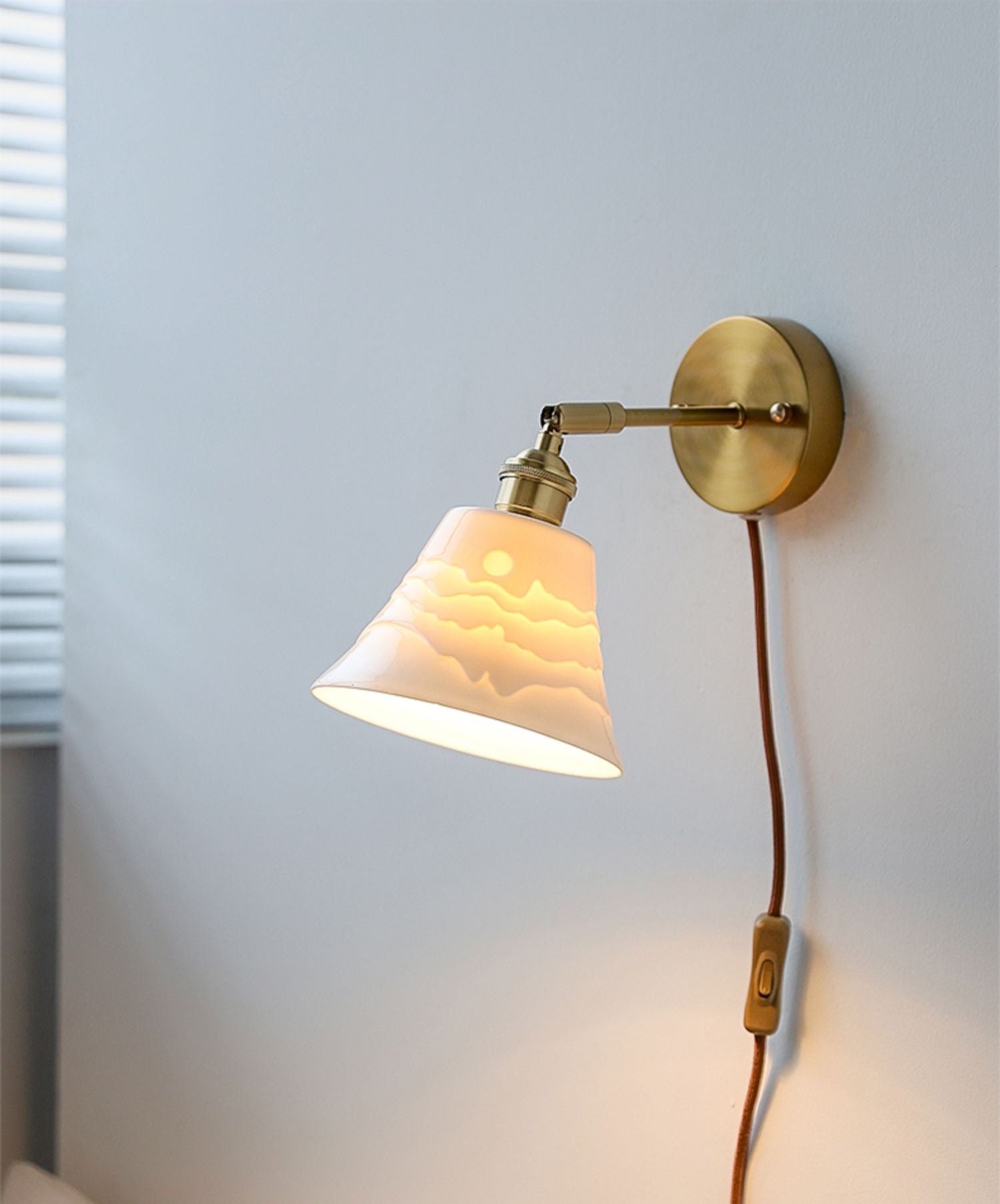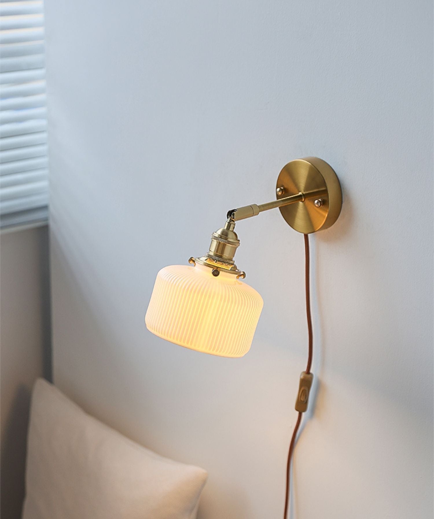 This brass wall lamp with a ceramic lampshade is an ideal contemporary solution for lighting up your room. Its flexible arm gives you the freedom to hang it on any wall or display table and it is easy to install as there are no wires needed.
