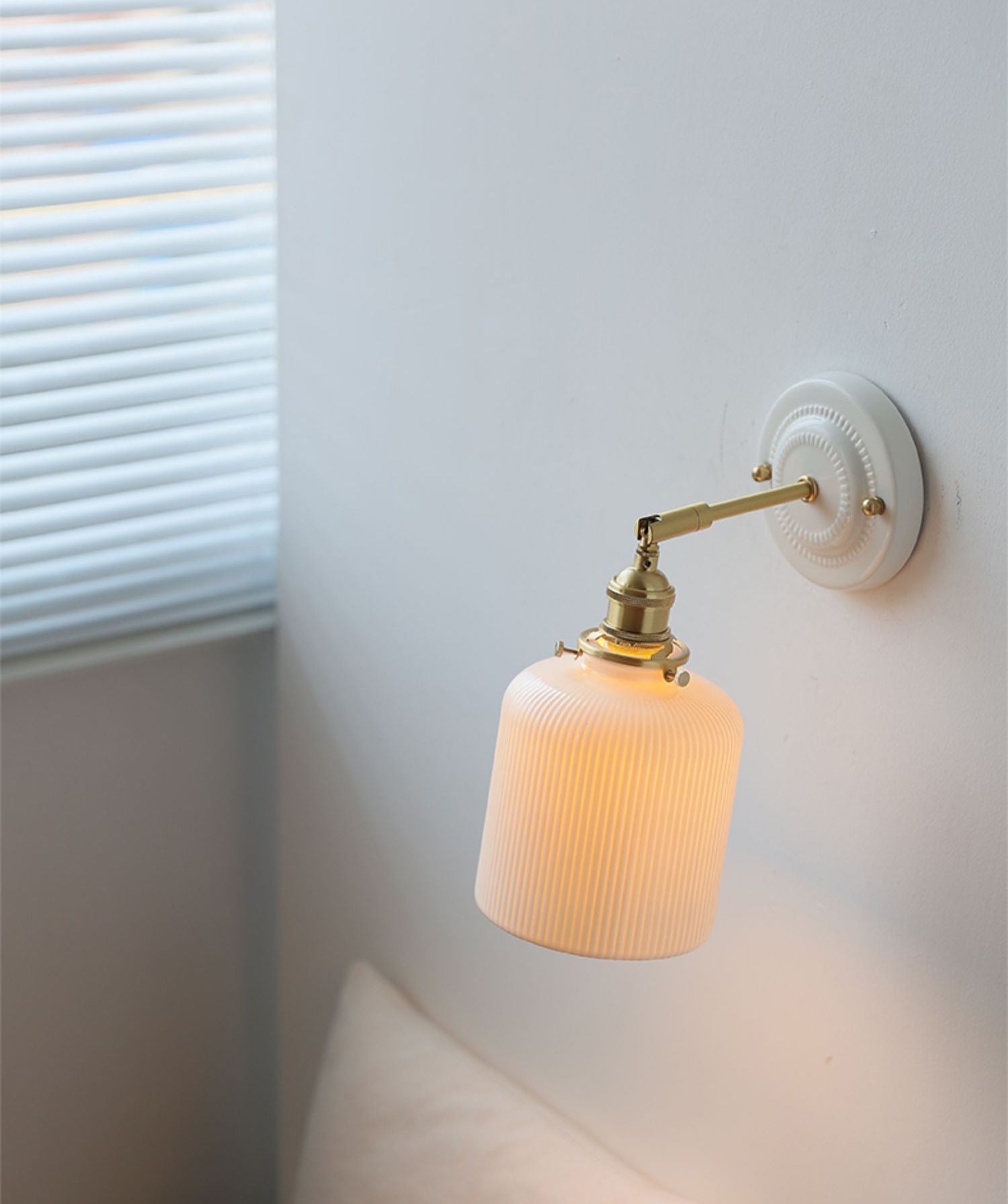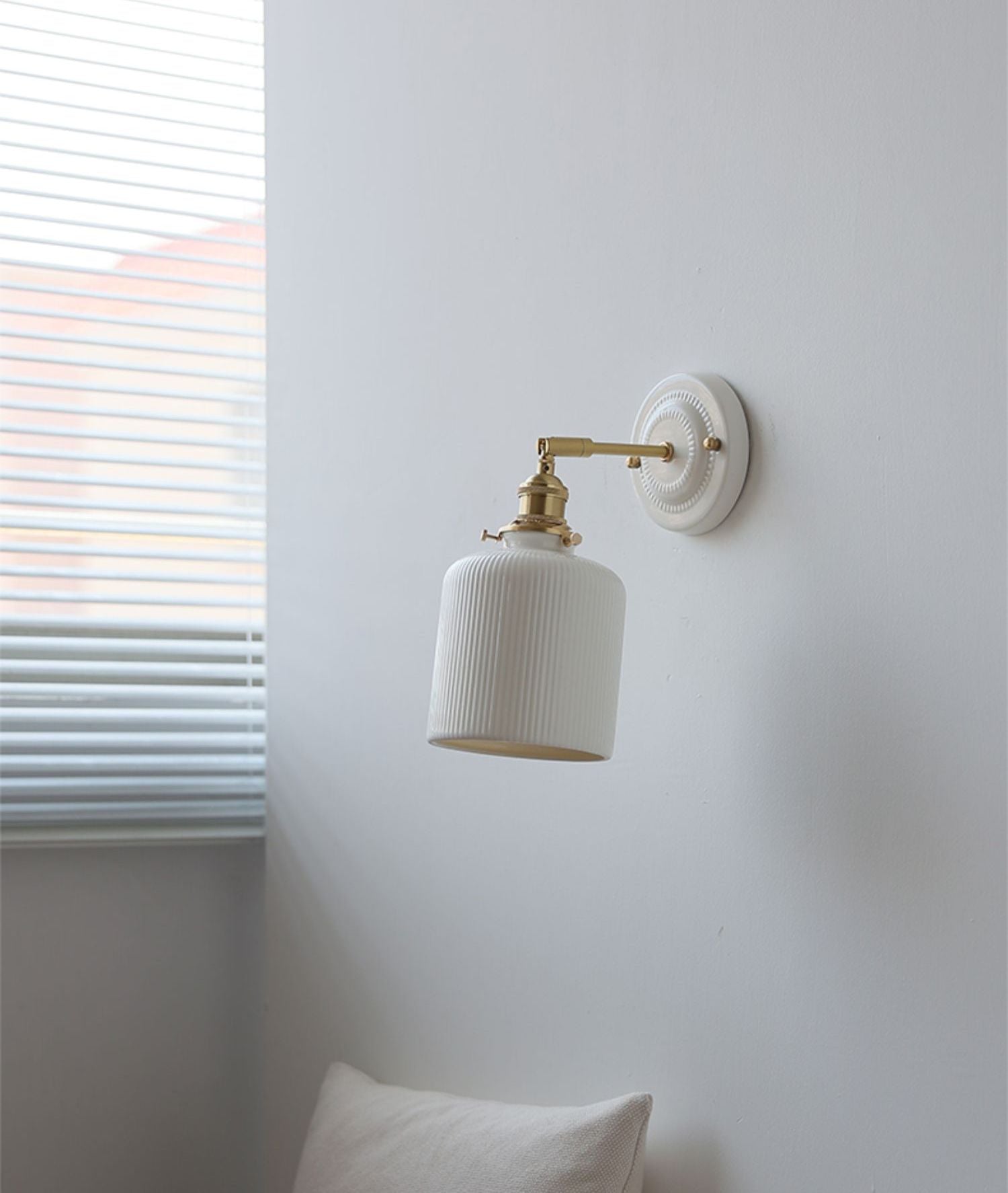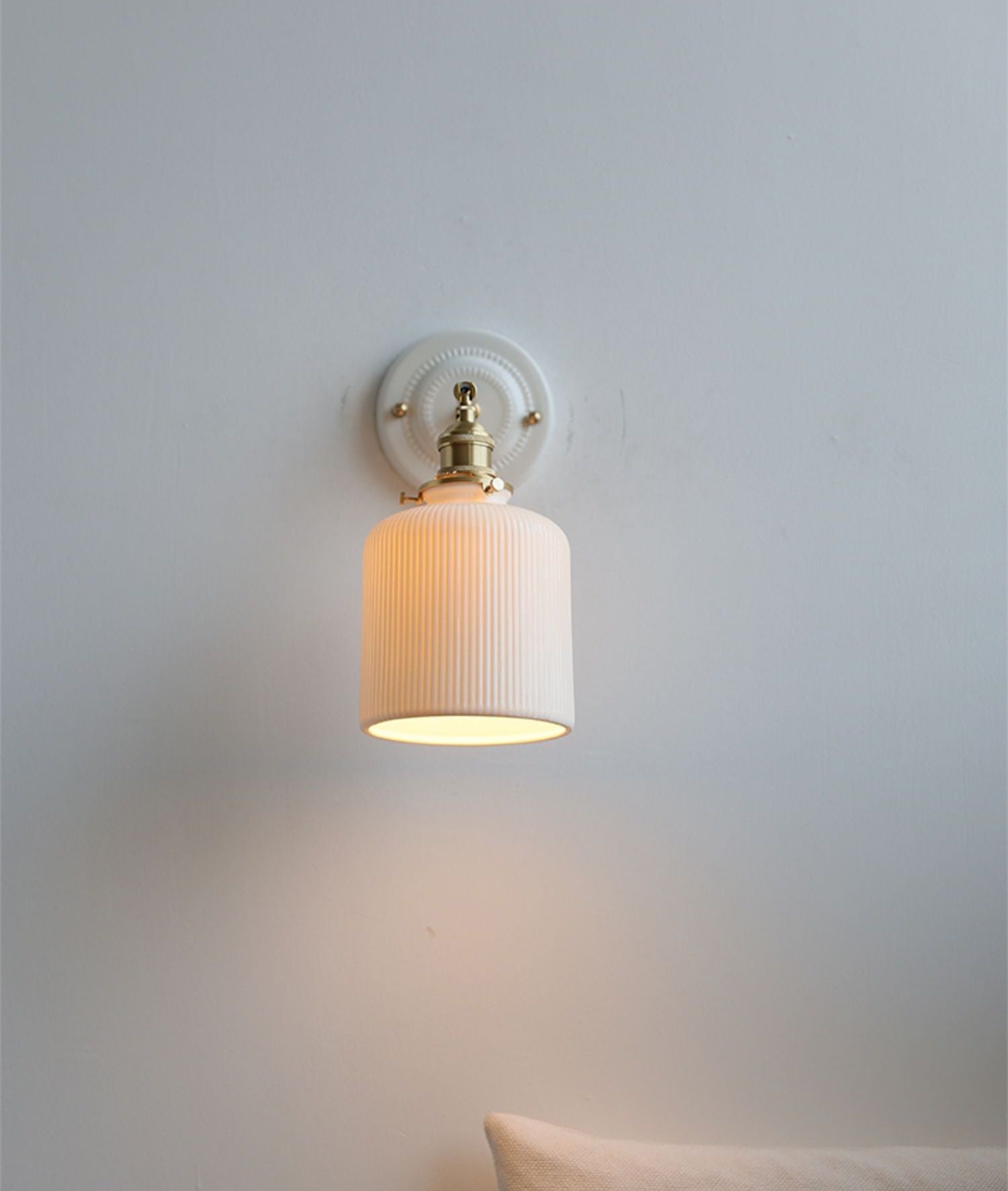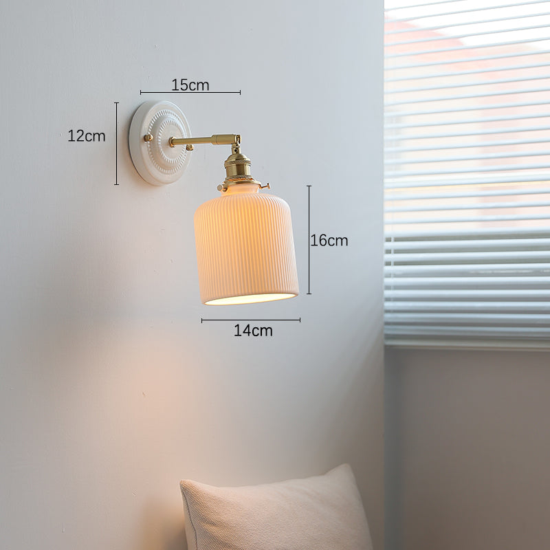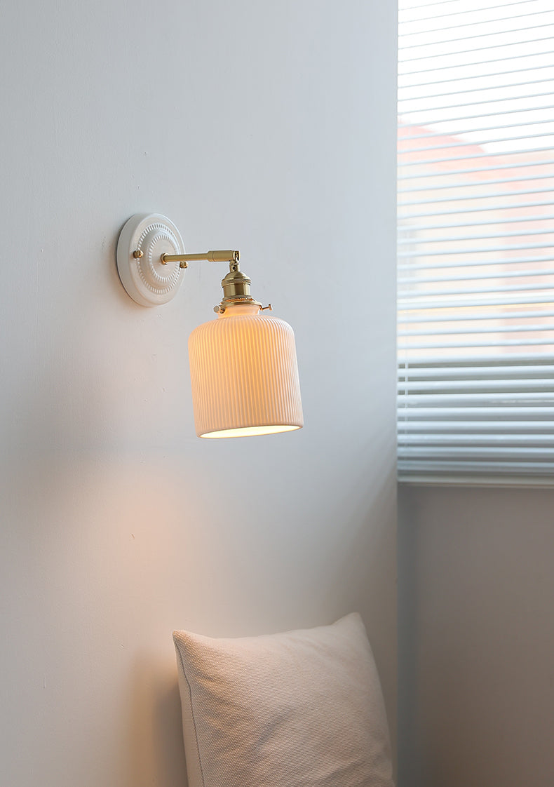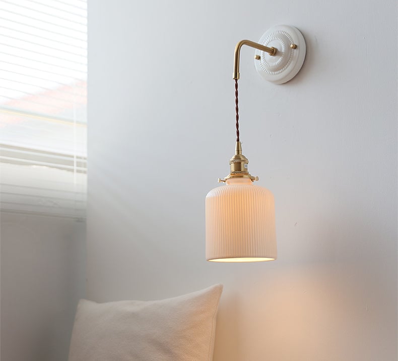Decorative wall light with a ceramic lampshade and wall plate. The light can be customized as a plug-in or pull chain. It also has a neutral white color that can be incorporated into any space. The brass finish will add style to any modern decor.