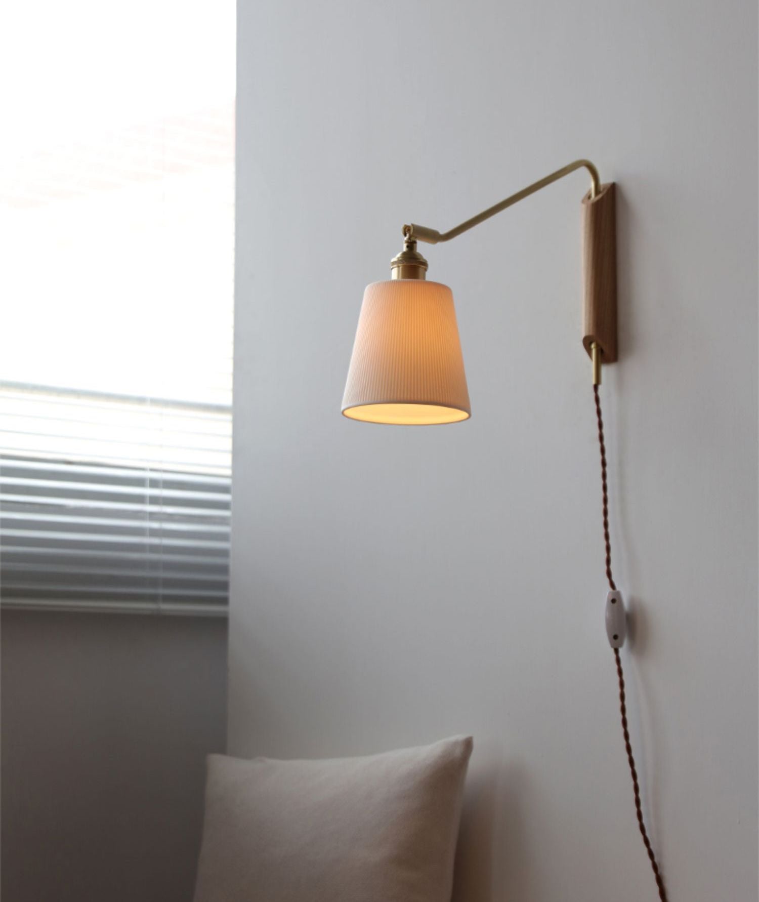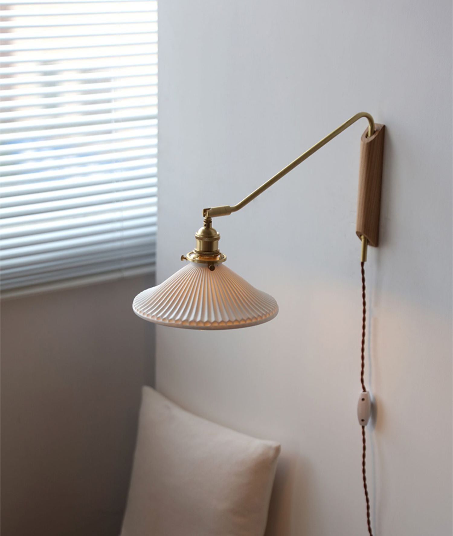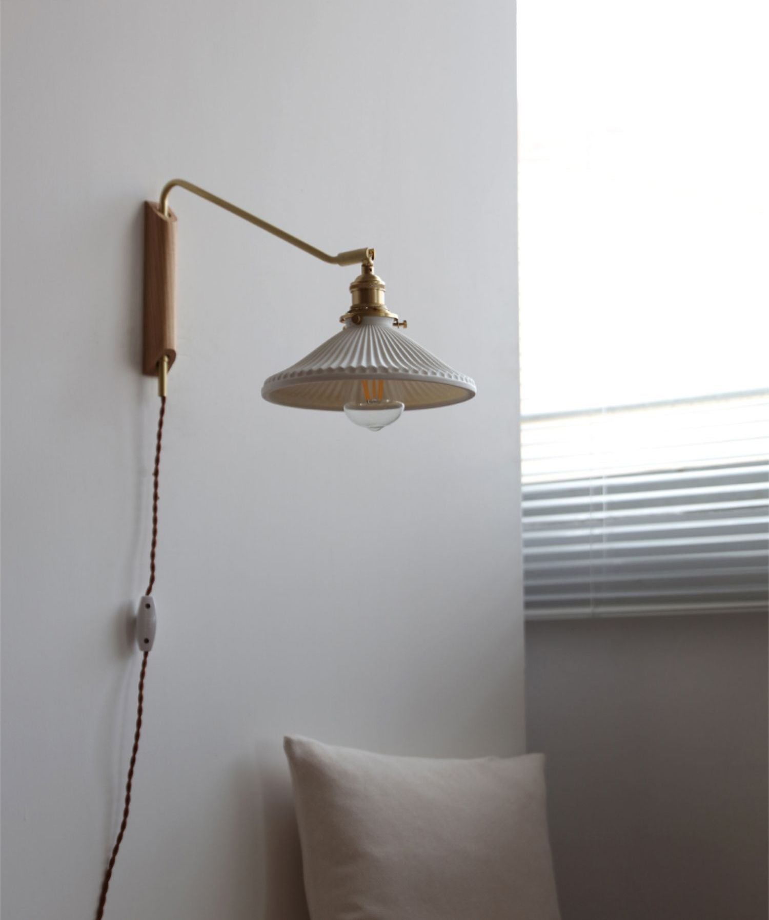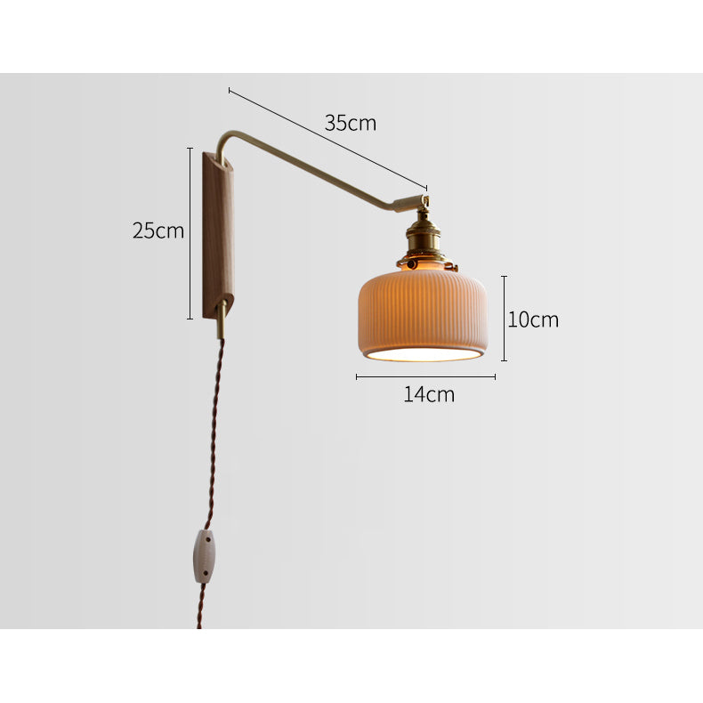 Add a touch of class to your decor with this swing arm plug-in wall light inspired by the timeless aesthetic of sleek metal and wood, featuring a light fixture made from natural wood, brass hardware, and a ceramic lampshade that adds a wonderful aesthetic to any space.