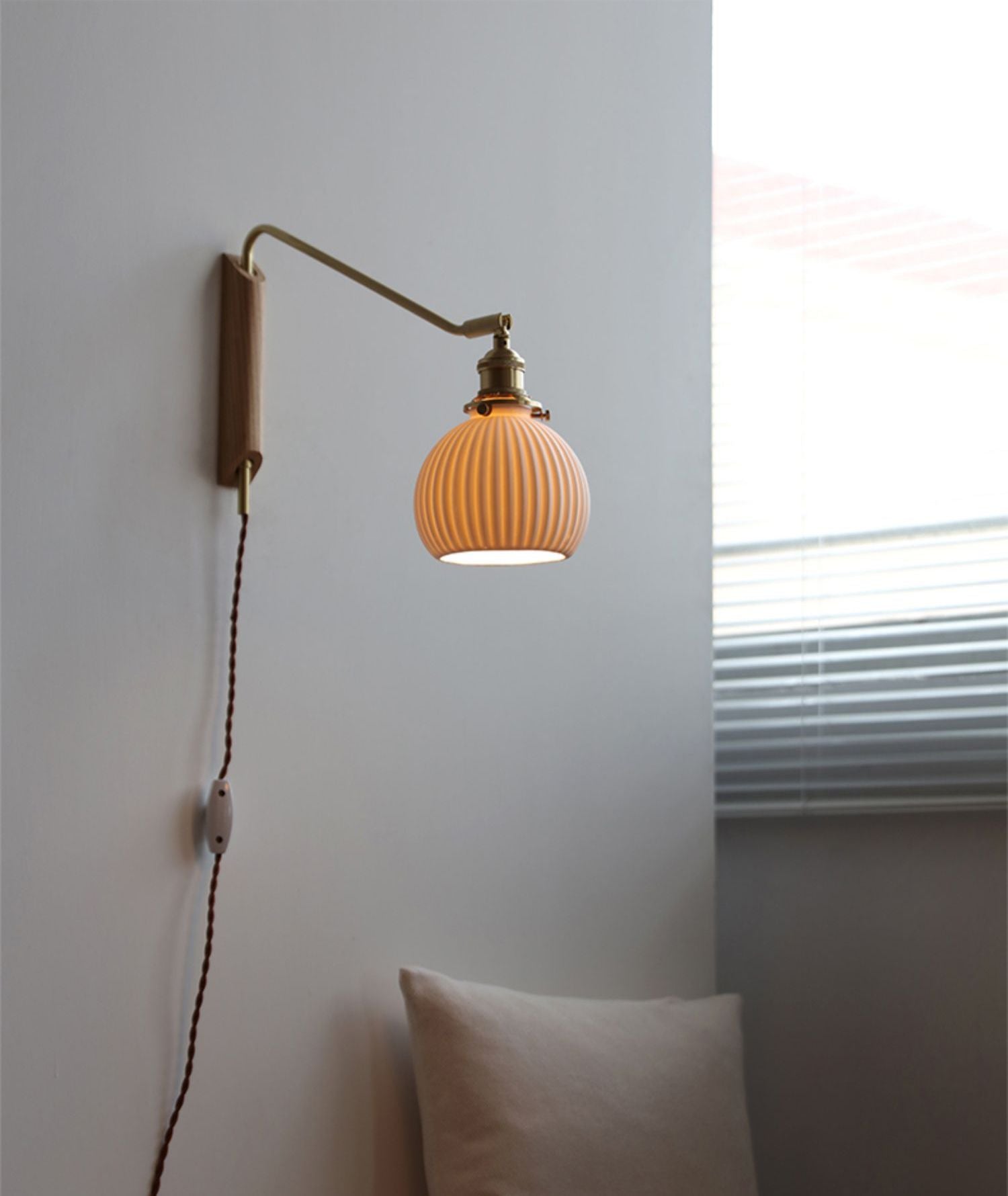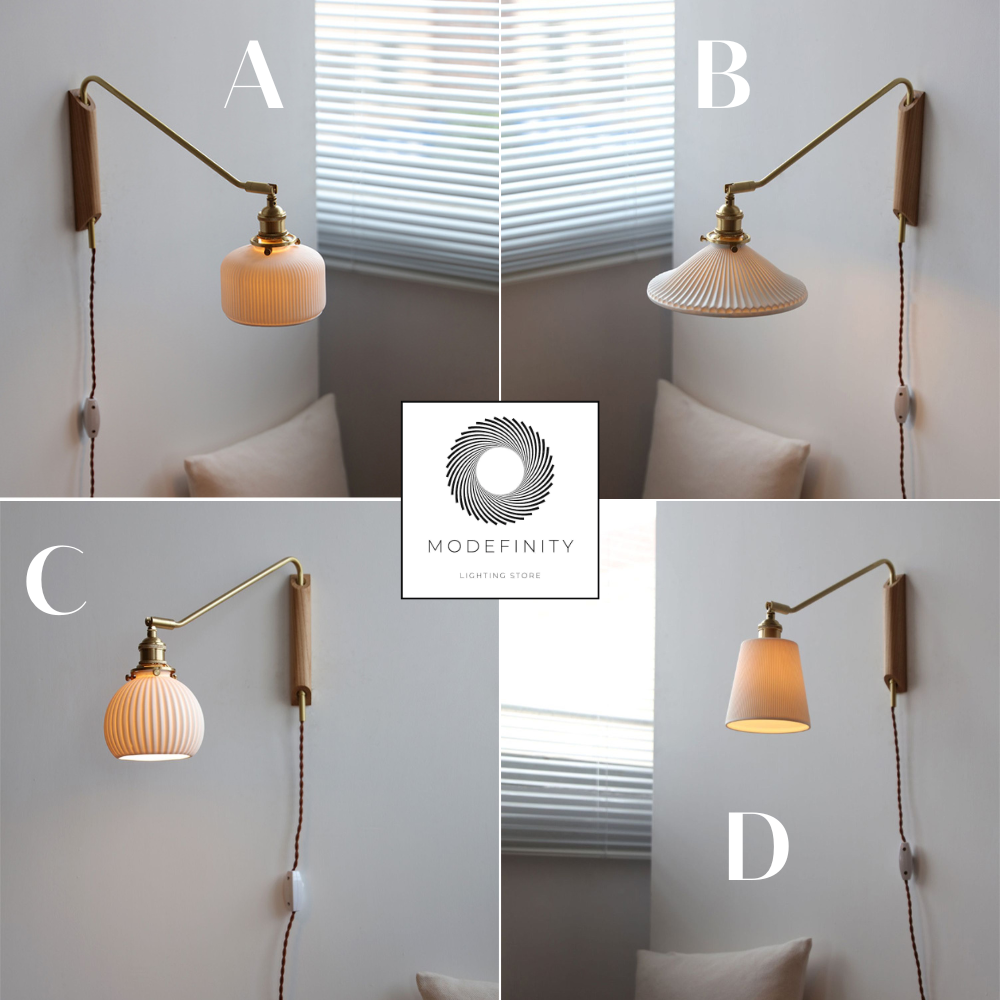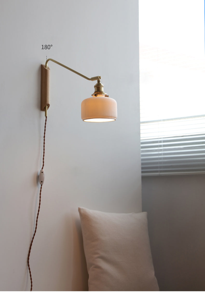 Add a touch of class to your decor with this swing arm plug-in wall light inspired by the timeless aesthetic of sleek metal and wood, featuring a light fixture made from natural wood, brass hardware, and a ceramic lampshade that adds a wonderful aesthetic to any space.