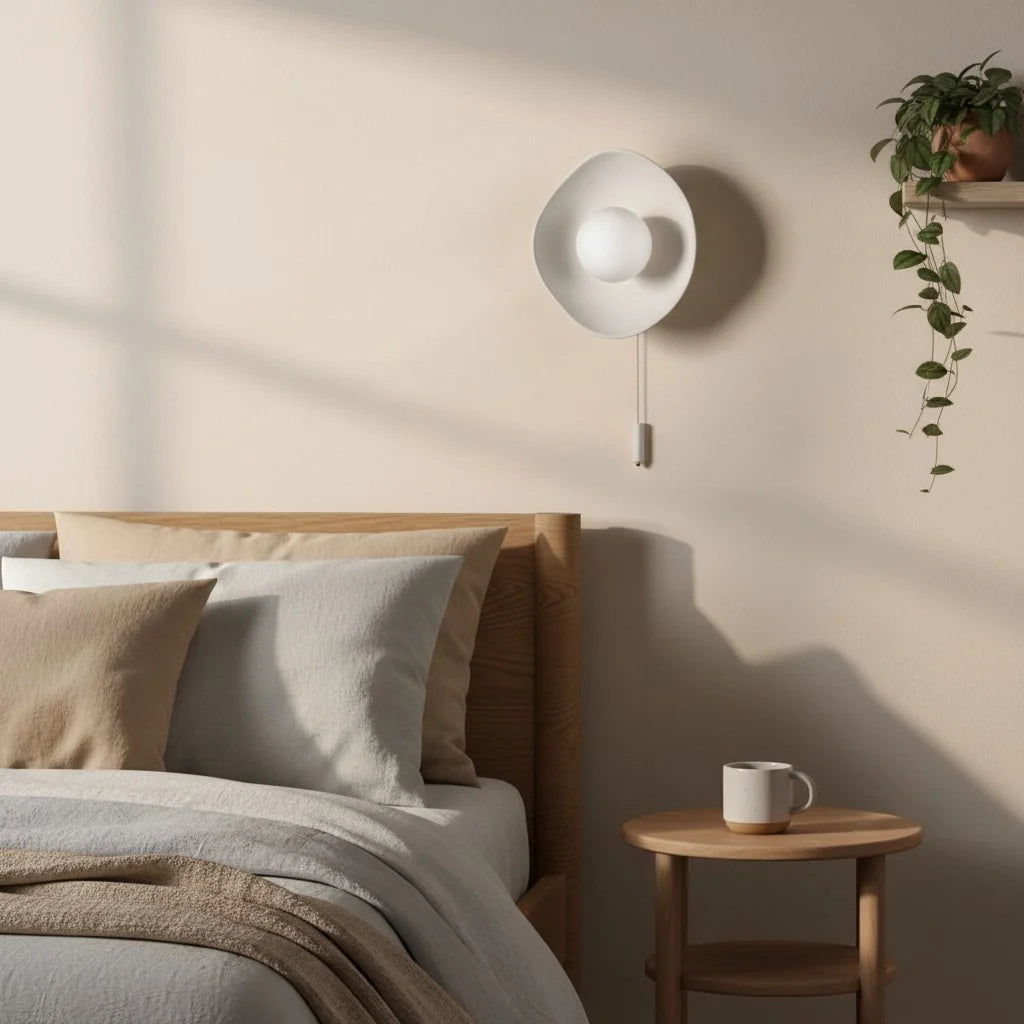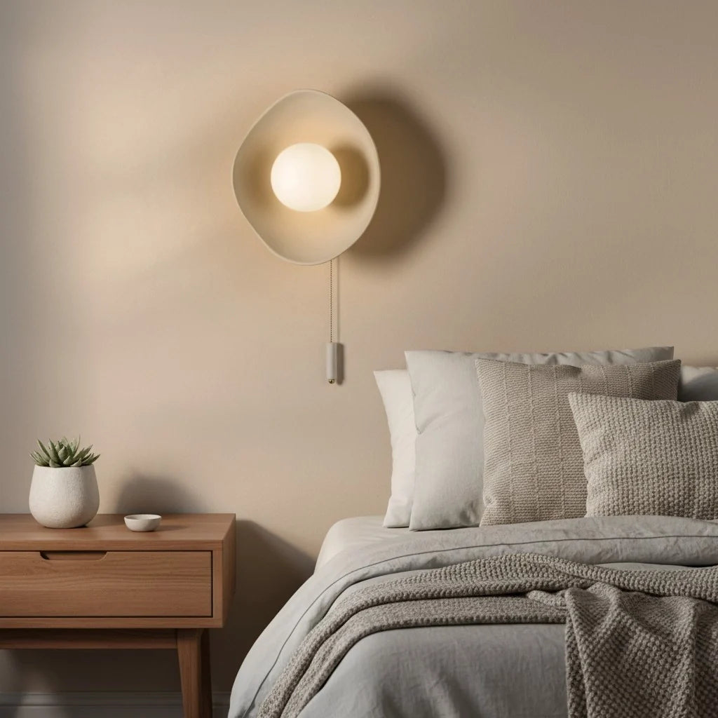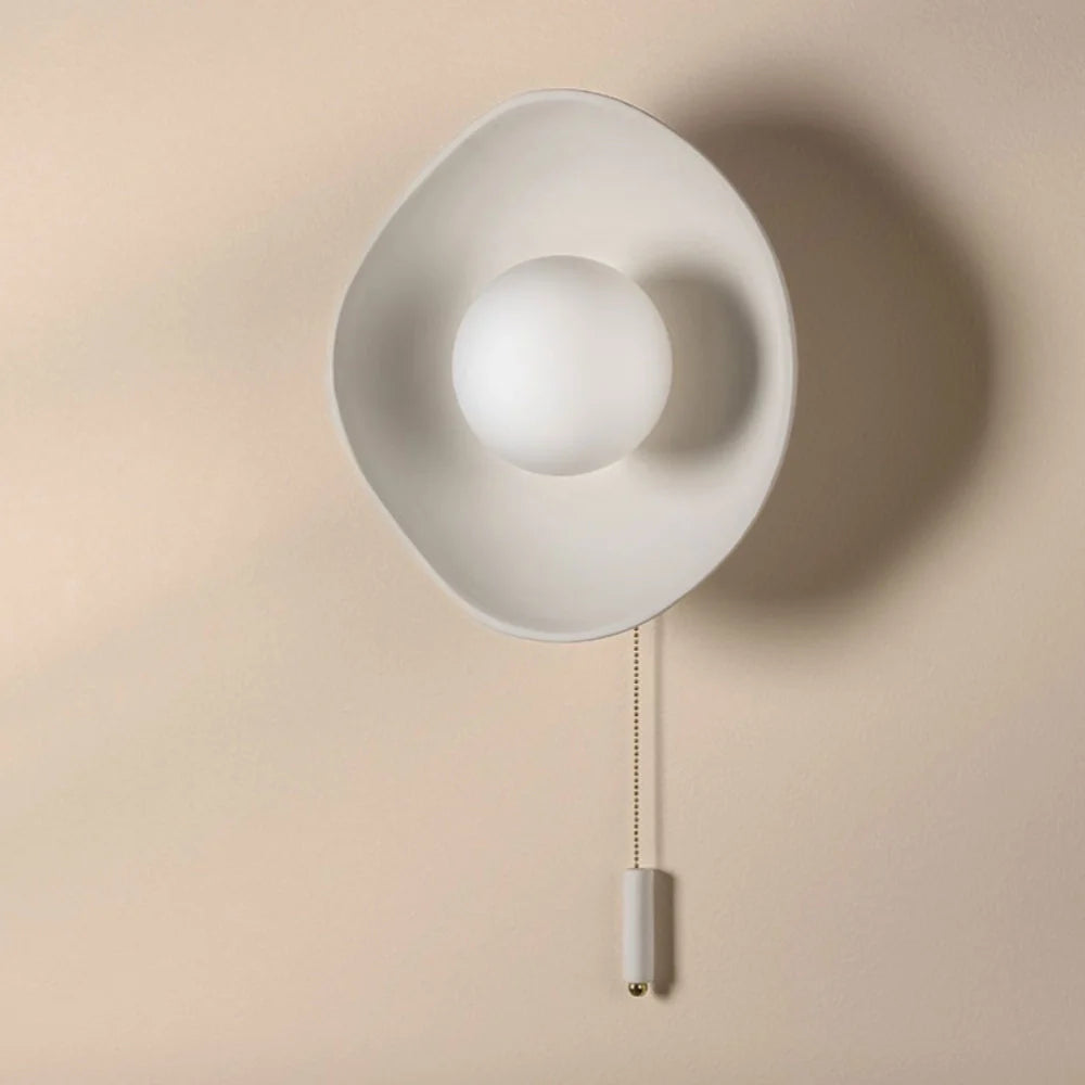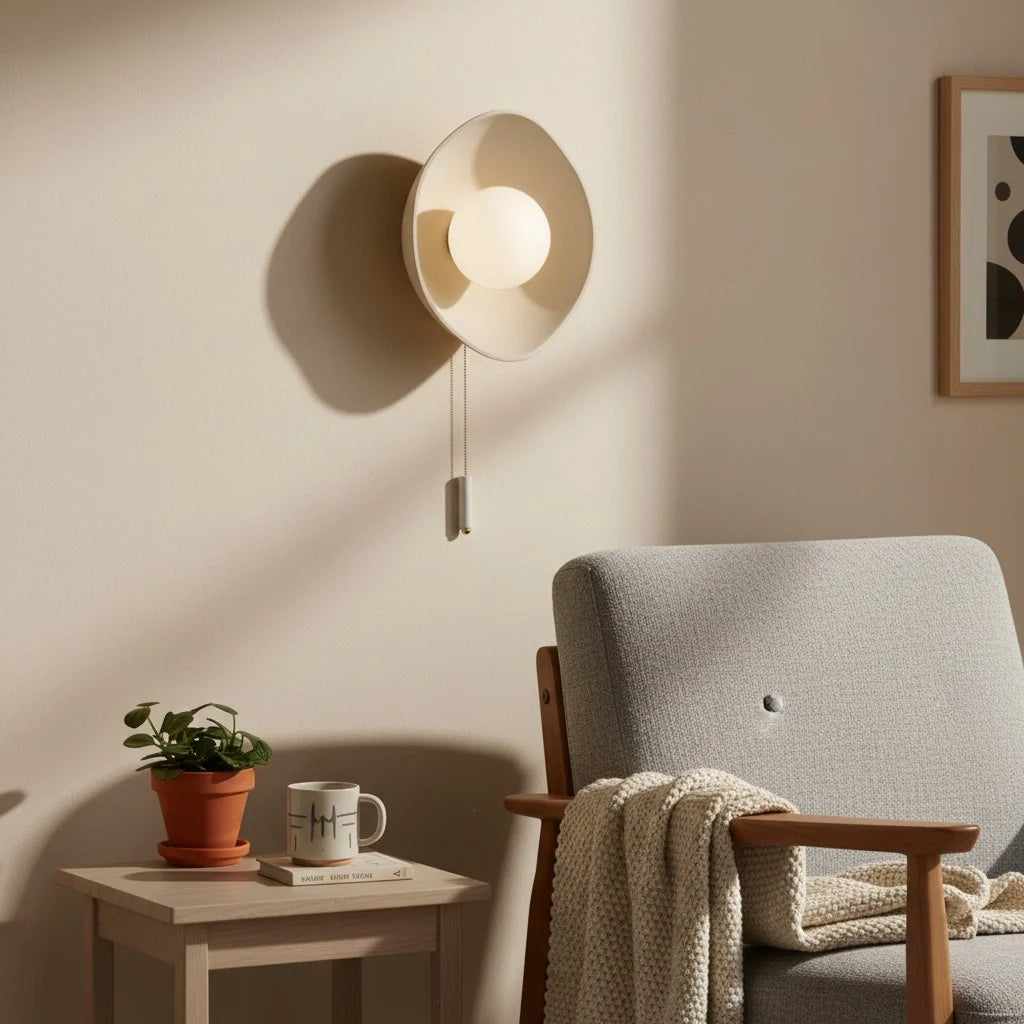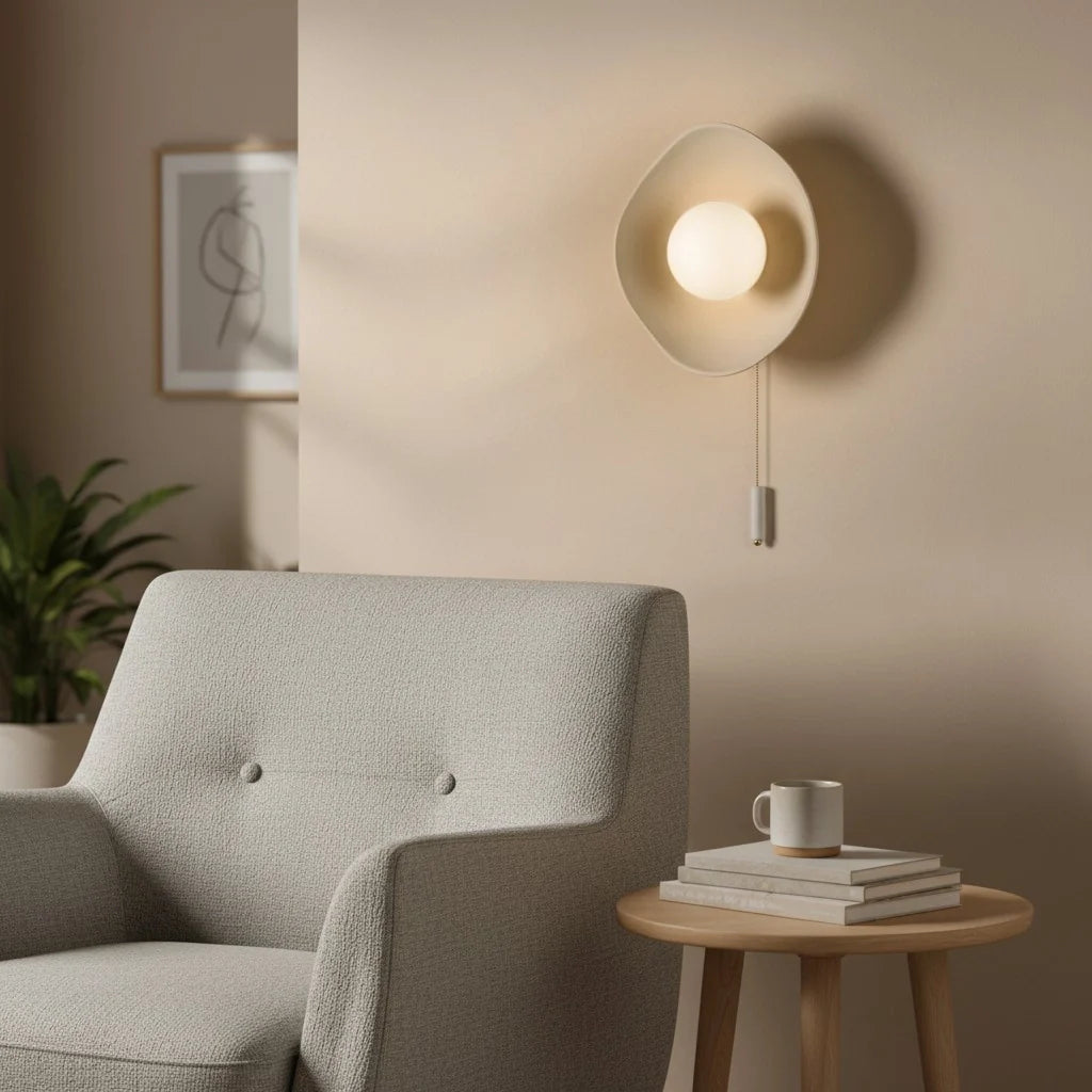 This wall sconce features a curved ceramic shade, globe bulb, and pull-chain switch, casting soft ambient light. Ideal for bedrooms or entryways.