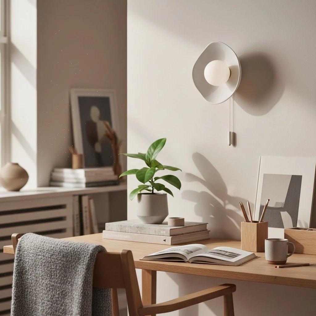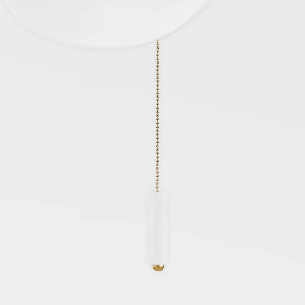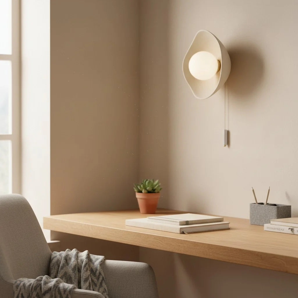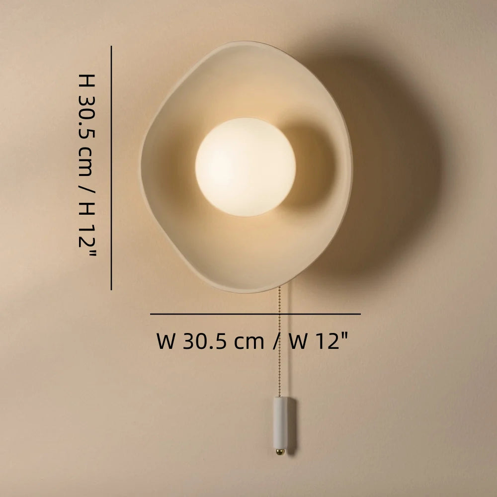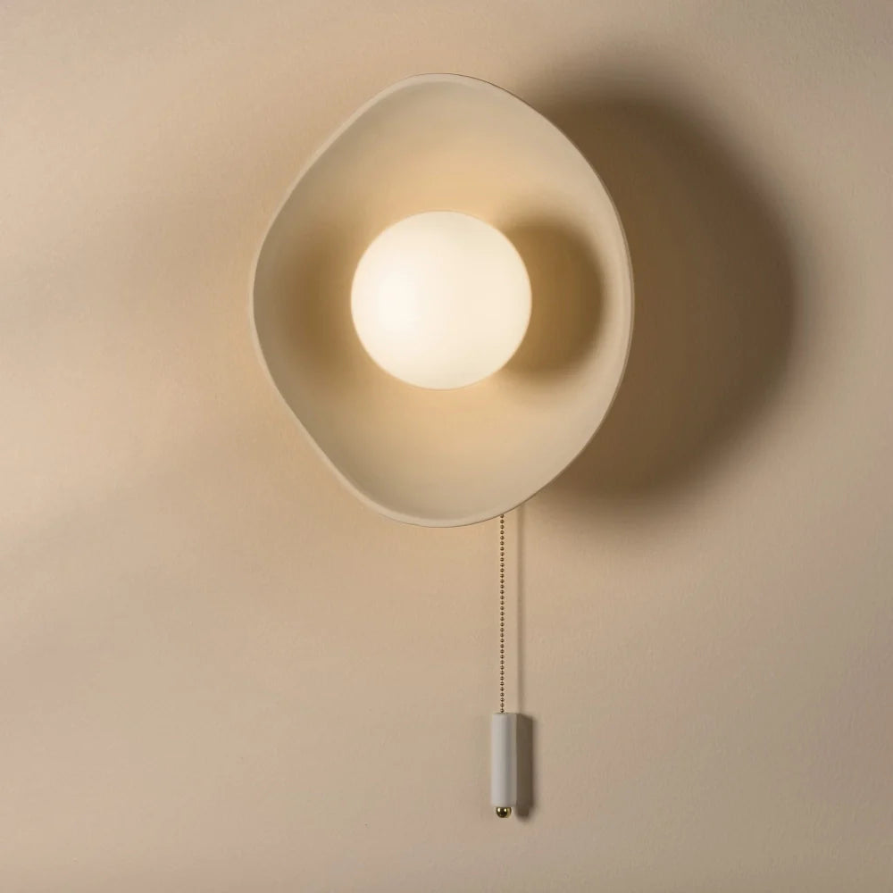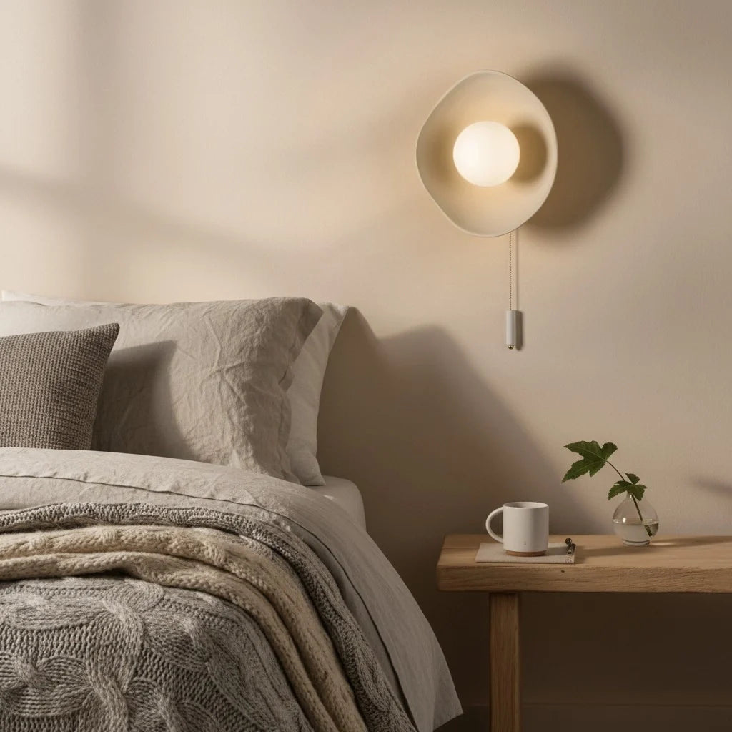 This wall sconce features a curved ceramic shade, globe bulb, and pull-chain switch, casting soft ambient light. Ideal for bedrooms or entryways.