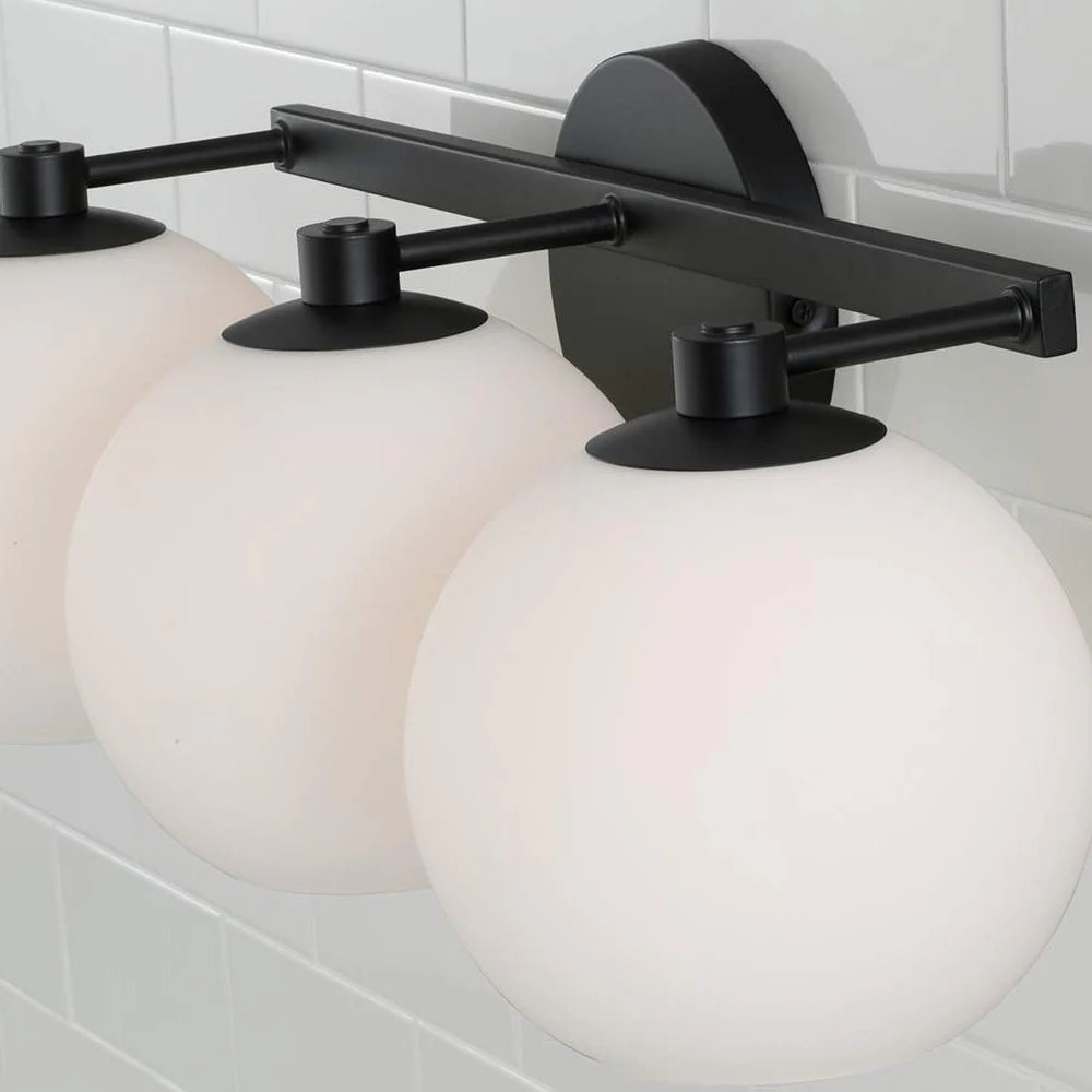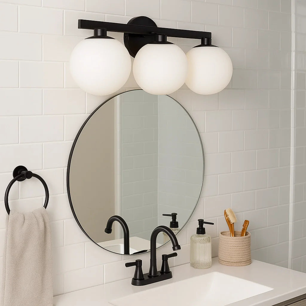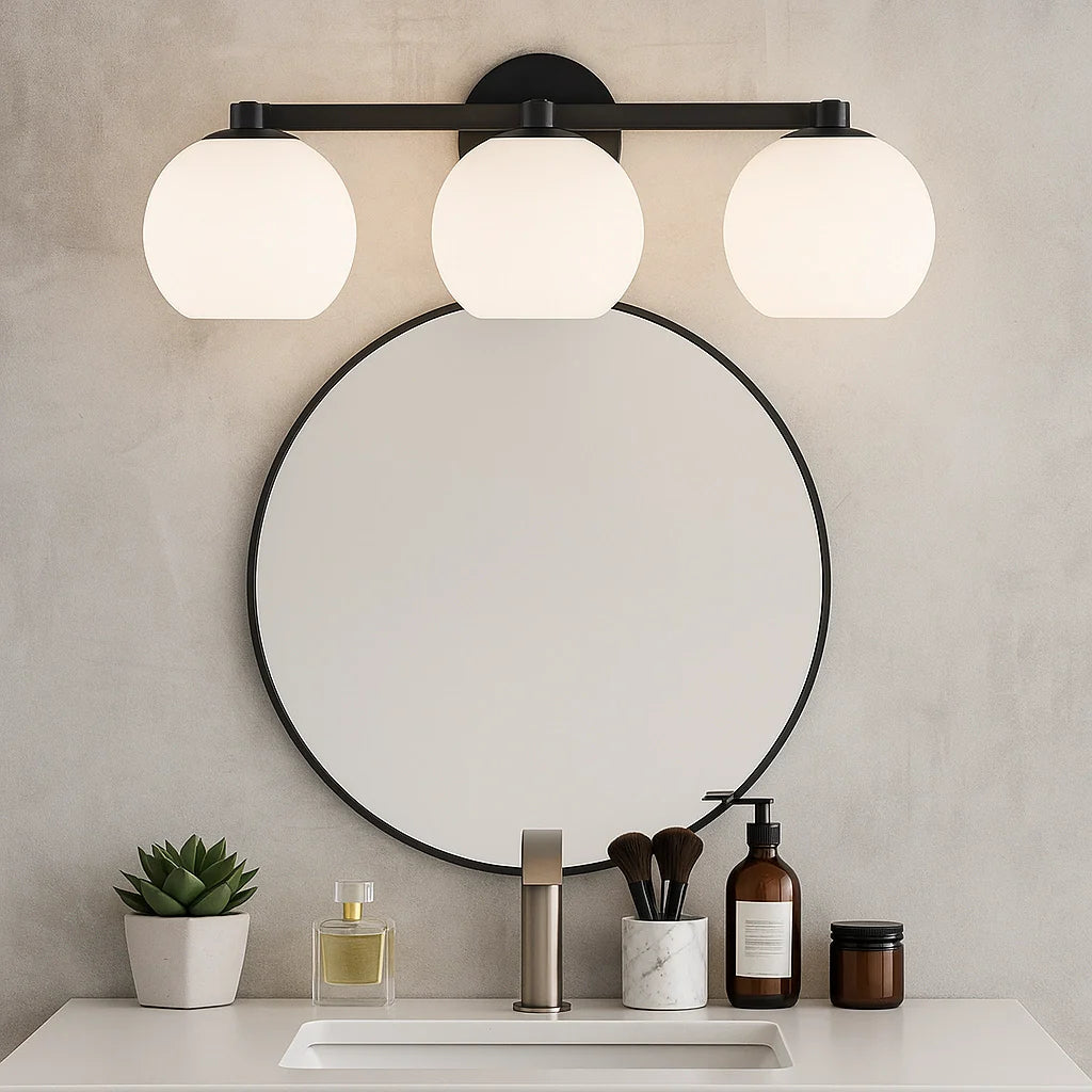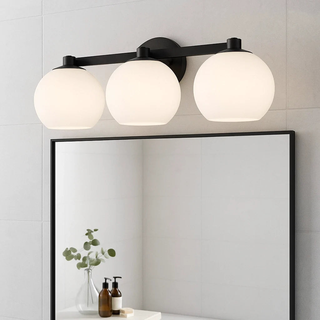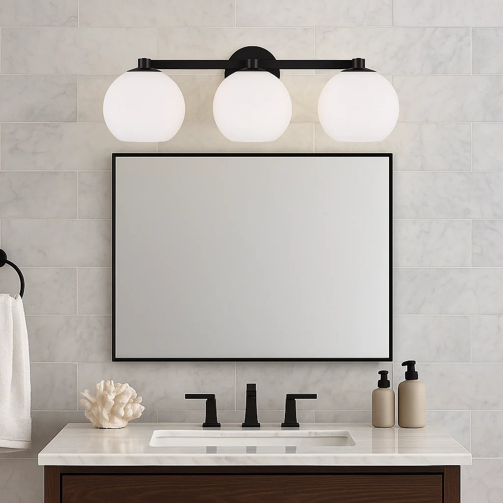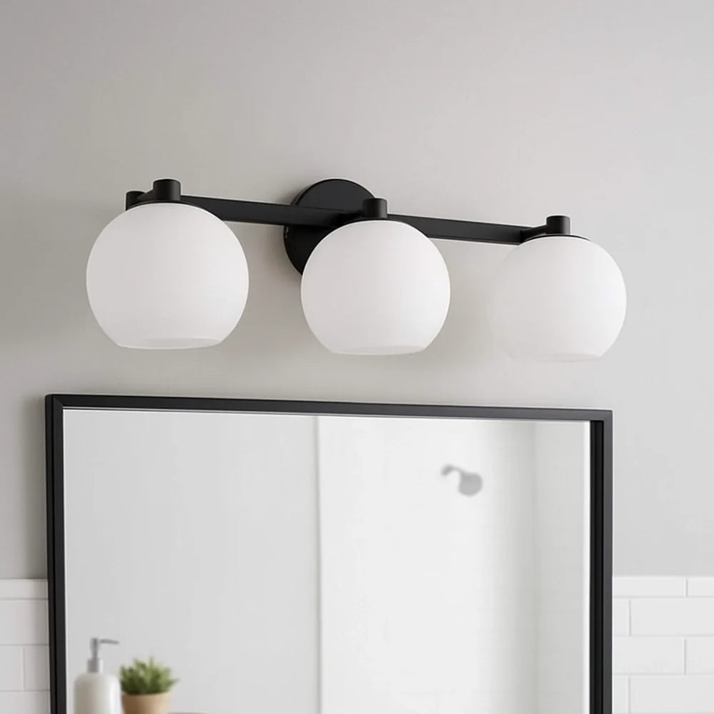 The Lucas Triple White Globe Wall Lamp features three white glass globes mounted on sleek black metal arms. It emits a soft, ambient light and is perfect for bathrooms, vanities, or living spaces.