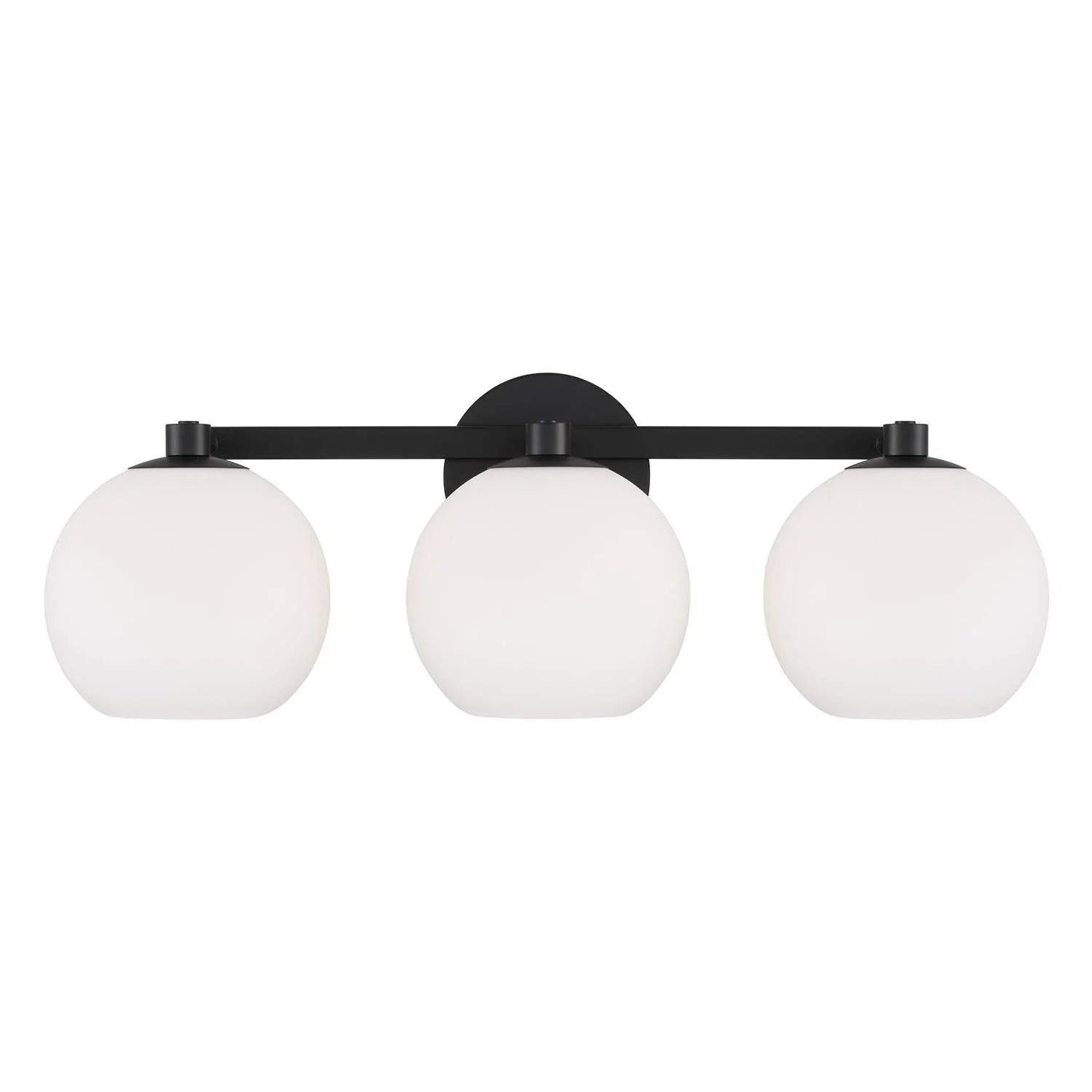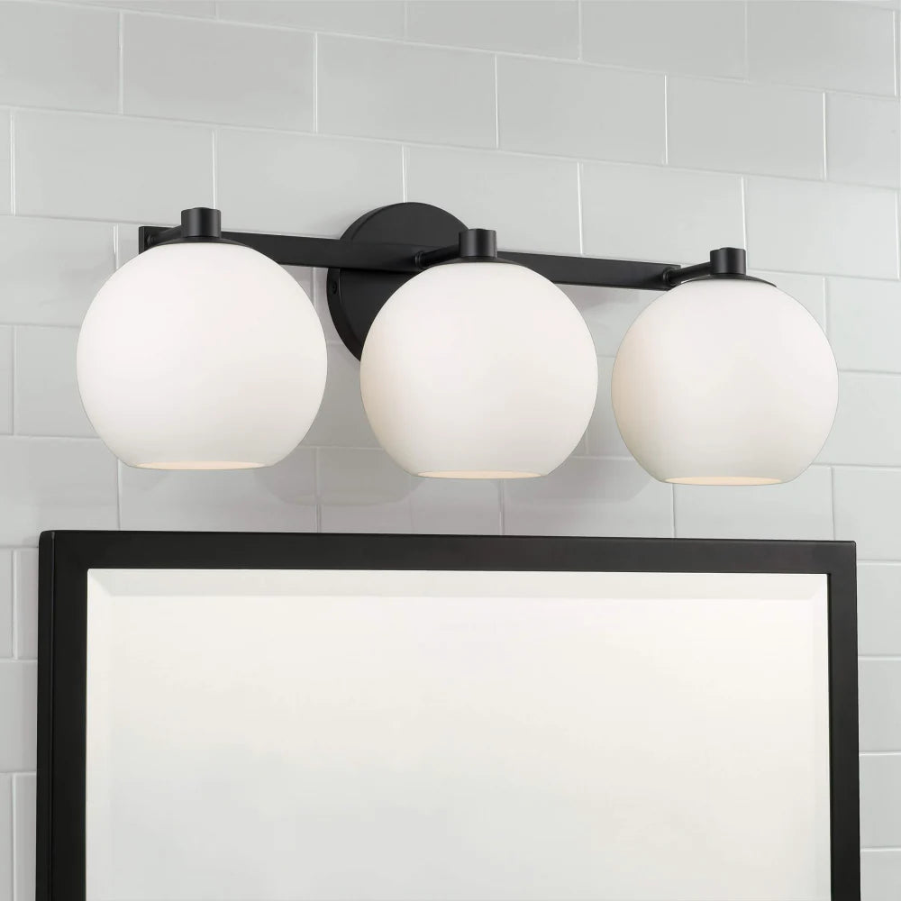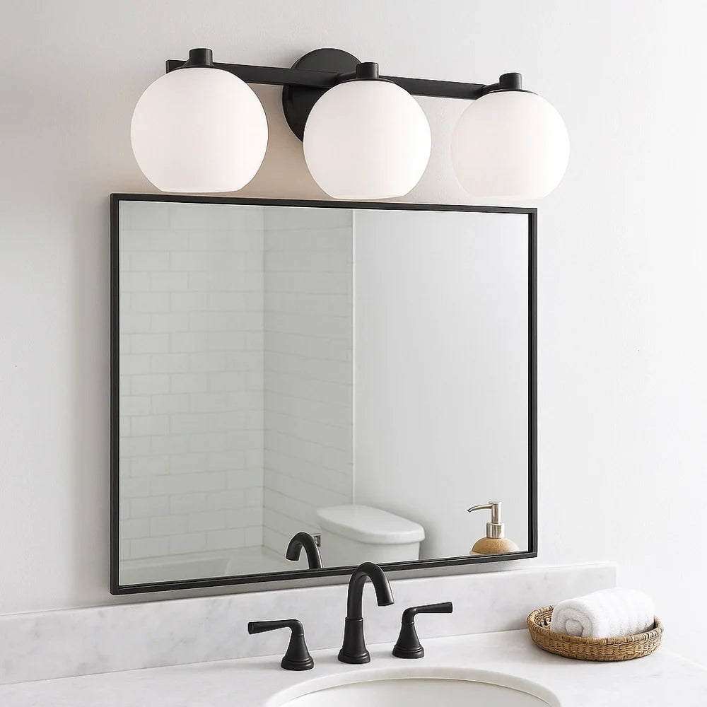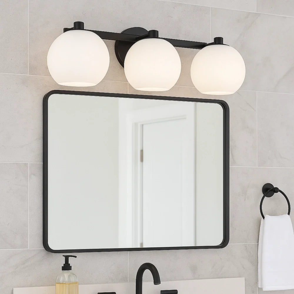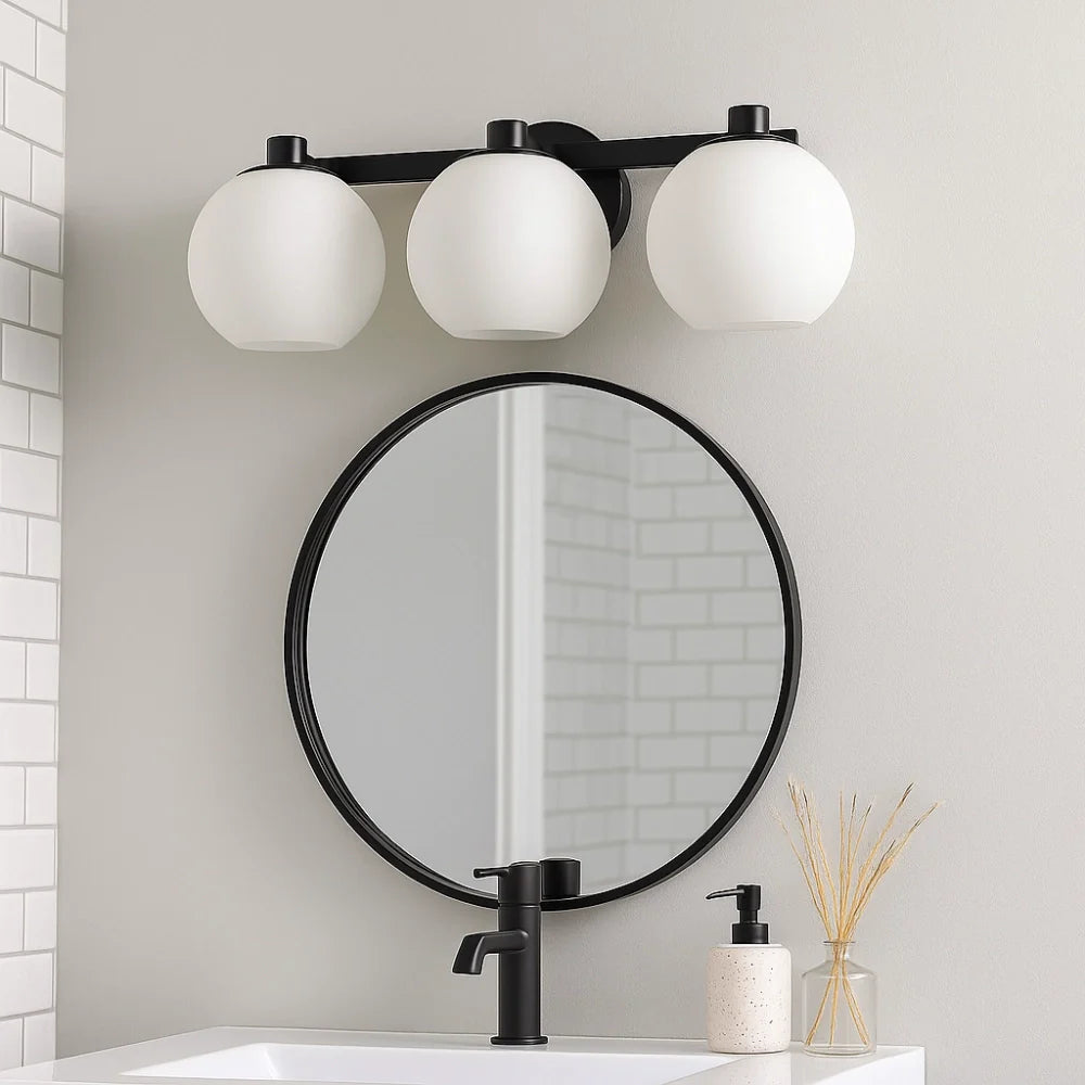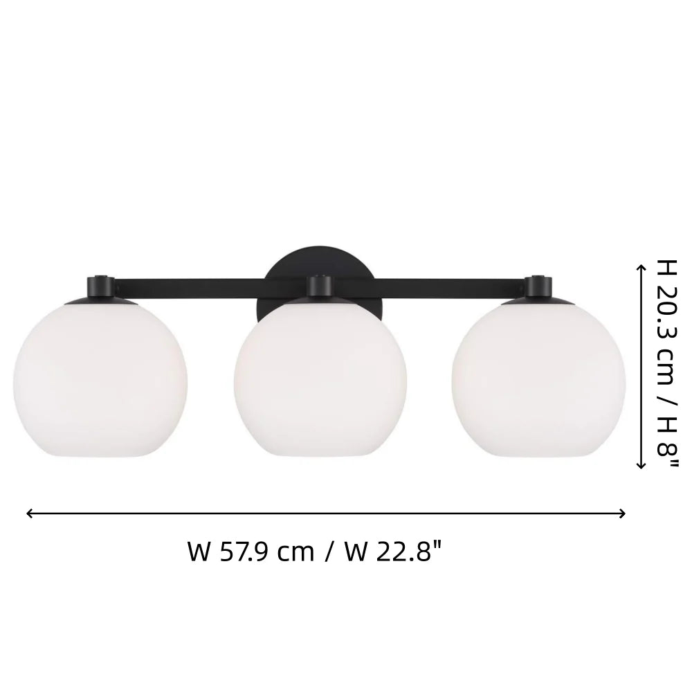 The Lucas Triple White Globe Wall Lamp features three white glass globes mounted on sleek black metal arms. It emits a soft, ambient light and is perfect for bathrooms, vanities, or living spaces.