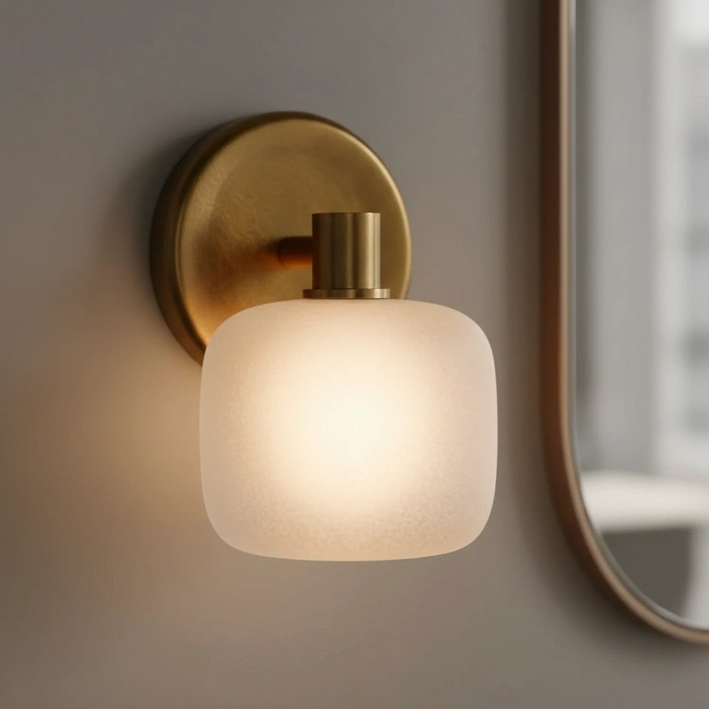 The Nomos Modern Cylinder Brass Frosted Glass Wall Sconce blends sleek brass craftsmanship with a softly frosted glass shade. Its clean cylindrical form casts a warm, diffused glow, making it a refined choice for hallways, bedrooms, or bathrooms.