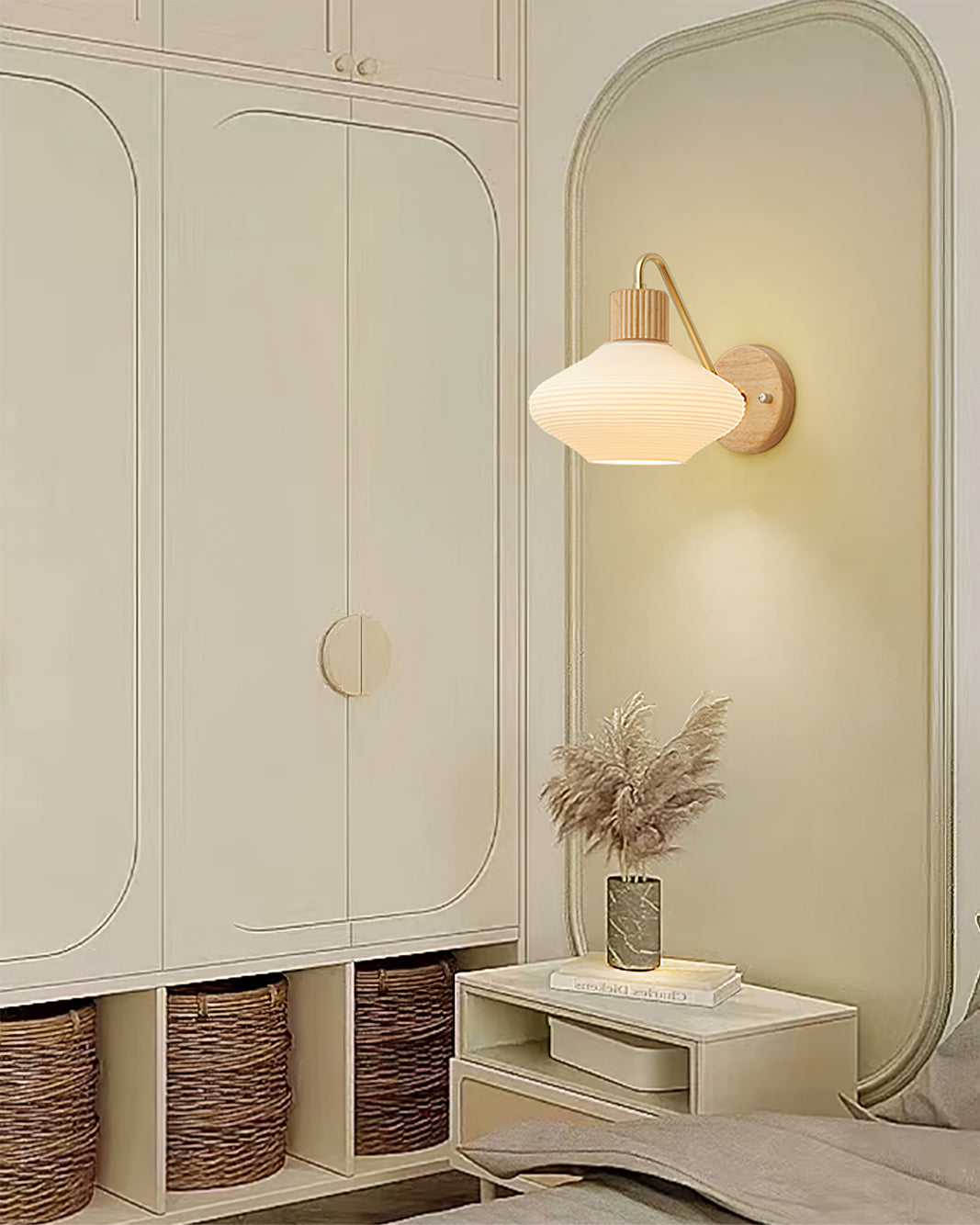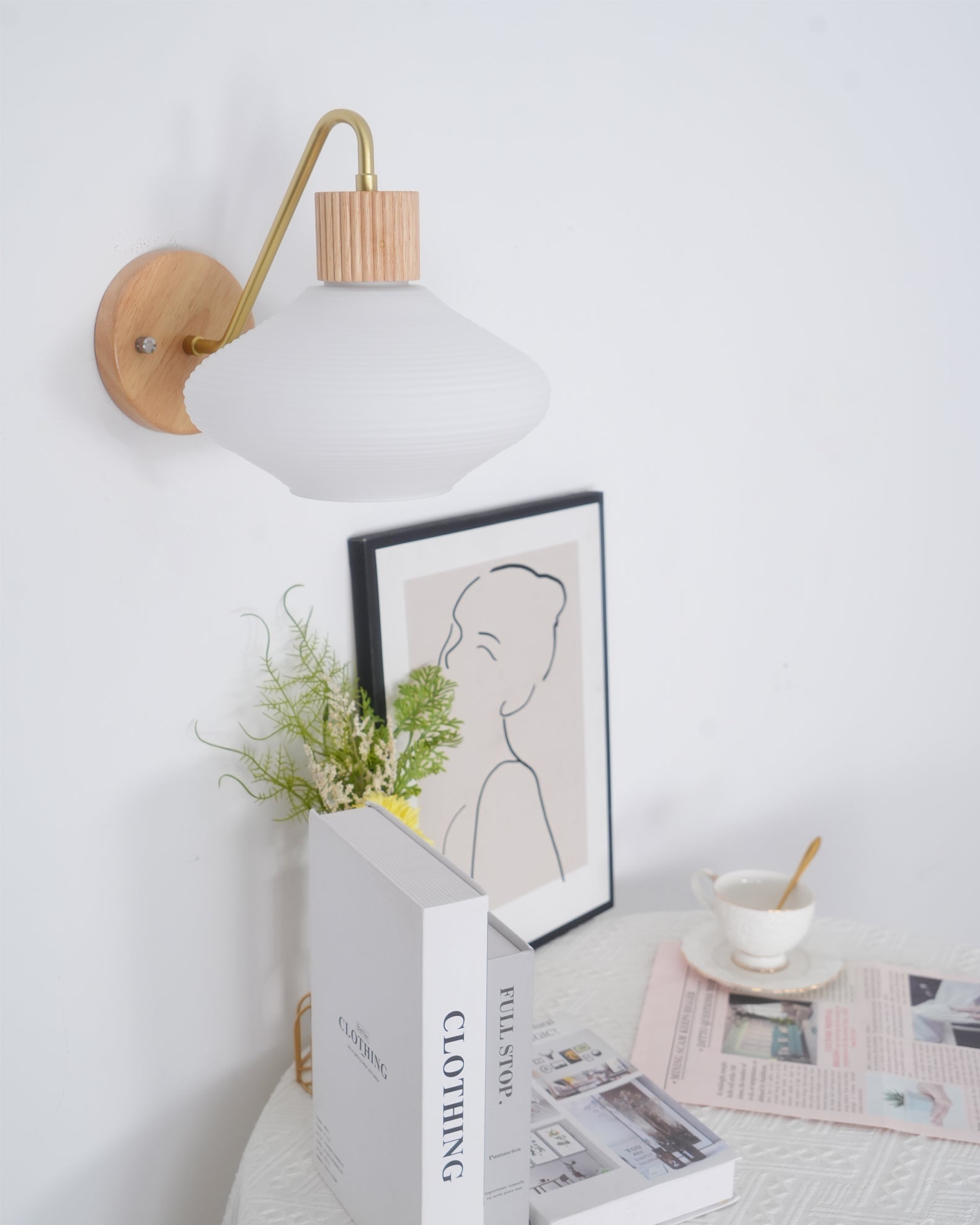 Nordic minimalist wood wall lamp, high light white  glass lampshade bedside reading lamps, which can complement the decoration of the space and add more personality to your home decoration.