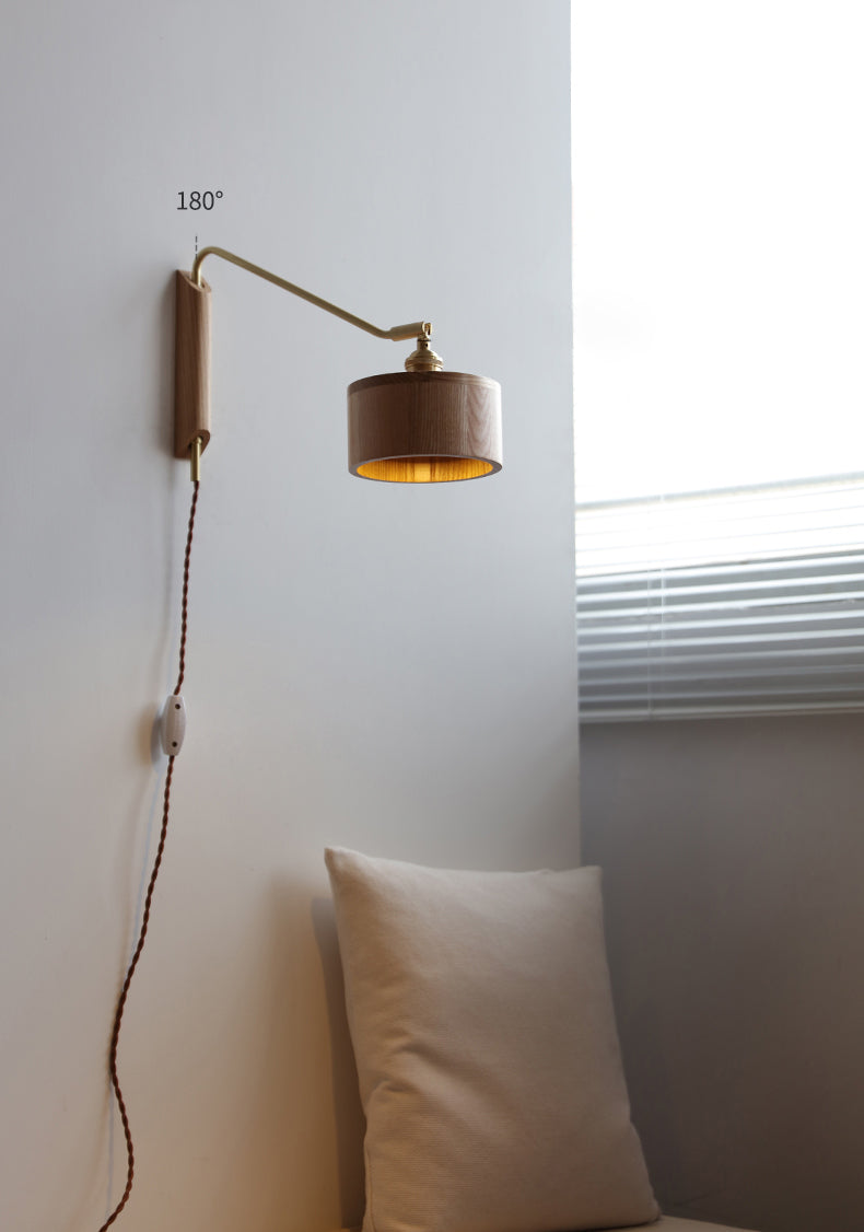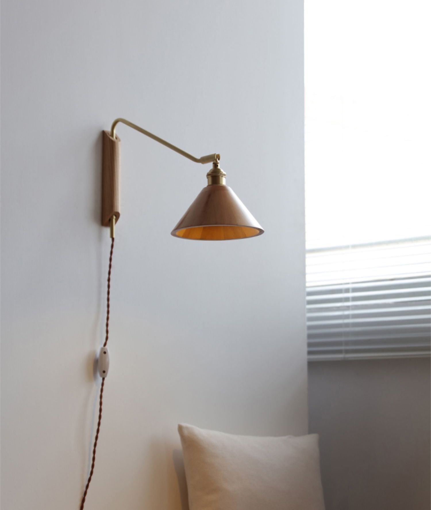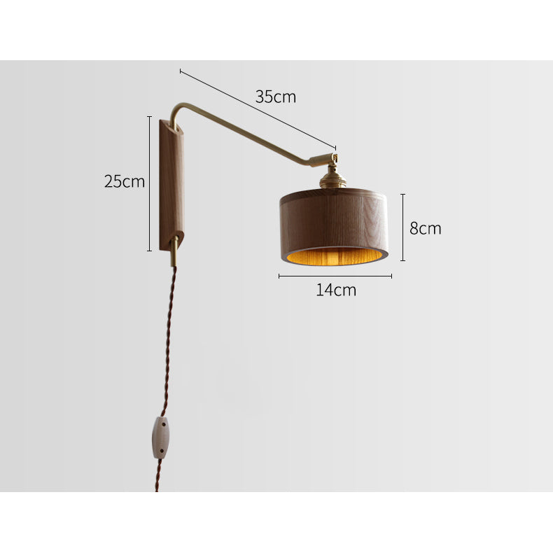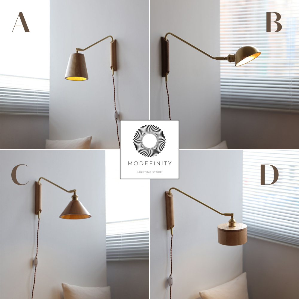 Add a touch of class to your decor with this swing arm plug-in wall light inspired by the timeless aesthetic of sleek metal and wood, featuring a light fixture made from natural wood, brass hardware, and a brass or wood lampshade that adds a wonderful aesthetic to any space.